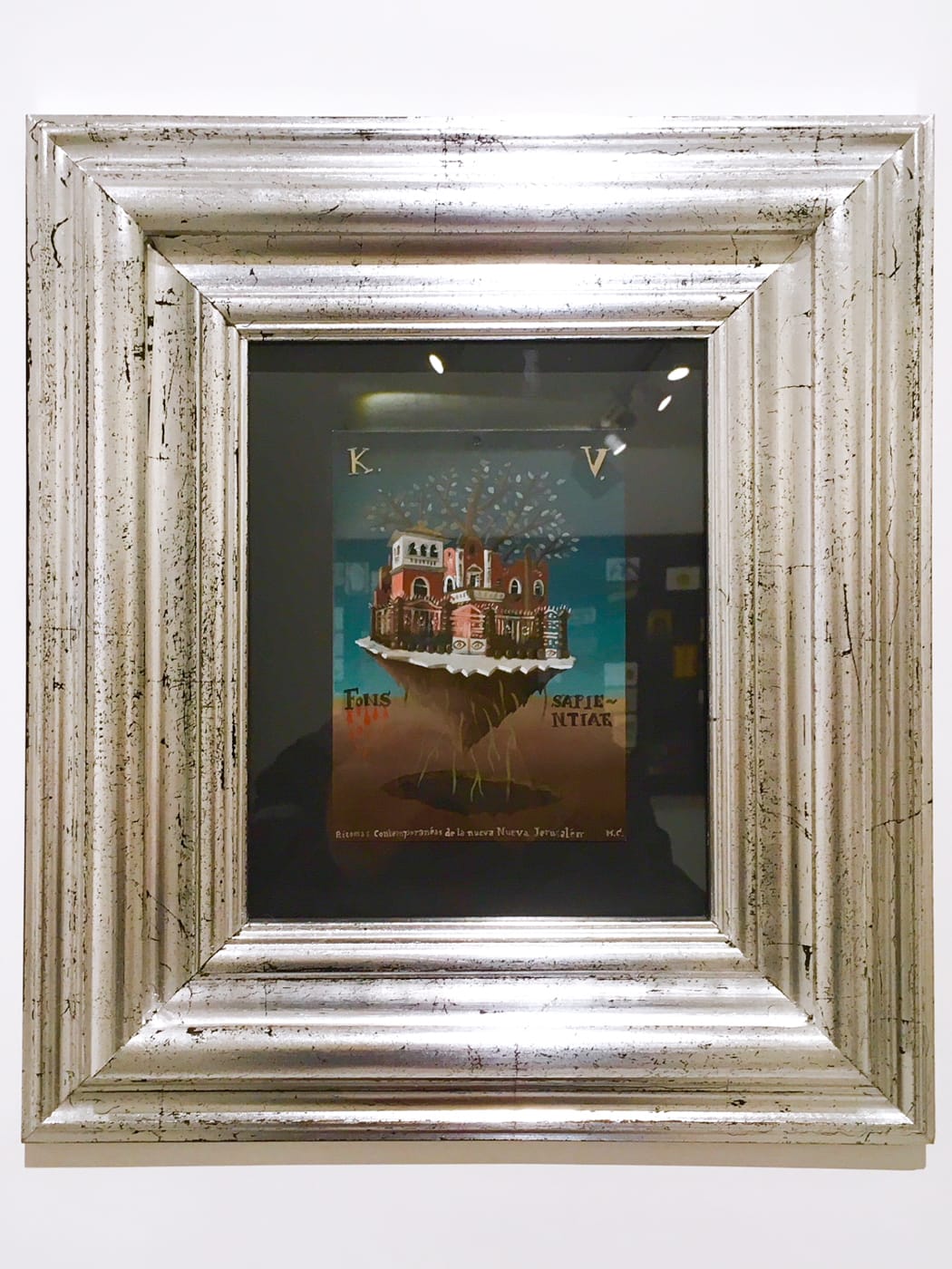 The presence of big canonical names gives legitimacy and weight to the up-and-coming artists in the show, especially those young local artists working with Arquetopia. Cristóbal Sarro, for example, meticulously renders animals and their skeletons in layers of paper that peel off revealing the bones beneath the fur. Sarro’s technique is perhaps most fitting for street art, but here his work hangs near a small sculpture by Raymundo Sesma, an established Mexican artist known for what he calls social architecture—large-scale painted interventions on buildings. A small work, “Contemporary Rhizomes of the New Jerusalem” (2016), in the style of Spanish colonial ex-voto paintings by former Arquetopia resident Matthew Couper also connects the past to the present.