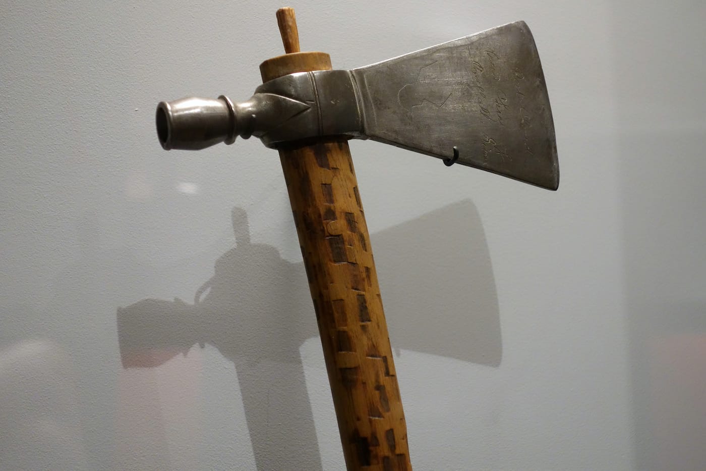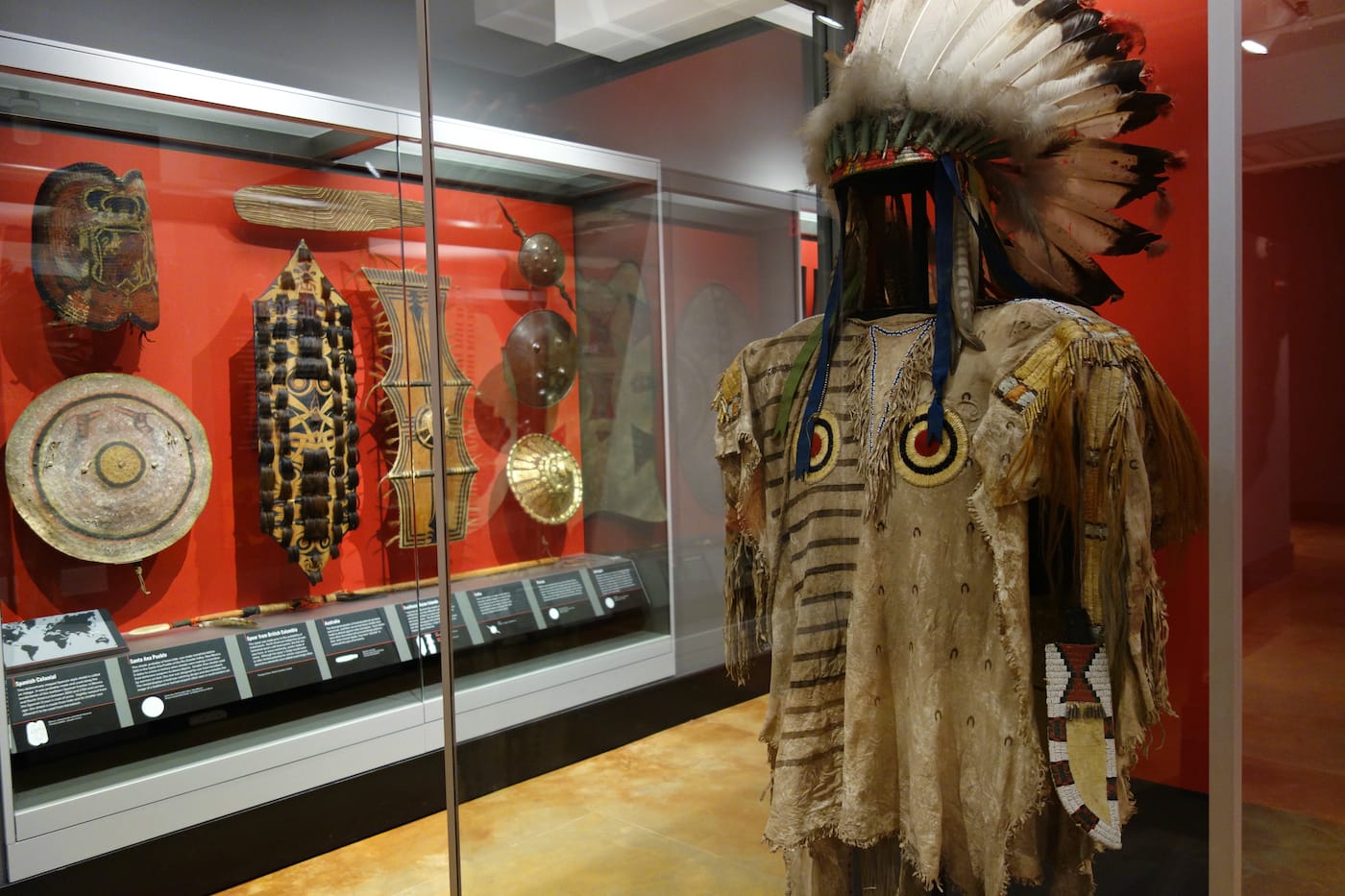 As the Peabody is among the world’s oldest anthropology museums, the pieces on view are impressively global, coming from every continent aside from Antarctica (which has yet to have its first war). It’s also interesting to see these objects — many, like the Tlingit armor, collected in the 19th century when the colonizing cultures were amassing the very weapons they were rendering obsolete — reframed in a wider consideration of human ingenuity in the face and service of violence. There are only a couple of items related to peace in the exhibition, one being a wampum belt from Northeastern Ontario, the other a pipe-tomahawk that is believed to have belonged to Red Cloud of the Oglala Lakota. As an indigenous leader in the 19th century, when his people were being relocated onto reservations after battles with the US Army, the shape of the pipe as a bludgeoning weapon seems appropriate to its complex place in time.