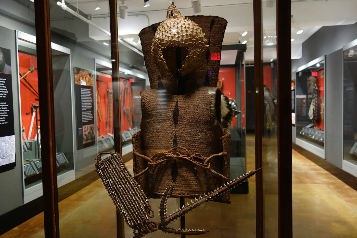 Others were more utilitarian. For instance, Western Australian wooden shields were grooved with zig-zagging patterns to disorient their foes, not dissimilar from the later “dazzle” camouflage on World War I ships. One of the exhibition’s most intriguing displays features body armor from the Kiribati on the southern Pacific Gilbert Islands. The armor is formed from coconut fiber, and accompanied by a spiky helmet made from a whole puffer fish and a sword inset with shark teeth, an intimidating example of transforming the natural world around you into an outfit of war.