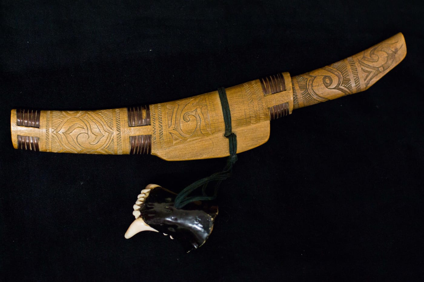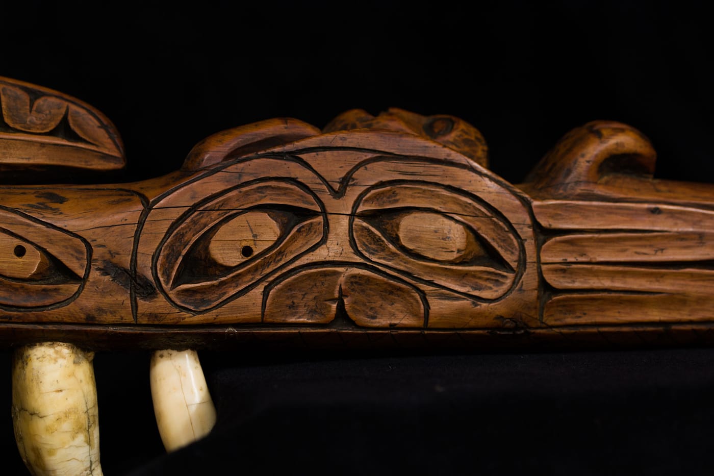 Arts of War: Artistry in Weapons across Cultures features the Tlingit armor among 170 objects from the Peabody’s collections. Curated by Steven LeBlanc, an archaeologist and former director of collections at the Peabody, the exhibition explores centuries of weapons that double as artistic objects. Some of the decorative traditions represented here were developed for aesthetic purposes, such as the gemstones embedded in a Balinese blade or prehistoric Nazca spear-thrower decorated with a carved cat.