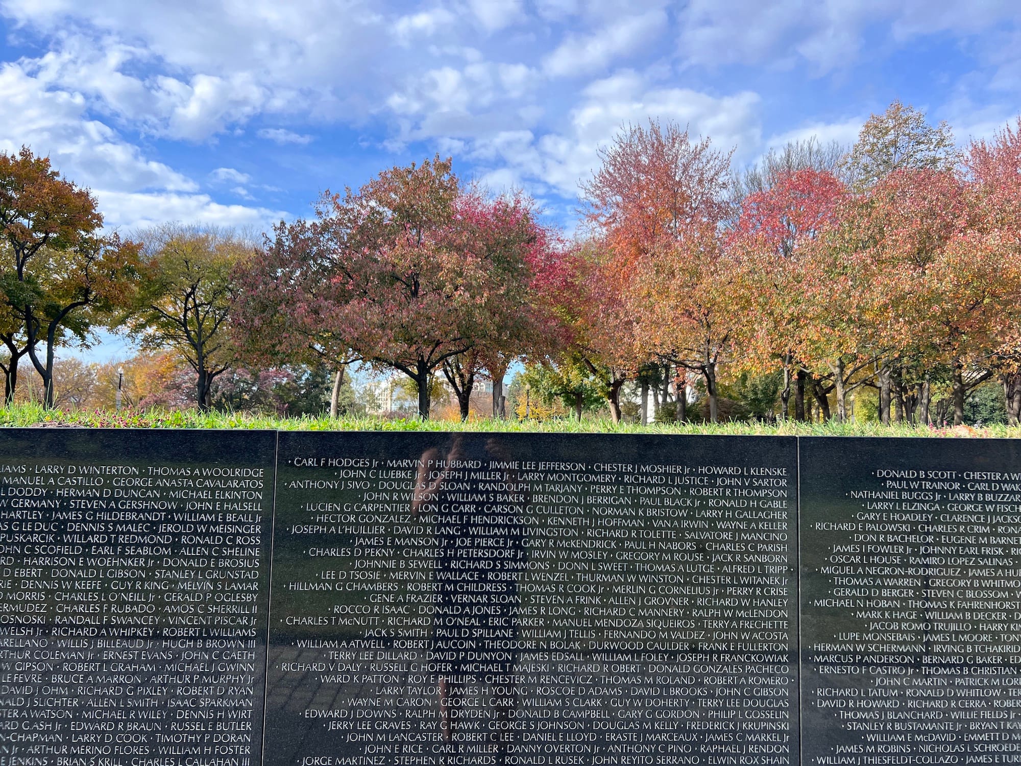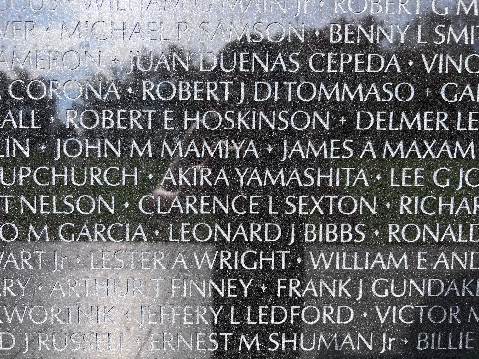From afar, a trick of the light makes the Vietnam Veterans Memorial designed by Maya Lin look like a small body of water, an oasis in a desert of grass. Then vertical lines split that darkness, and it flattens into slabs of grayish stone. And then you realize that that gray is not surface but heart: chiseled names gouged out from black granite, the names of so many dead.