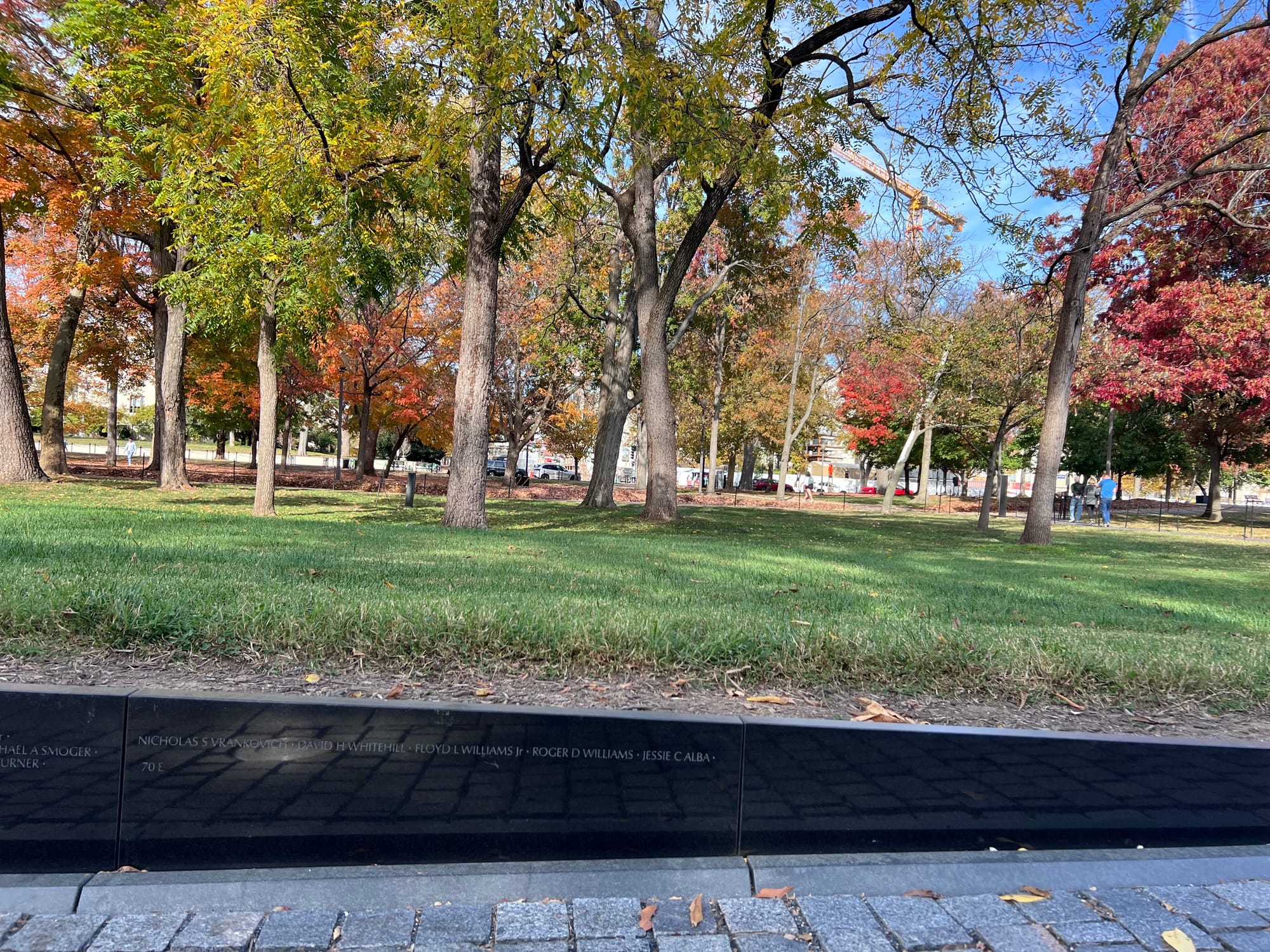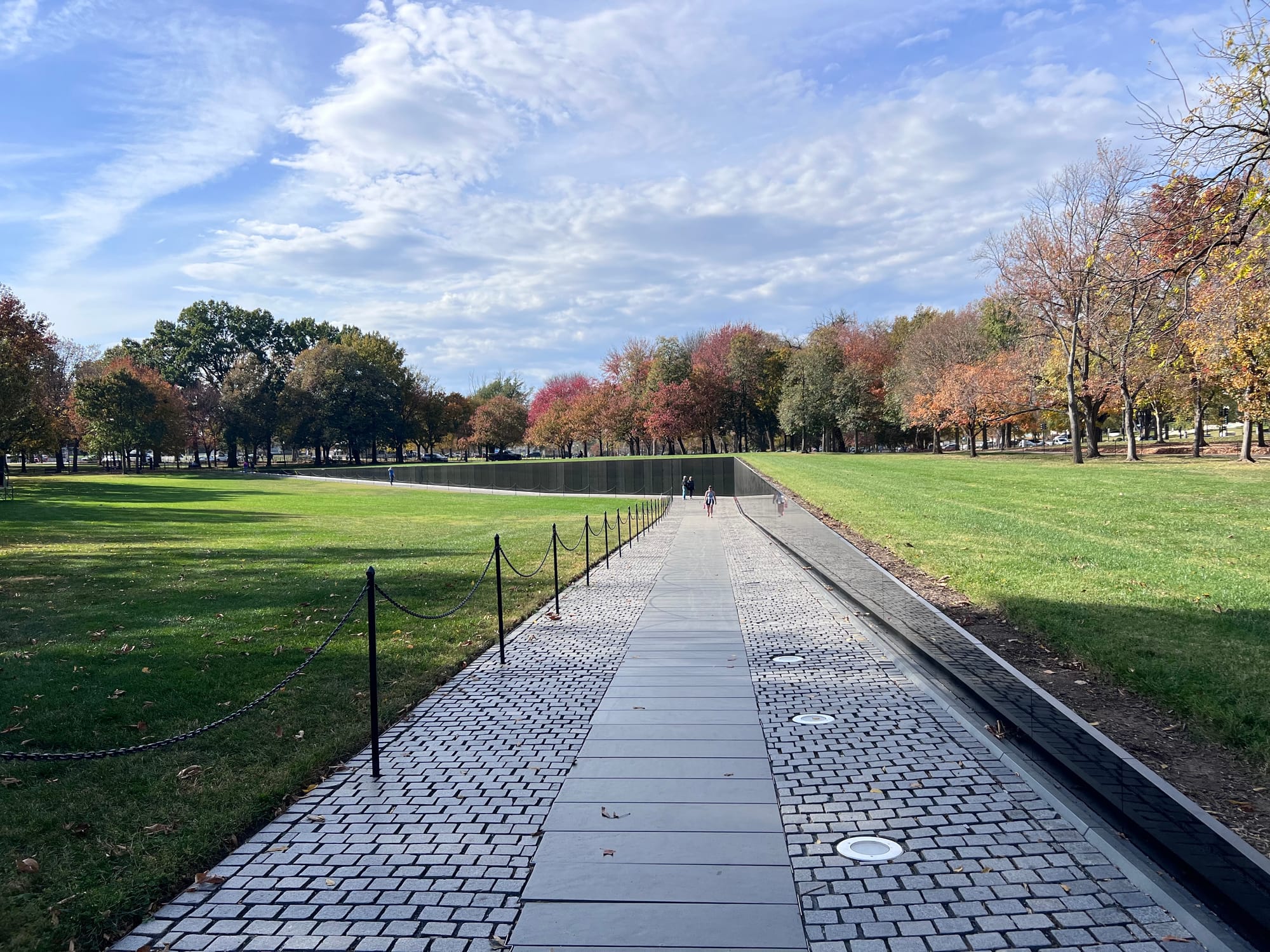 It starts off barely there — the stanchions that keep you off the grass tower over it. But keep walking, and the names start — just one line etched upon a foot (~30 cm) of stone. Then three. Then six. Soon it feels like you’re sliding down the smooth stone of the walkway and the monument is opening up all around you, as if your very movement is slicing through the fascia of the earth to create this dark gash, this wound. It’s not long before it, instead, towers over you.
