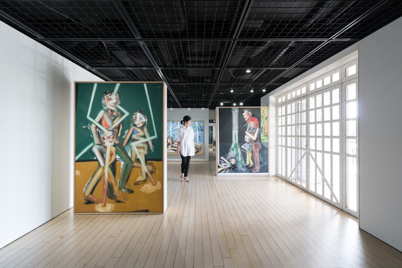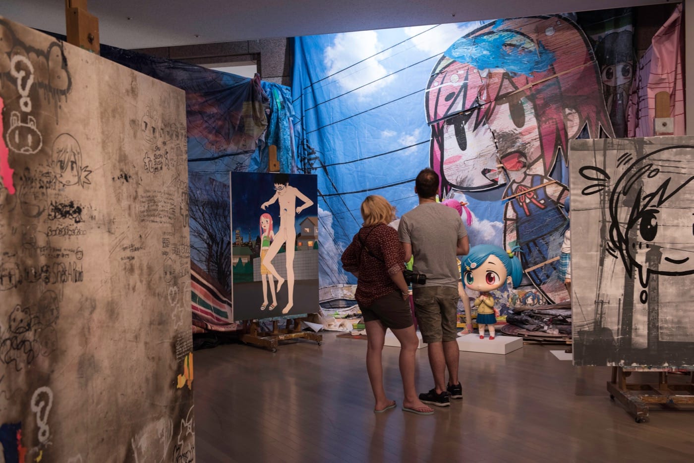 The most contentious work that pries open past atrocities and unveils another explosive matter is Yukinori Yanagi’s updated “Project God-zilla,” (2017). Shown in the dark, musty basement of the Memorial Hall, Yanagi’s post apocalyptic landscape and accompanying lists of innumerable atomic bombs tested in the 1950’s and ‘60s off various islands in the Pacific Ocean by the US, Britain, and France is chilling — especially in light of North Korea’s recent firing of a ballistic missile over Japan. A different kind of urgency emanates from Mr., a Japanese artist based in Tokyo. His works consists of electric installations of manga-inspired depictions of young Japanese girls and sexual imagery. Social issues of angst, isolation, and repression in Mr.’s work are just as apparent in Konishi Toshiyuki’s bleak landscapes of disconnected people in his collection of oil paintings, titled “A Group of Solitude,” (2017).