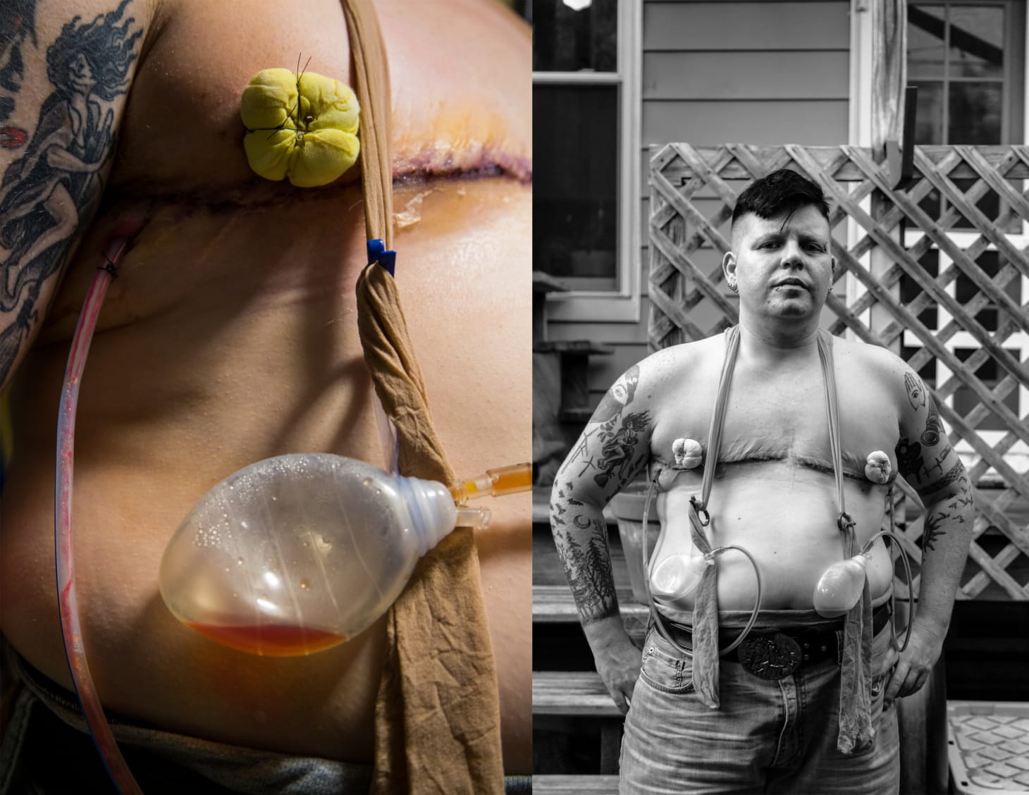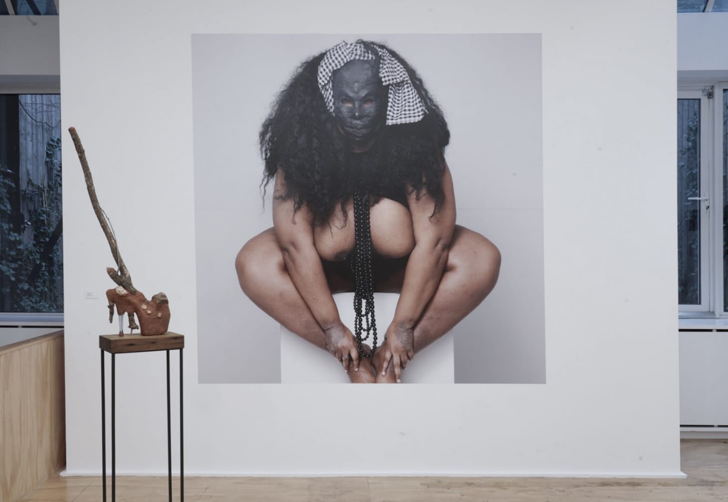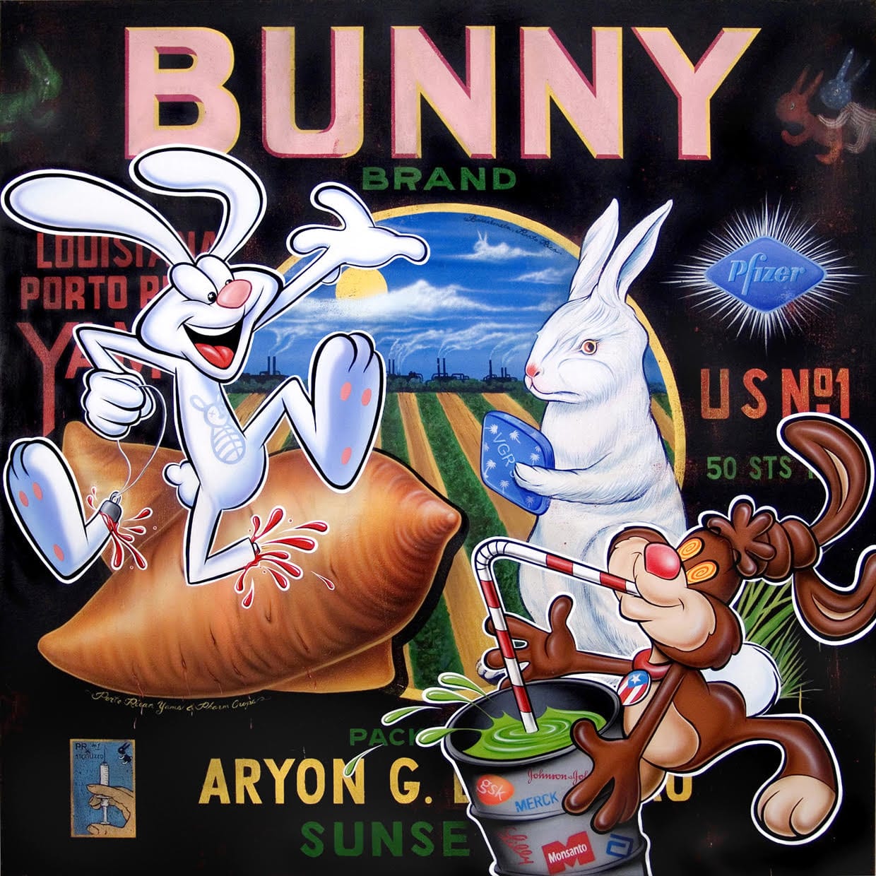 Other works in the show illuminate parts of the picture that are given less attention within the mainstream abortion debate. Reinterpreting a 1930’s label from Puerto Rican produce sold in the U.S., Miguel Luciano’s painting “Barceloneta Bunnies” (2007), for example, addresses our country’s history of forced sterilization by referencing a Puerto Rico town targeted by such programs as part of the island’s population control policy. Elektra KB’s photo series “Queer Alterations for a Post-Nuclear Kin” (2020) is one of several works in the exhibition focusing on queer, trans, and gender nonconforming experiences of reproductive health.