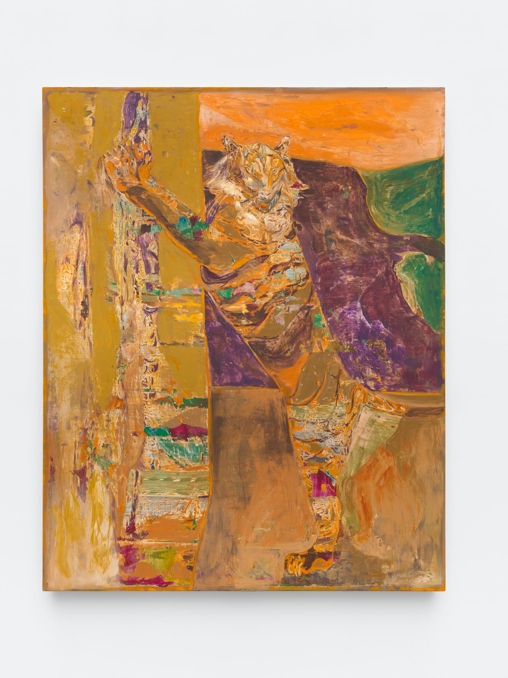 "The Hunger Artist” (2024) was the first of Joshua Hagler’s paintings that I saw in his debut New York solo exhibition, Nihil III/Already Paradise, at Nicodim Gallery. Impressive in scale, abraded by an open-ended process of layering and scraping, the largely tan, orange, and purple painting depicts a tiger standing on its hind legs, scratching the wall of its enclosure. I learned later from Hagler’s Instagram account that he had previously installed the painting on the distressed walls of the abandoned Cedarvale School in New Mexico.