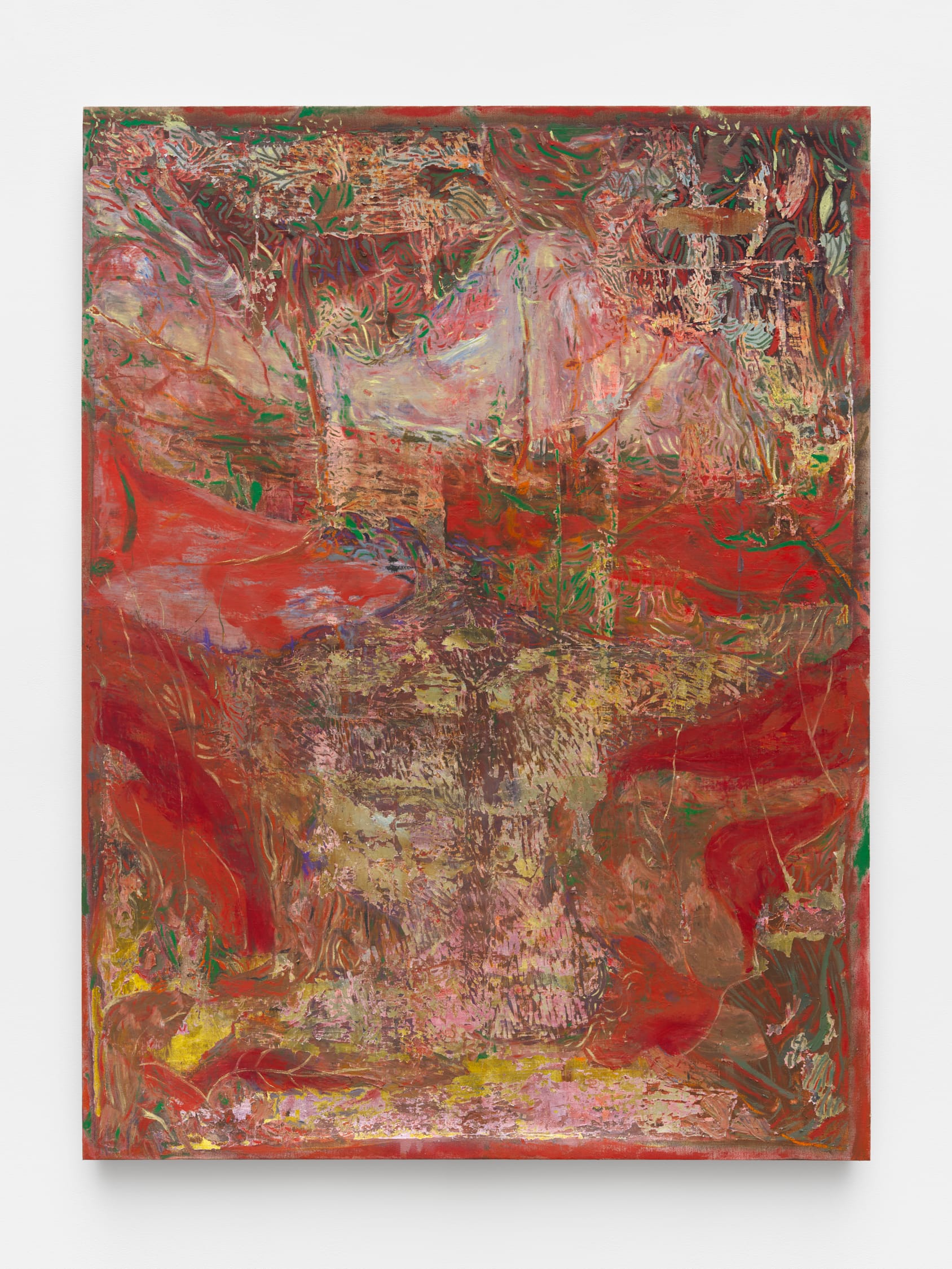 The triptych depicts what looks like a nude man, either leaning against a rock or standing, pointing at the night sky, which is framed by twin buttes. In the middle of the sky floats a lunar eclipse. With their worked surfaces, the different colored, interlocking planes and shapes become a visual puzzle. In the foreground, a ghostly white shape with tints of blue, green, and violet stretches across the triptych, hovering between figural form and geological accretion. I was reminded that when Antonin Artaud entered the land of the Indigenous Tarahumara people in Mexico, he saw a mountainous landscape marked by what he understood as the indecipherable imprints of higher spirits.