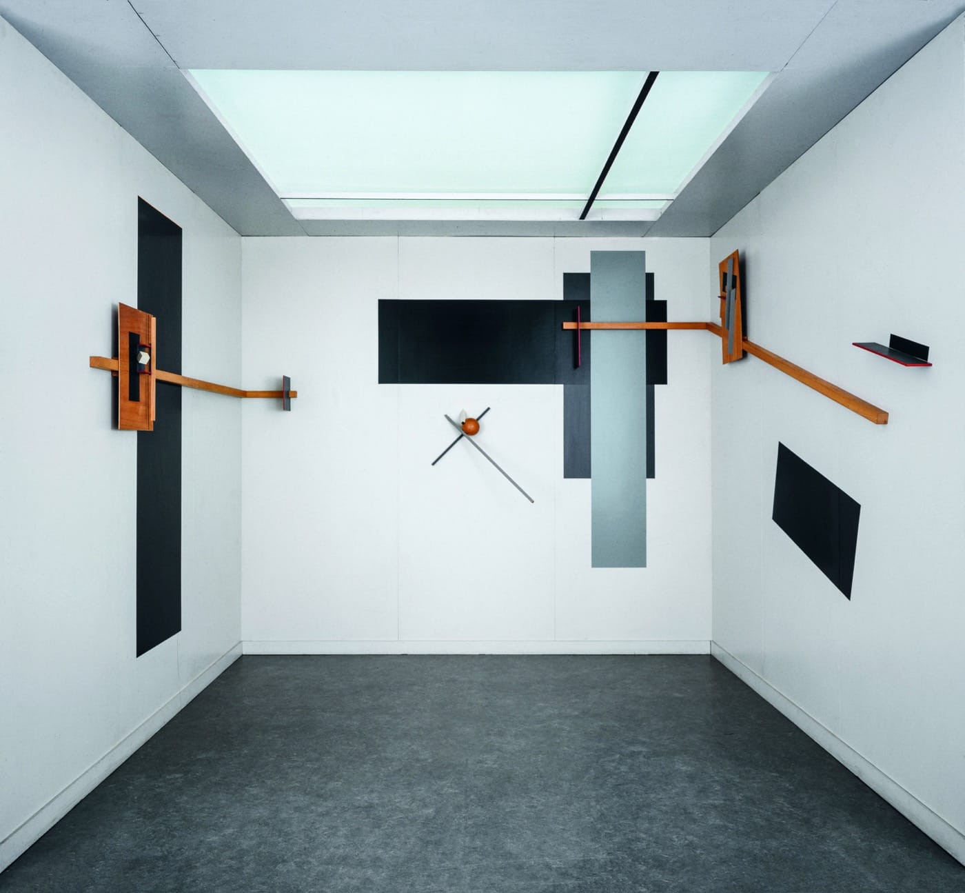 Among other things, the Prouns set a precedent that kinetic artists would continue to push and develop throughout the second half of the 20th century. Although the exhibition doesn’t acknowledge the importance of Lissitzky’s legacy to the post-WWII Parisian milieu, it does present another example of the artist’s incredible foresight: a reconstruction of the “PROUNENRAUM” or “Proun room” (1923). First presented at the Grosse Berliner Kunstausstellung (Grand Berlin Art Exhibition) in 1923, the “Proun room” applies the spatial lessons of the two-dimensional version to an actual architectural space as a means of deconstructing the stable perception of that space. Thus, the “Proun room” represents an important evolutionary step towards installation art and indeed is one of the first examples of an “environmental” artwork in the 20th century. Unlike the 1923 Berlin original, a thin thread of elastic cord prevents viewers at the Pompidou show from being able to physically enter into the space — a huge disappointment.