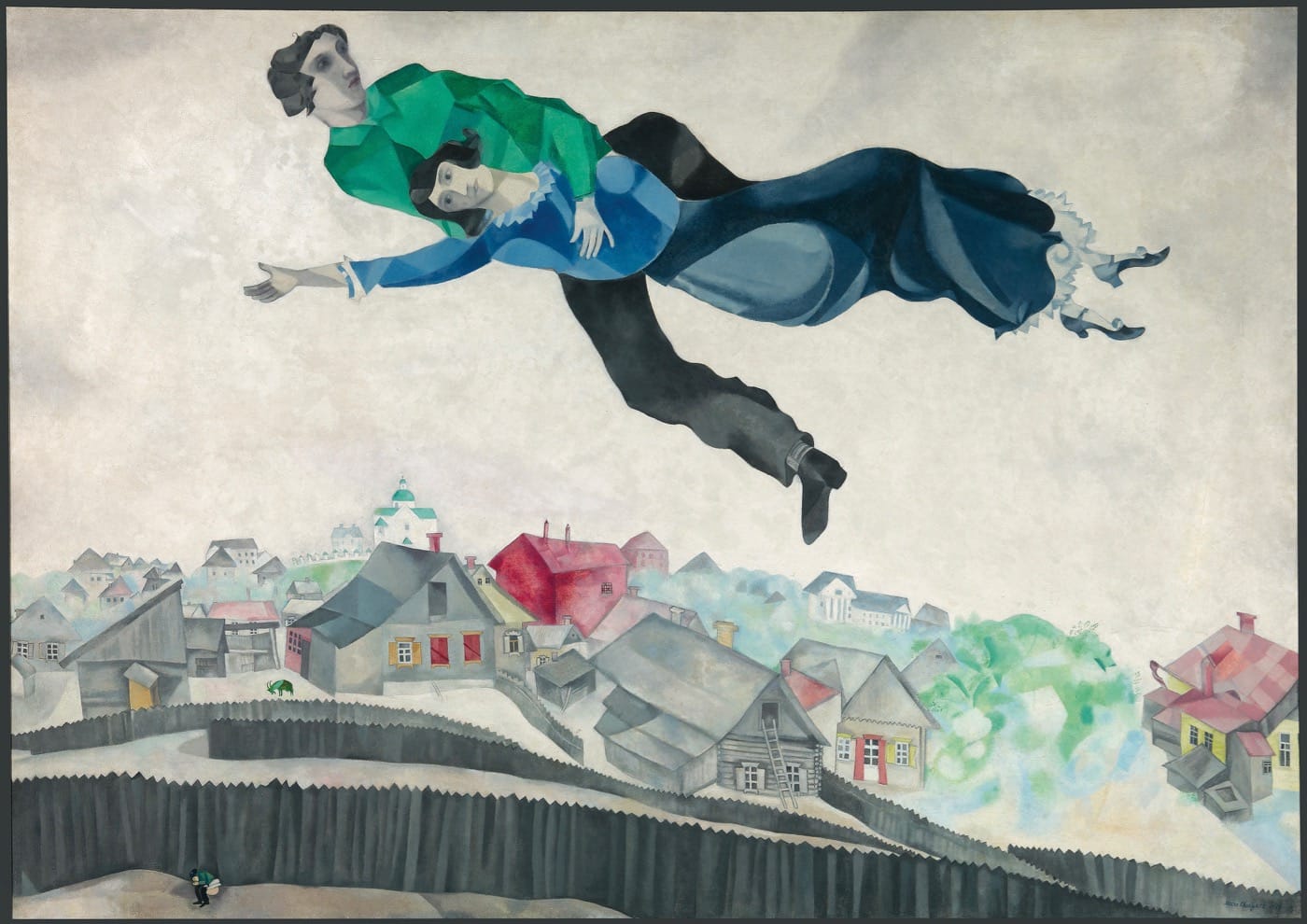 Chagall had witnessed first hand the outbreak of the Bolshevik Revolution from the window of his apartment in Petrograd during what was supposed to have been a brief return to his home country. The trip was initially conceived to be just long enough to collect some possessions and bring his new wife, Bella Rosenfeld, back with him to Paris, where he had been working since 1910. The eruption of World War I kept the newlyweds in Russia, but it was the immediate aftermath of the Revolution that convinced them to stay. New Soviet laws outlawing religious discrimination granted Chagall, born Moishe Zakharovich Shagal to a Hasidic Jewish family, full rights and citizenship for the first time in his life.