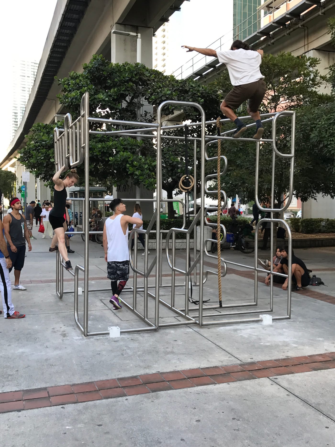 In commemoration of the upcoming park, a ceremony at Brickell Station featured works by four local artists, currently still on display. It’s a large effort, commissioned by Miami-Dade County Department of Cultural Affairs’ Art in Public Places; Miami-Dade County Parks, Recreation, and Open Spaces; Friends of the Underline Art Advisory; and Miami-Dade County Transportation and Public Works Department. The installation functions as a precursor to the Underline’s rotating arts program; each work alludes to the project’s vision of health, movement, and greener space. Nicolas Lobo’s “Brutal Workout” offers a jungle gym resembling the handrails of the Metorail stations, while Naomi Fisher’s “#PUZZLED” consists of mirrored shapes with functional ballet barres, activated by ballerinas, and is open to the public. With “Metro Flower Power,” Bhakti Baxter creates a series of truly sublime floral planters for each station, and then there is CICLO, Woodgate’s bilingual broadcast, which will soon be available to listen online.