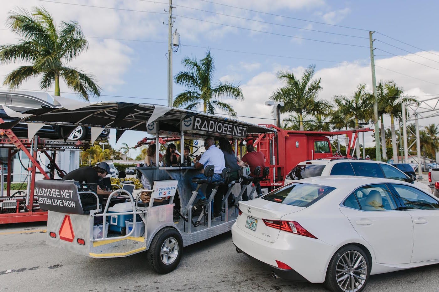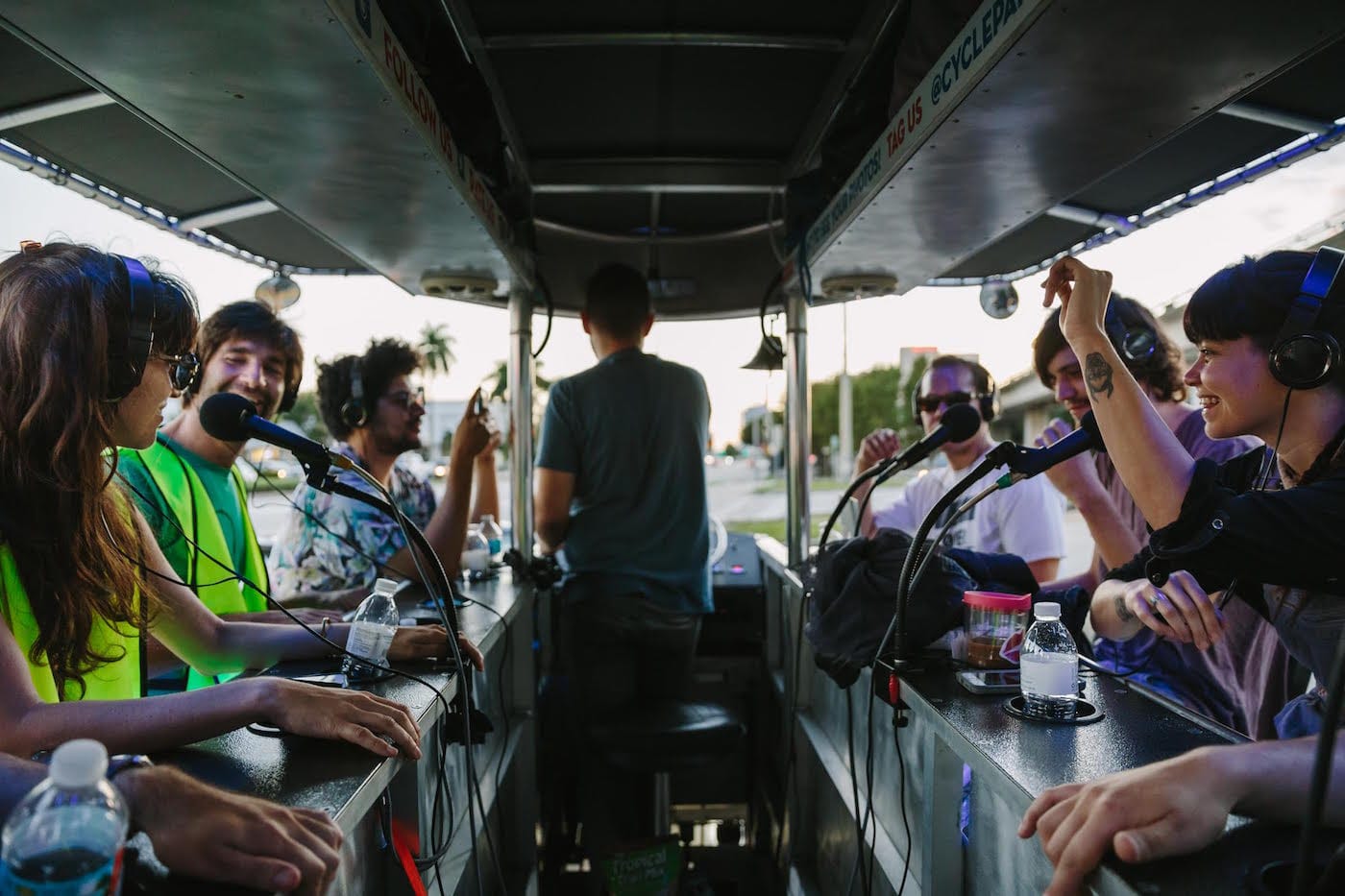 Artist Agustina Woodgate’s Radio Espacio Estacion (RadioEE), a multi-lingual radio station, focuses on mobility, transportation, and movement — the flow of water, the migration of bodies, the pedaling of a bicycle. RadioEE is nomadic itself, having no official headquarters. The CICLO program considers Miami’s upcoming Underline Park and bike path, which will be completed over the next decade. Two weekends ago, Woodgate took to the streets, broadcasting from a motor-powered, 10-person bicycle (the pedaling provided energy to the motor) traveling along the spaces the park is set to occupy and interviewing city officials, architects, and local artists — all pedaling and out of breath — about the nature of development in the city. (The radio was solar-powered.)
