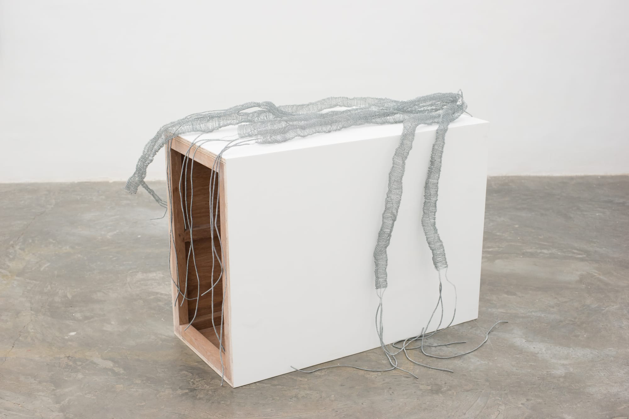 Mitigating this tension, the works in Instinct are hung with steel nails, not hidden, but not eye-catching either. Most of the podiums have at least one facade missing, revealing their inner construction to the viewer. This is conceptually cohesive in its prioritization of process and sense of ongoing construction. However, by drawing attention to the act of display, I ultimately found the unfinished podiums distracting from the mesmerizing wire forms.