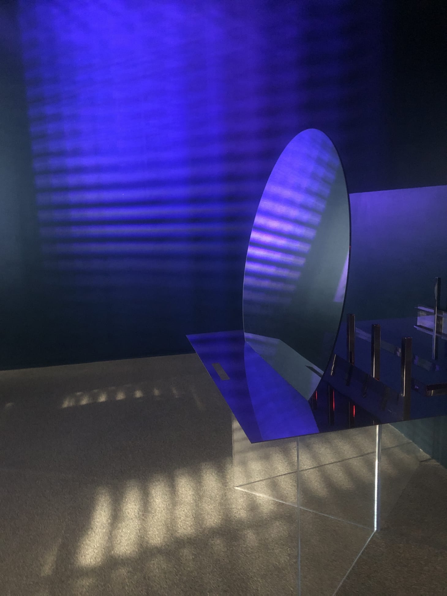 Recreated on the second level is Apartment 50, a fictional location based on Bulgakov’s actual residence. This darkened room is filled with mirrors reflecting hues of purple and blue. In the corner, a reclining figure is fully covered by a waxy black sheet, but for hands holding a book. Even upon closer inspection, it is hard to tell if the figure is inanimate or alive, making the presence all the more uncanny.