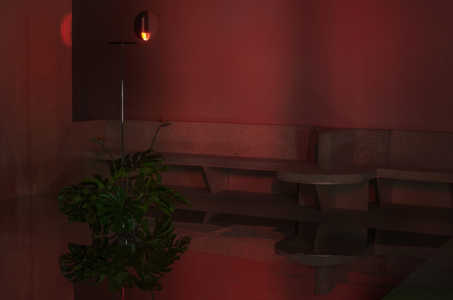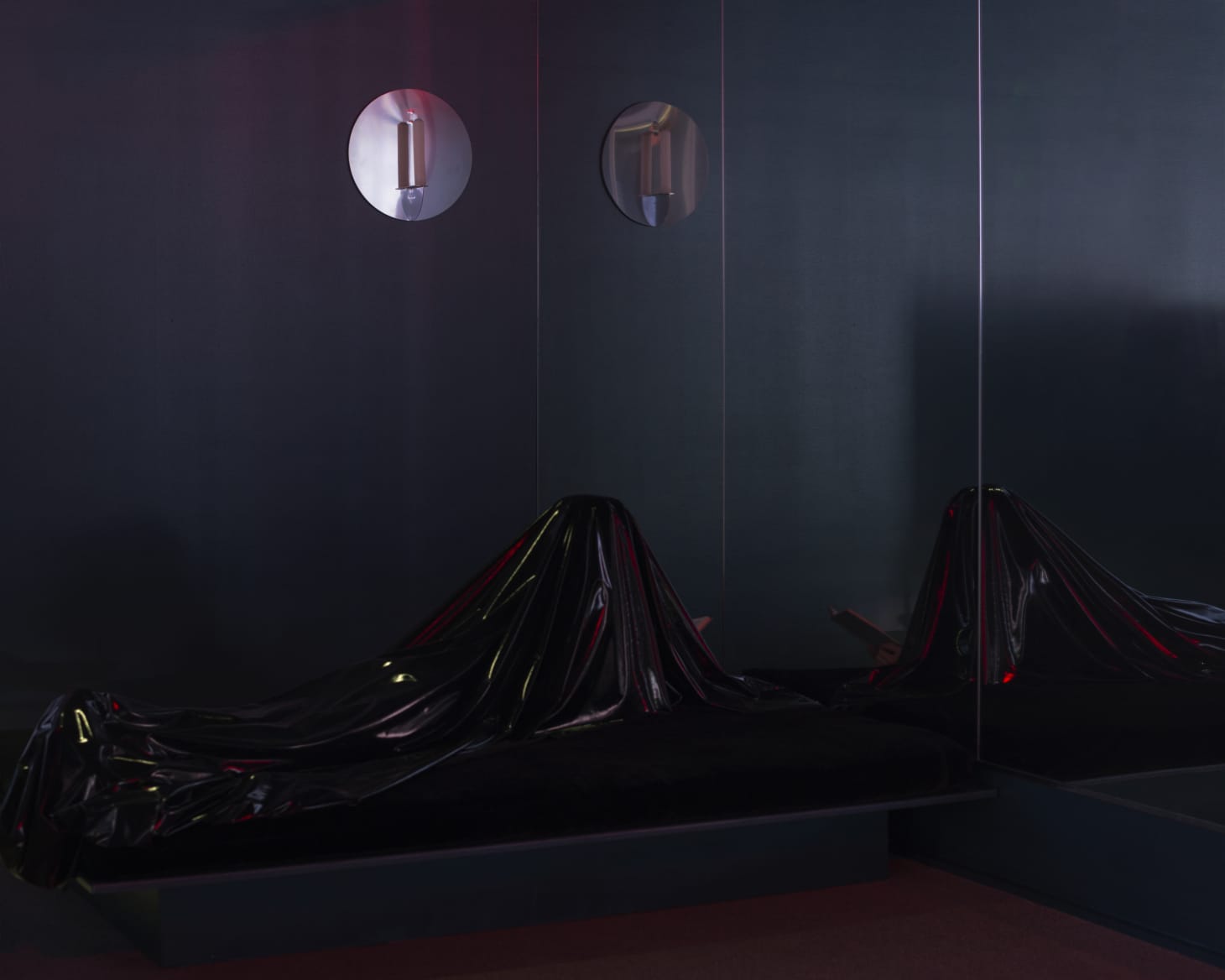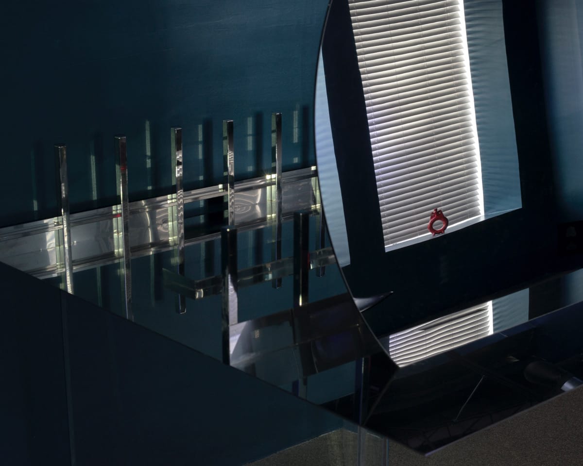 At the Swiss Institute, two spaces from the novel are reconstructed. On the ground floor, one finds the Variety Theater, the set for a notorious decapitation in Bulgakov’s story. Haiduk creates an immersive space with an eerie atmosphere; the dim light slowly changes colors, as the slight movement of sheer white curtains implies an invisible presence. A sound piece plays in the background, an aural collage of cacophonous procession music, an audience cheering on the decapitation, and a cat purring. The latter points to the novel’s devil-like protagonist, Woland, who had a cat as his assistant.