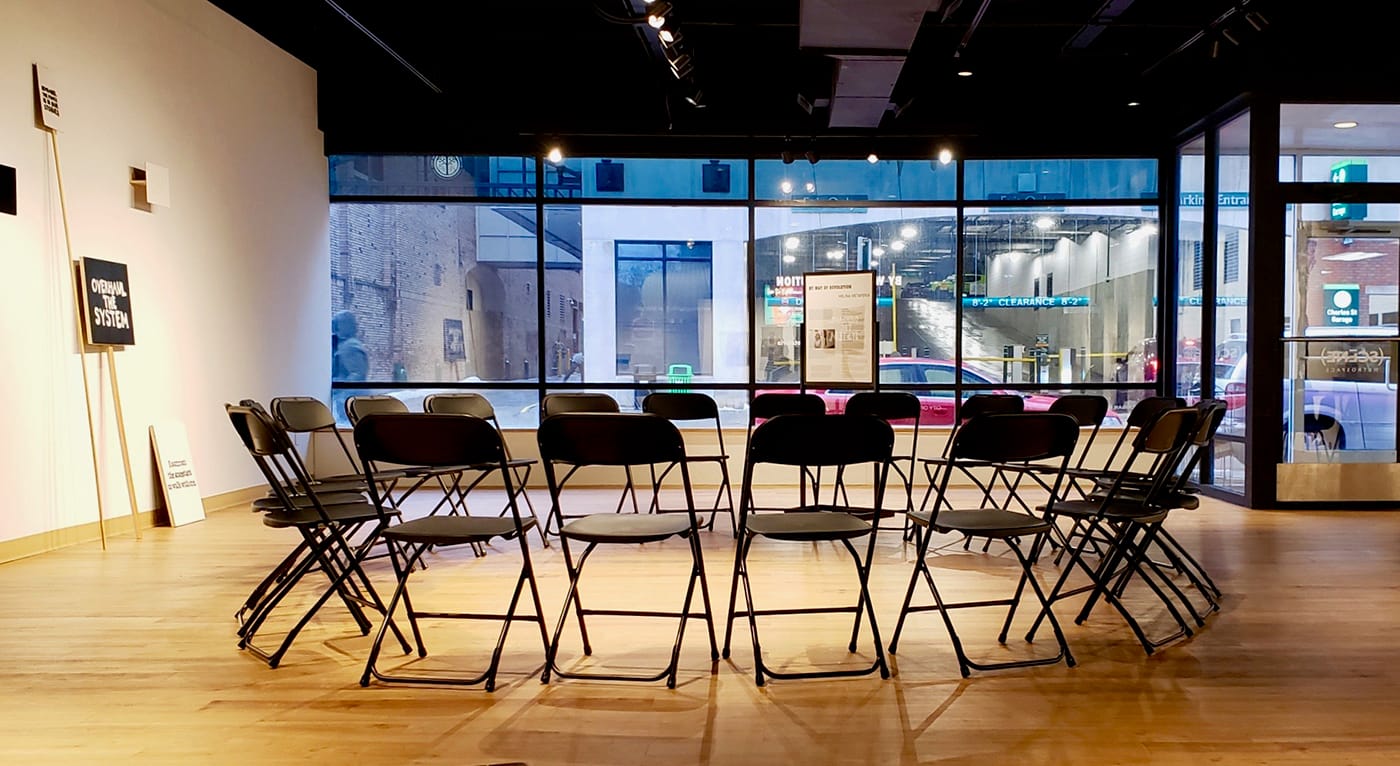 EAST LANSING, Mich. — For artist Helina Metaferia, perhaps the most important part of her solo exhibition By Way of Revolution, at Michigan State University’s (SCENE) Metrospace, is a circle of folding chairs that stands in the middle of the space, visible to passers-by on the downtown sidewalk.
