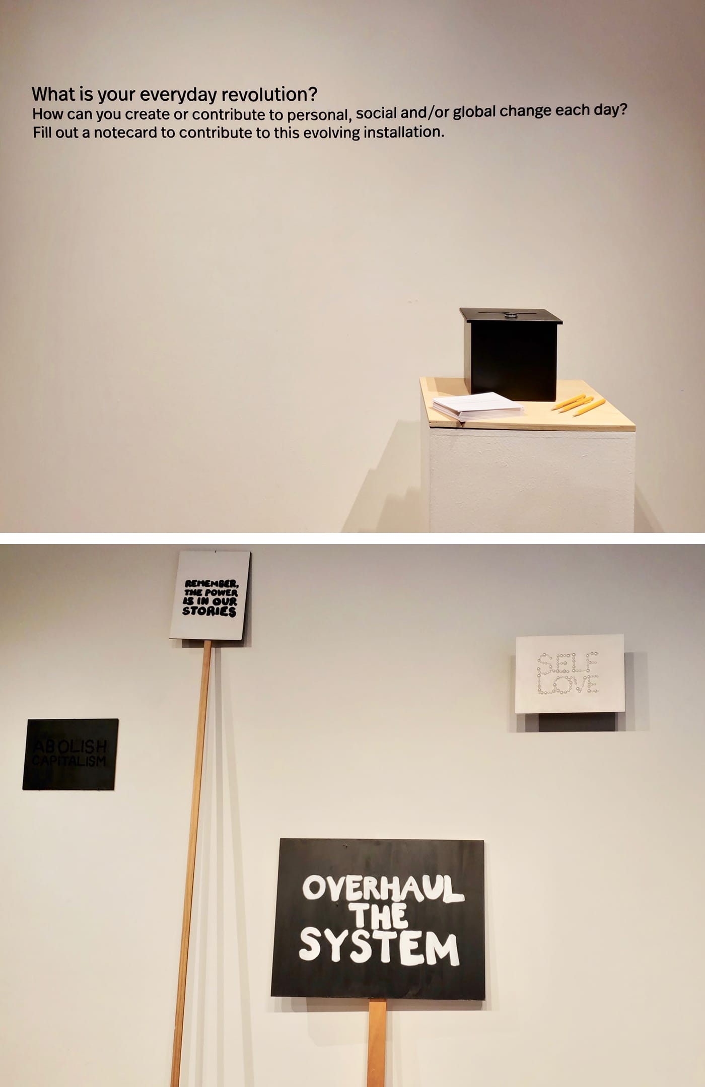 But there are other kinds of conversations, as well. Near the gathering circle, Metaferia installed a “comment card” station, asking gallery visitors to answer a two-question survey about their definition of the word “revolution,” and what their everyday revolution looks like. She then selects among the responses and converts the pithiest into protest signs, an installation collectively titled The Woke (2019) that will continue to accumulate along the adjacent wall throughout the exhibition run. The rest of the gallery space is devoted to Metaferia’s film and collage works.