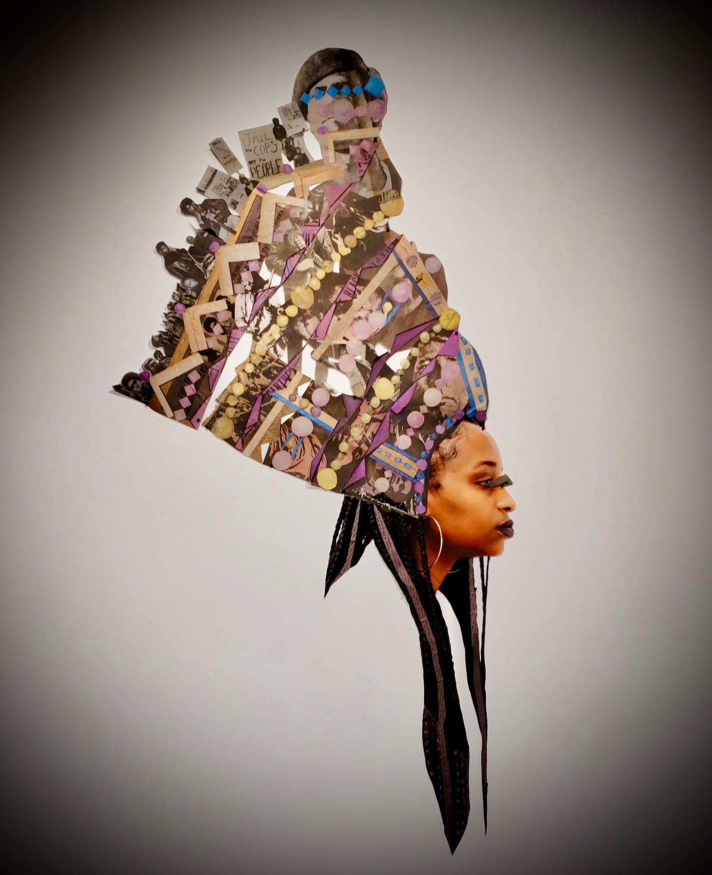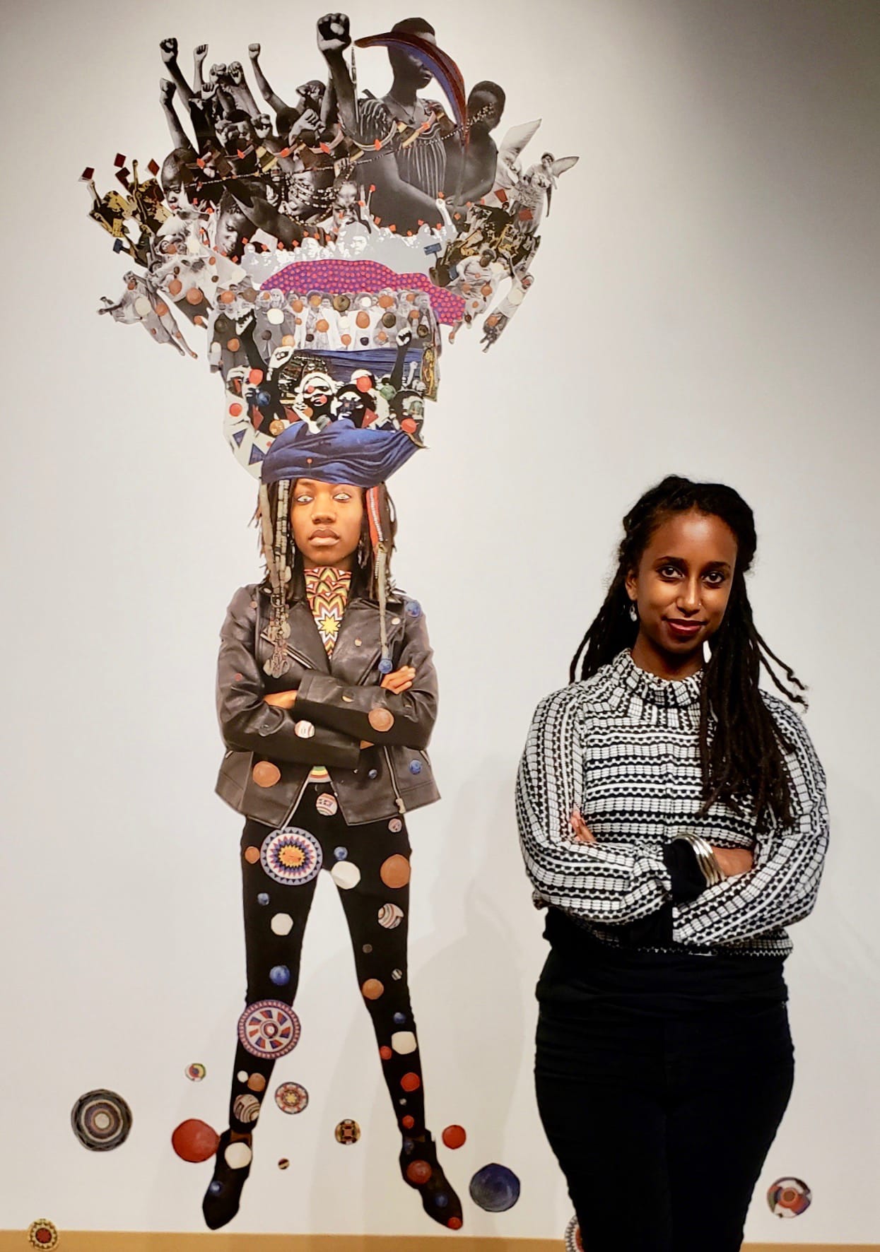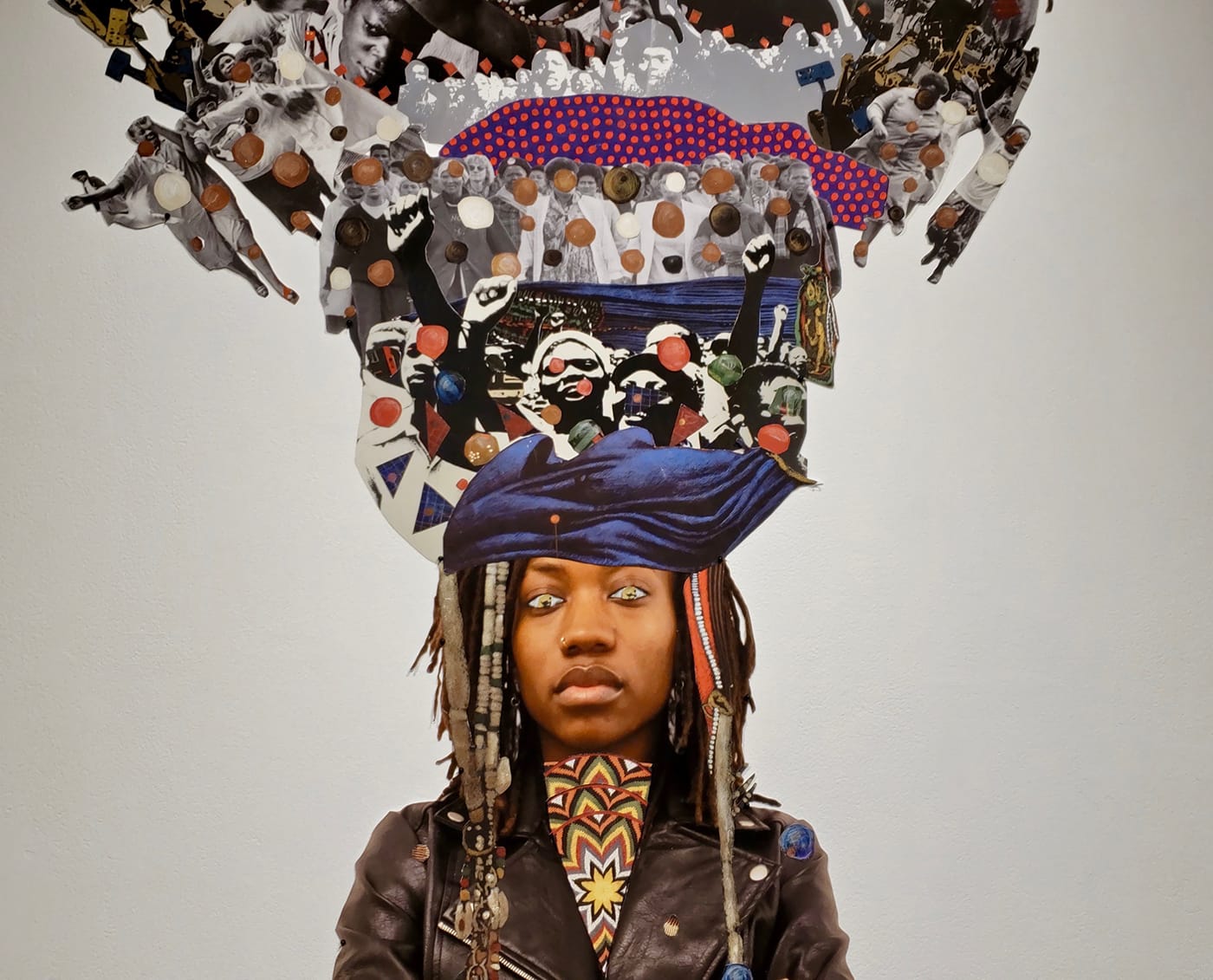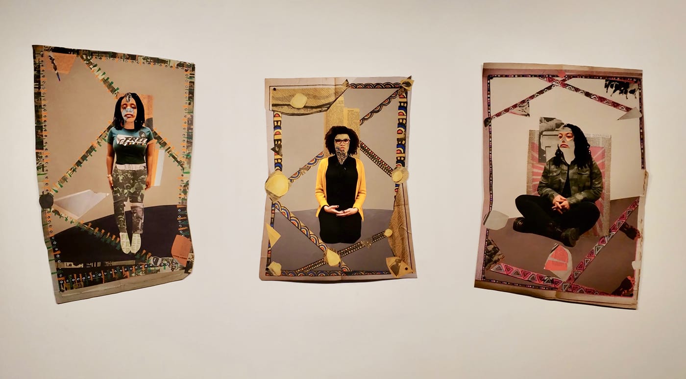 Metaferia is of Ethiopian descent, and interested in protest movements throughout the diaspora. The final body of work bridges the ideas present in the conversation circle and gallery of protest signs, and notions of women carving out their own space within Black history and Black liberation. While at MSU, Metaferia made a short film titled The Bold (2019) which features footage of students and faculty members that are women of color posing with images of Black Panther newspapers and African liberation movement posters, shot during a workshop on the history of protest gestures, including standing, kneeling, and sitting. Along with the presentation of the 10-minute video, Metaferia created a series of altered still photographs of students and faculty, physically interspersing their images with collage elements from copies of archival protest materials and documentation. “Stand” (2019), “Sit” (2019), and “Kneel” (2019) all directly reference the workshop activities, and a second Headdress series picks up on the incorporation of traditional Ethiopian motifs in the collage portion of the gestural series, converting flocks of protesters, raised fists, and slogan-bearing signs into elaborate headdresses for three portraits of Metaferia’s female subjects.