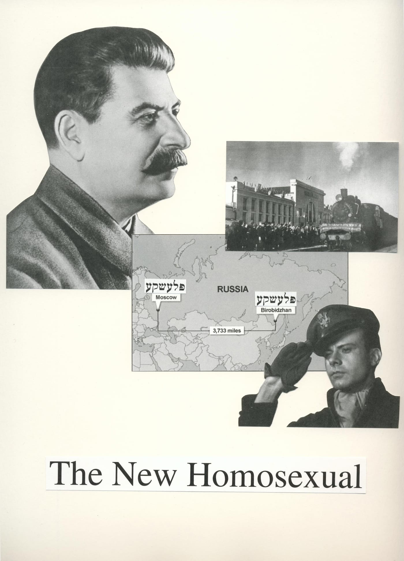 GZ: Speaking of queer-Jewish coincidences and parallels in the past, we can go back very far, to the very beginning, which is obviously the Bible, and proceed with Talmudic masculinity profoundly analyzed by pioneering Jewish scholar Daniel Boyarin, who has introduced a gender approach to Talmudic studies. Narrowing the field to Russia, or the Soviet Union, we shall begin with the rise and development of hostile rhetoric and oppressive politics toward gay people in Soviet legislature and journalism of the 1930s, including dialectics of the concepts of race or ethnicity, sexuality and class consciousness, or political views. This provides much fodder for a so-called intersectional analysis of social attitudes and state systems of domination and discrimination. It’s well known that it was customary for official Soviet rhetoric to voluntarily label various groups as Fascist or bourgeois, and that later it was used to conflate ethnic categories with social or political ones, as in the infamous cases of “traitor nations” or the campaign against “rootless cosmopolites” predominantly of Jewish origin. Interestingly, this intersectional discourse addressed the subject of sexuality as well. It began with an authoritative statement by Maxim Gorky in his article “Proletarian Humanism,” which appeared in May 1934 and was much approved of by Stalin, or possibly even commissioned by him. Relying on The Brown Book compiled by European communists and translated into Russian, which stigmatized Nazis for their “wretched inclination,” Gorky condemns the destructive and corrosive influence of Fascism on European youth. He is proud to assert that in the country of the triumphant proletariat, “homosexualism” is considered socially illicit and punishable, while in the “cultured” country of great philosophers and musicians — that is, in Germany — it remains free and unchallenged. And next he sees fit to continue the comparison by addressing Jewish question. He says that the outstanding Semitic race that had produced the proletarian messiah Karl Marx is being expelled by the Fascist bourgeoisie of Germany, while the Soviet Union has established a self-governing republic for working Jews. Gorky wrote this article in the wake of the legal transformation of Birobidzhan district into the Jewish Autonomous Region.