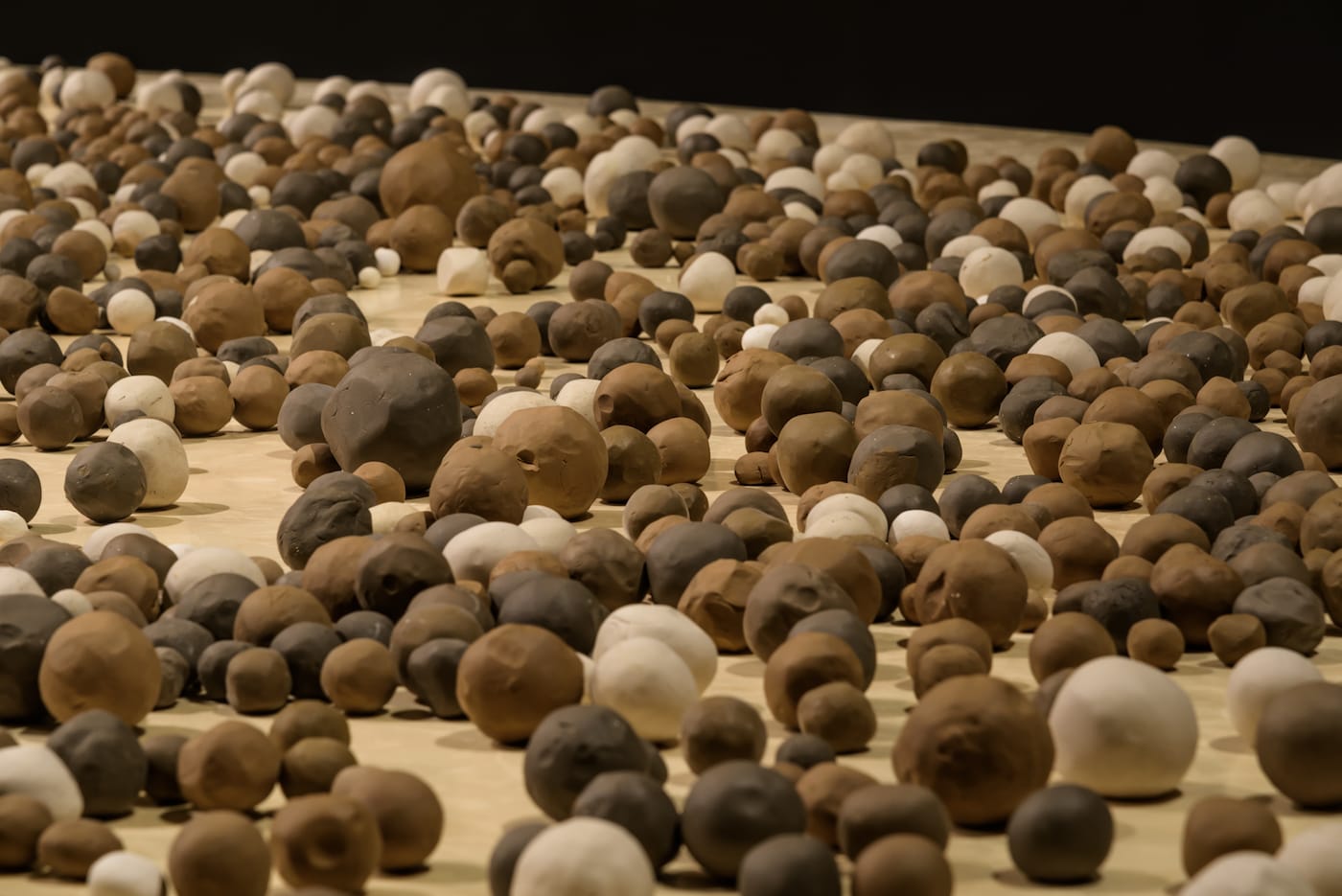 At the South Korean conceptual artist Kimsooja’s new participatory installation, Archive of the Mind — which is also the title of her exhibition at the National Museum of Modern and Contemporary Art in Seoul (MMCA) — I engaged in a strangely calming activity. On entering a large, dimly lit room fitted with a 19-meter-long elliptical table, participants were encouraged to take a sizable chunk of clay from one of four different-colored slabs. We were then urged by Kimsooja herself to roll it between both palms to make a round clay ball. Throaty gurgling sounds from her accompanying sound performance “Unfolding Sphere” filled the space and engulfed us as we sat on three-legged stools kneading the clay. Once our balls were ready, we were asked to leave them on the table among the hundreds of others that had been made by previous participants. While the idea seemed a bit odd and made me skeptical at first, the combined effect of the guttural soundtrack and the gesture of moving both hands in a rhythmic fashion was unexpectedly meditative. Thousands of balls have already been placed in storage to make space for new audiences to leave behind the remnants of their visit.