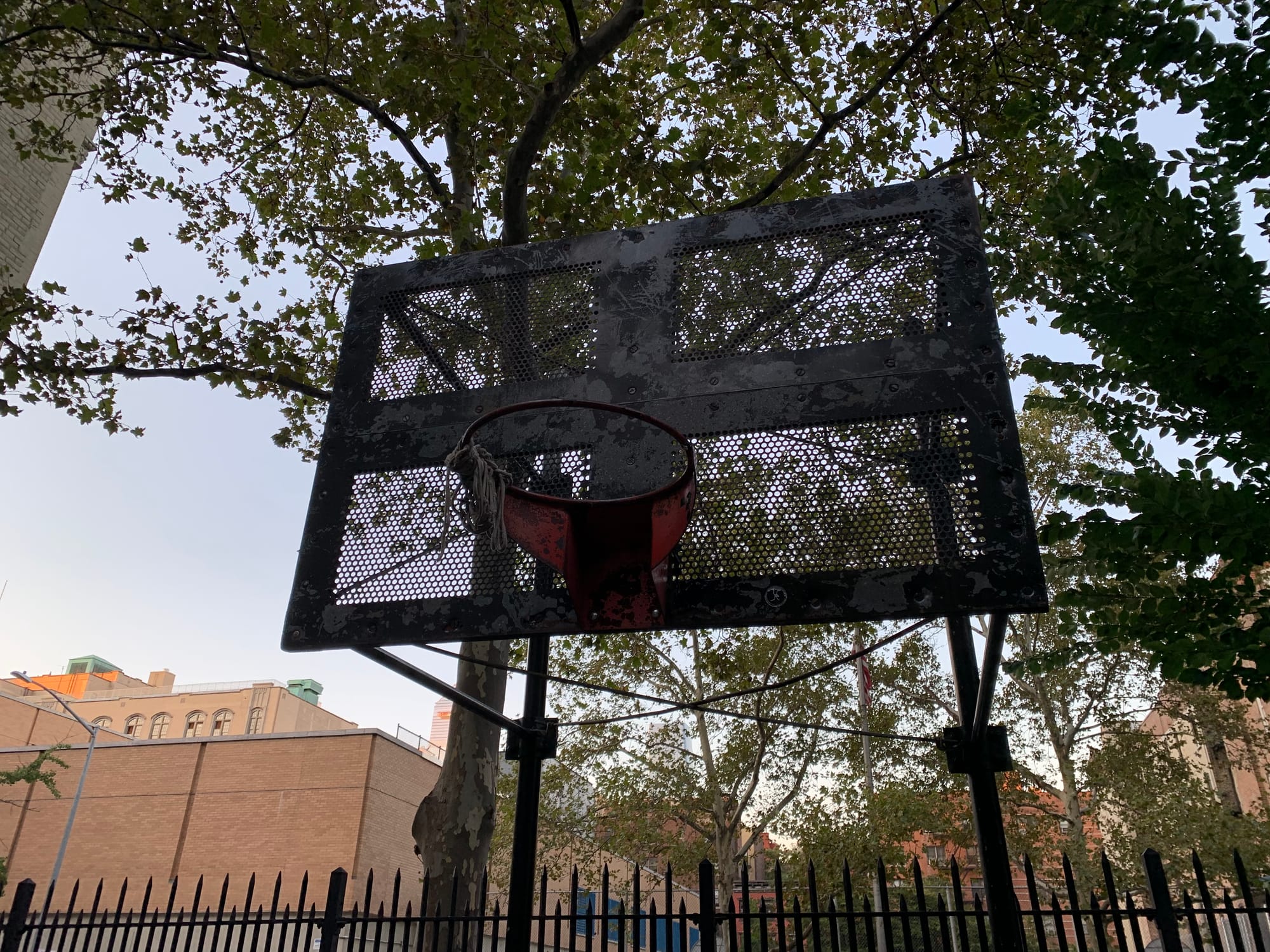 If, like me, you don’t play much basketball, you may be wondering how much the Gold Nets Project is really improving courts. Is it just decoration? A meaningless jumping-off point for Kaplan’s studio practice? Or are nets part of the game? After all, in New York City, some rims are even specially-built so that nets can’t be attached, and the Department of Parks & Recreation has said, “Nets are not a critical piece of equipment” on a court. But most players disagree.