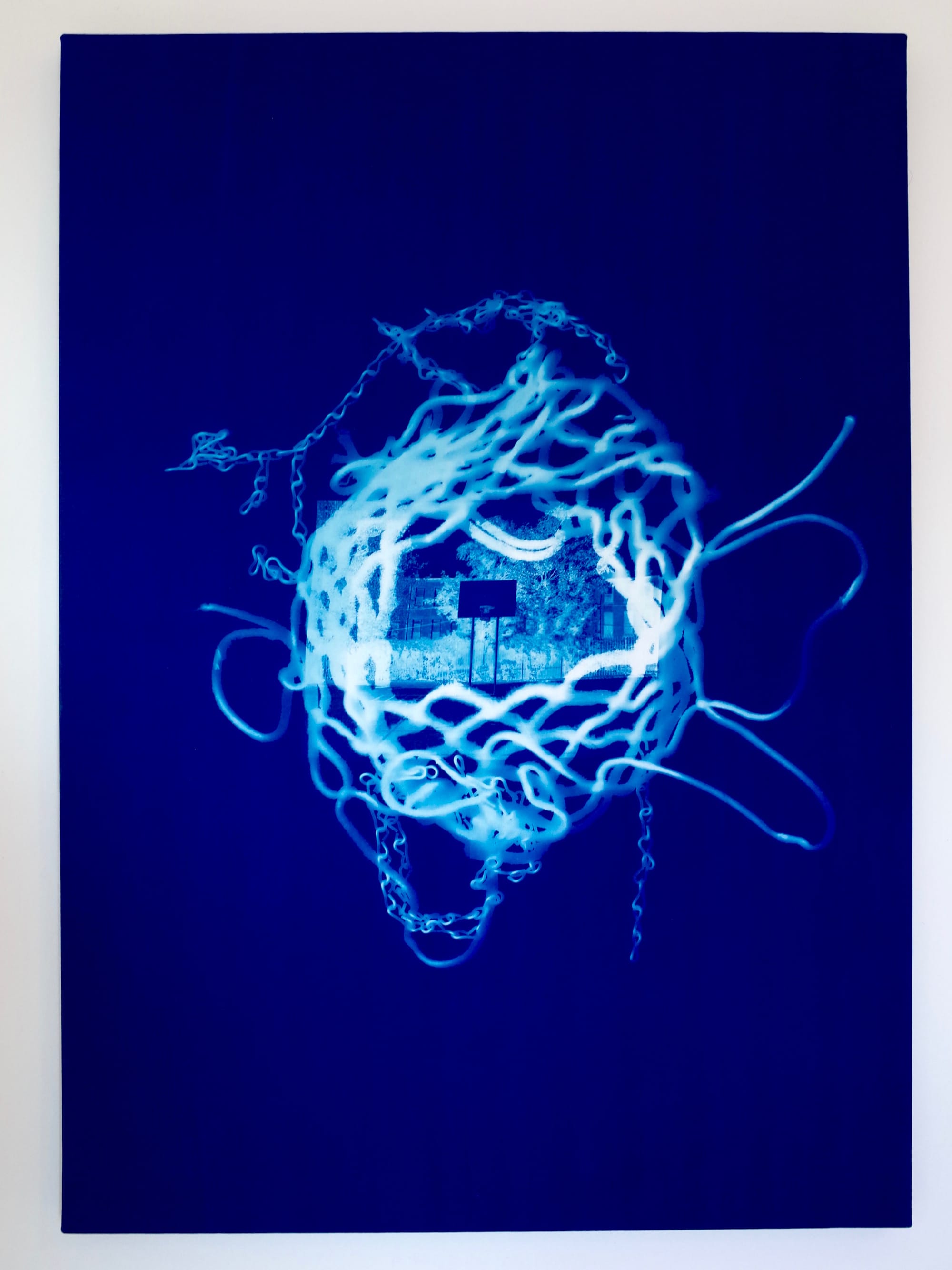 Each installation, of now almost 300 in total, is documented in a series of photos and mapped on the project’s website. Many are incorporated into Kaplan’s studio practice, with a series of cyanotypes and other works that utilize before-photos of the courts and scraps of deteriorating nets that he sometimes finds there.