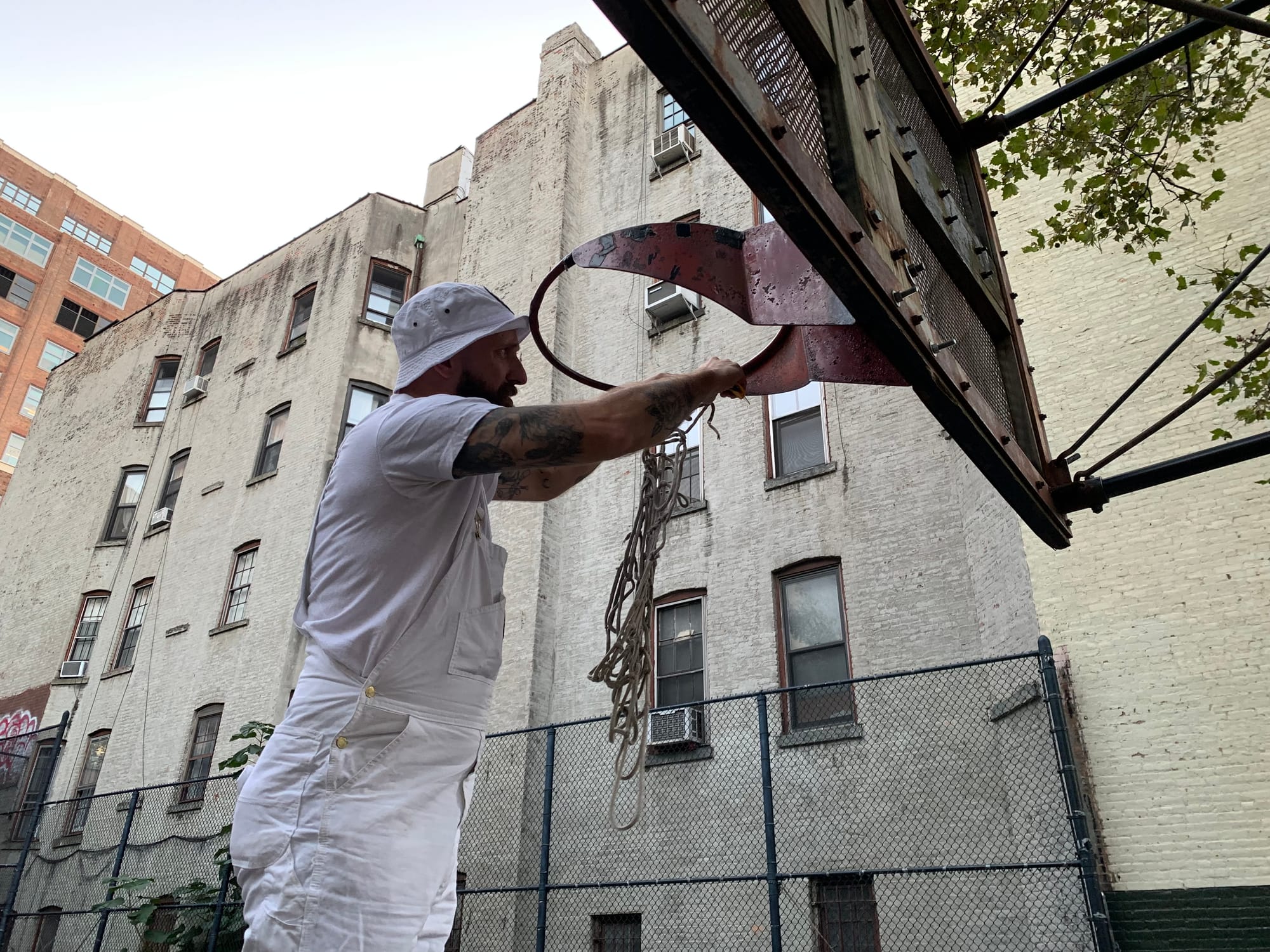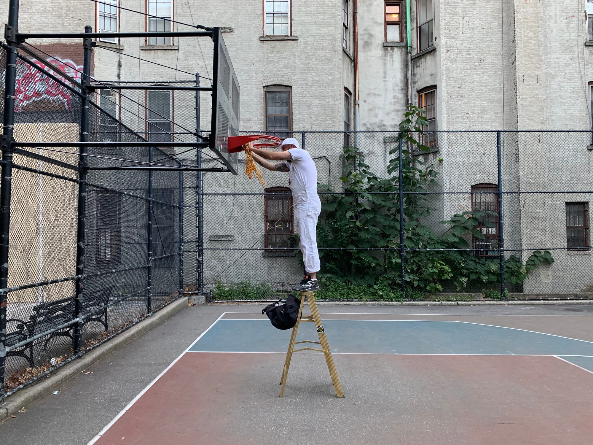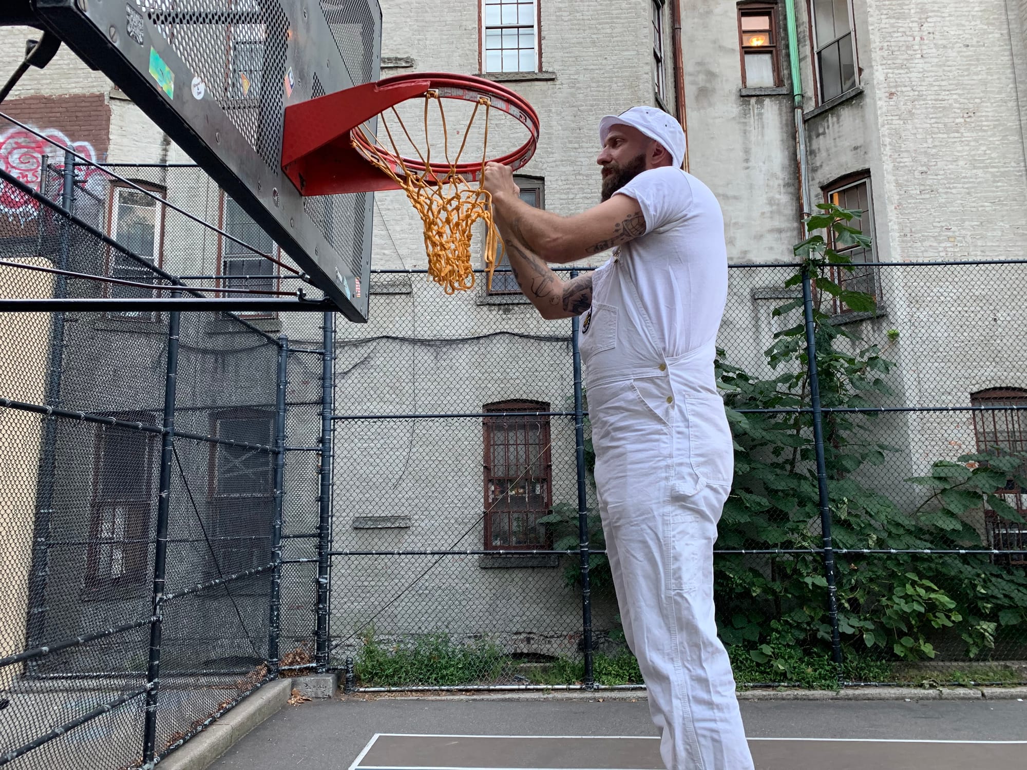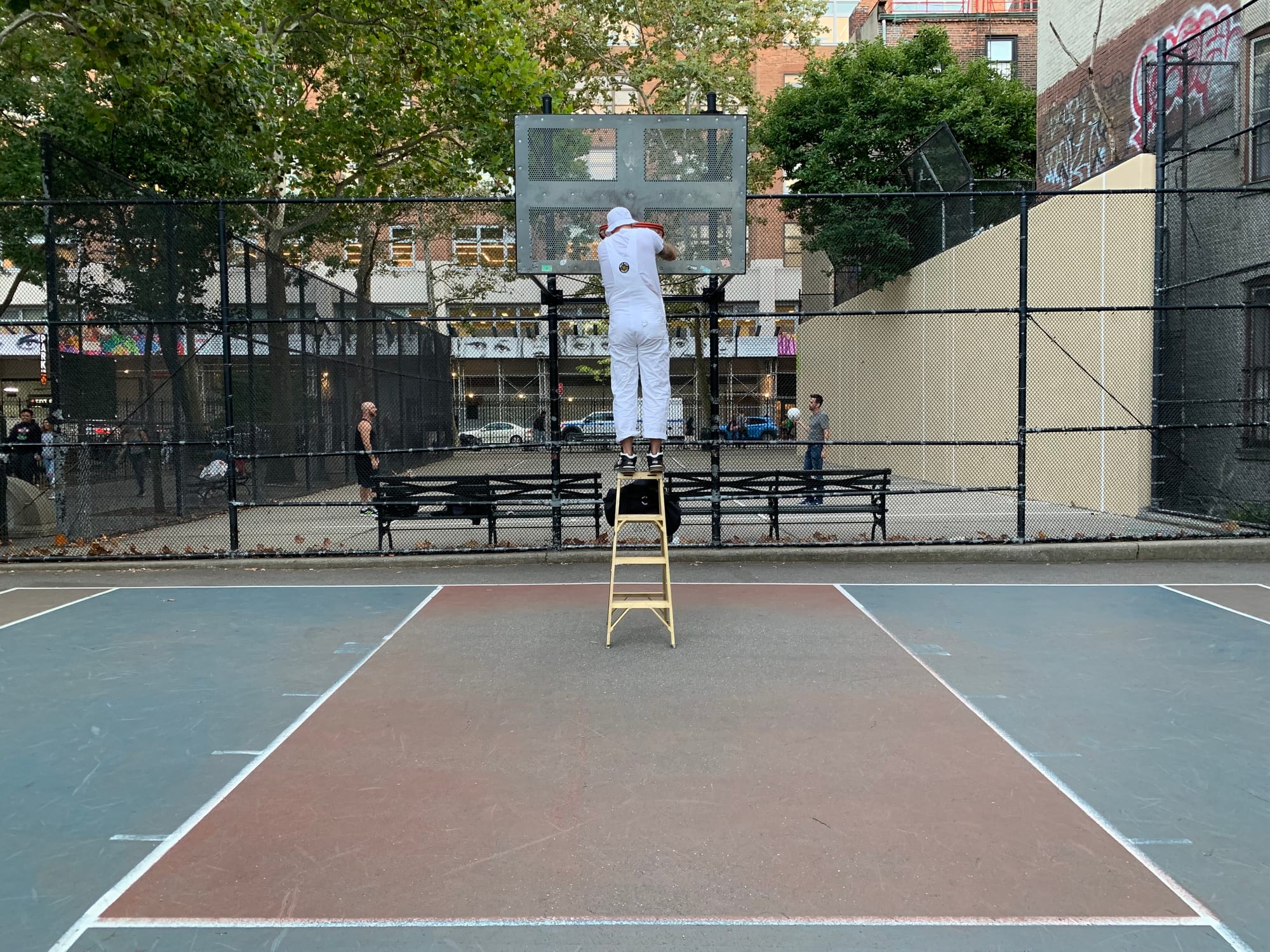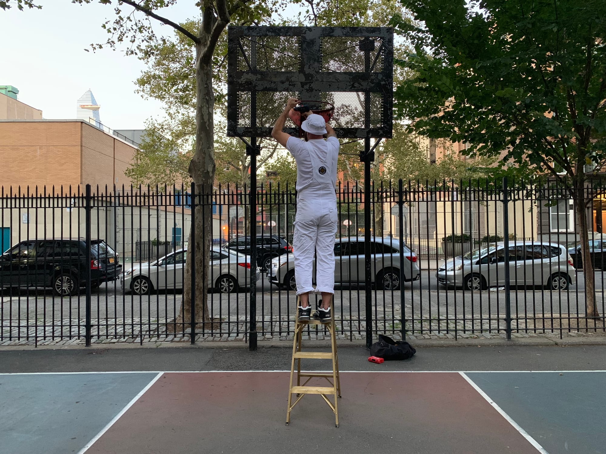 One recent evening, I met up with the artist Jeremy John Kaplan in Chelsea. Kaplan and I have known each other for years, mostly through his roles at galleries in the neighborhood, but today we were somewhere very unfamiliar (to me): the basketball court at Dr. Gertrude B. Kelly Playground. He wore a white uniform (bucket hat, t-shirt, and overalls) and stood on a gold-painted step ladder just below one of the baskets. The getup is somewhere between official-looking uniform and attention-grabbing costume. Fiddling with the hoop, over the course of a few minutes, Kaplan installed a brand new, bright gold net. But nobody had asked him to install it — certainly not the Department of Parks & Recreation. This was tactical urbanism meets performance. This was the latest installation of Kaplan’s Gold Nets Project.