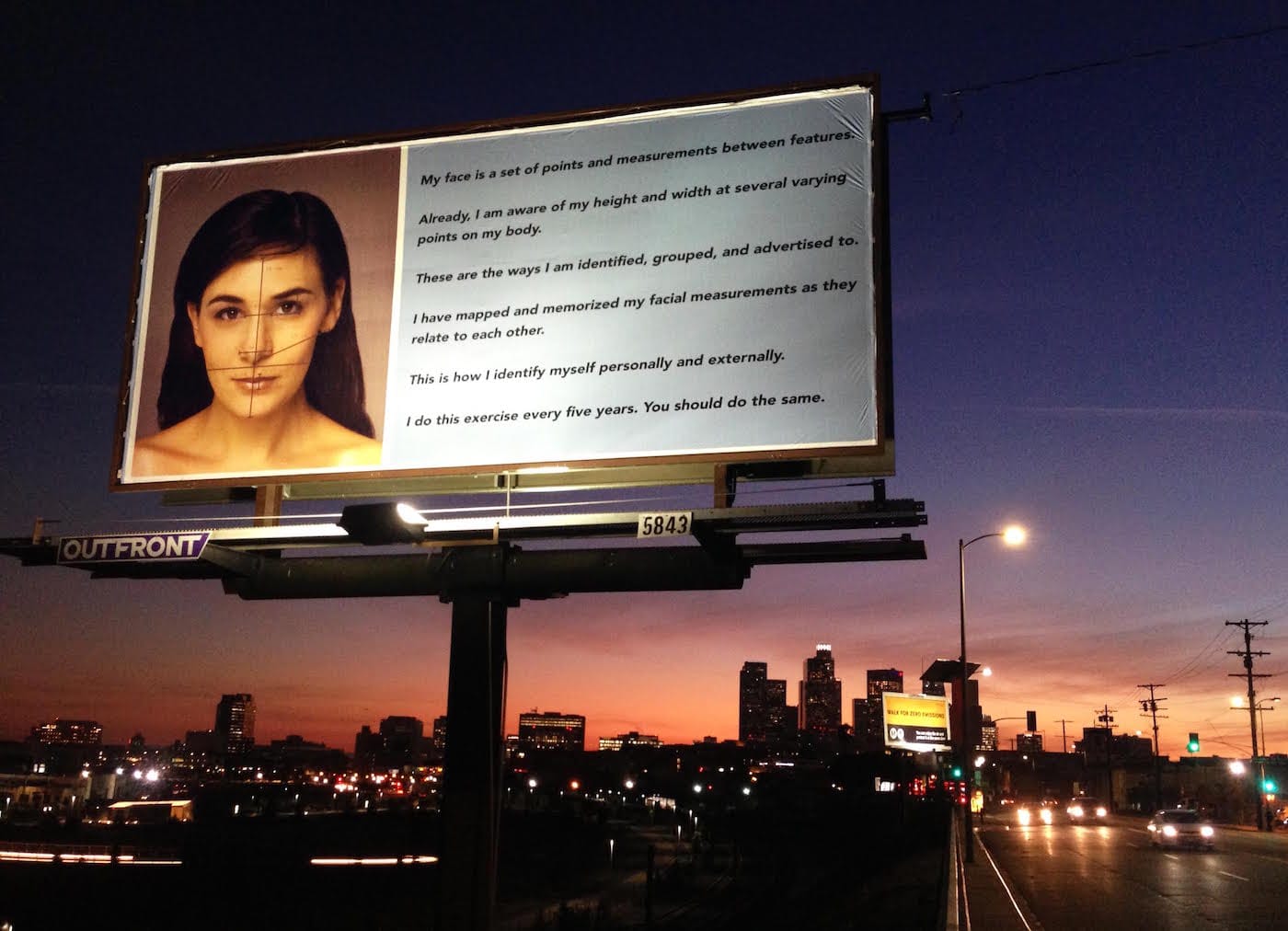 Two years later, in November 2016, this image, now titled “IMPRESSIONS,” debuted on a billboard in Los Angeles in the same format, developed in collaboration with OUTFRONT Media and curator Anna Frost for Bas Fisher Invitational in Miami. This time, the photo — adapted for a large-scale presentation and including the same annotations — was somehow creepier and yet even more appropriate, given the ubiquity of advertising in LA. On another billboard, the same photograph appeared without measurements. Instead, each of Mayer’s features was overlaid with neon-green cross-hairs: small, mapped points utilized for facial recognition technology. The accompanying text read: