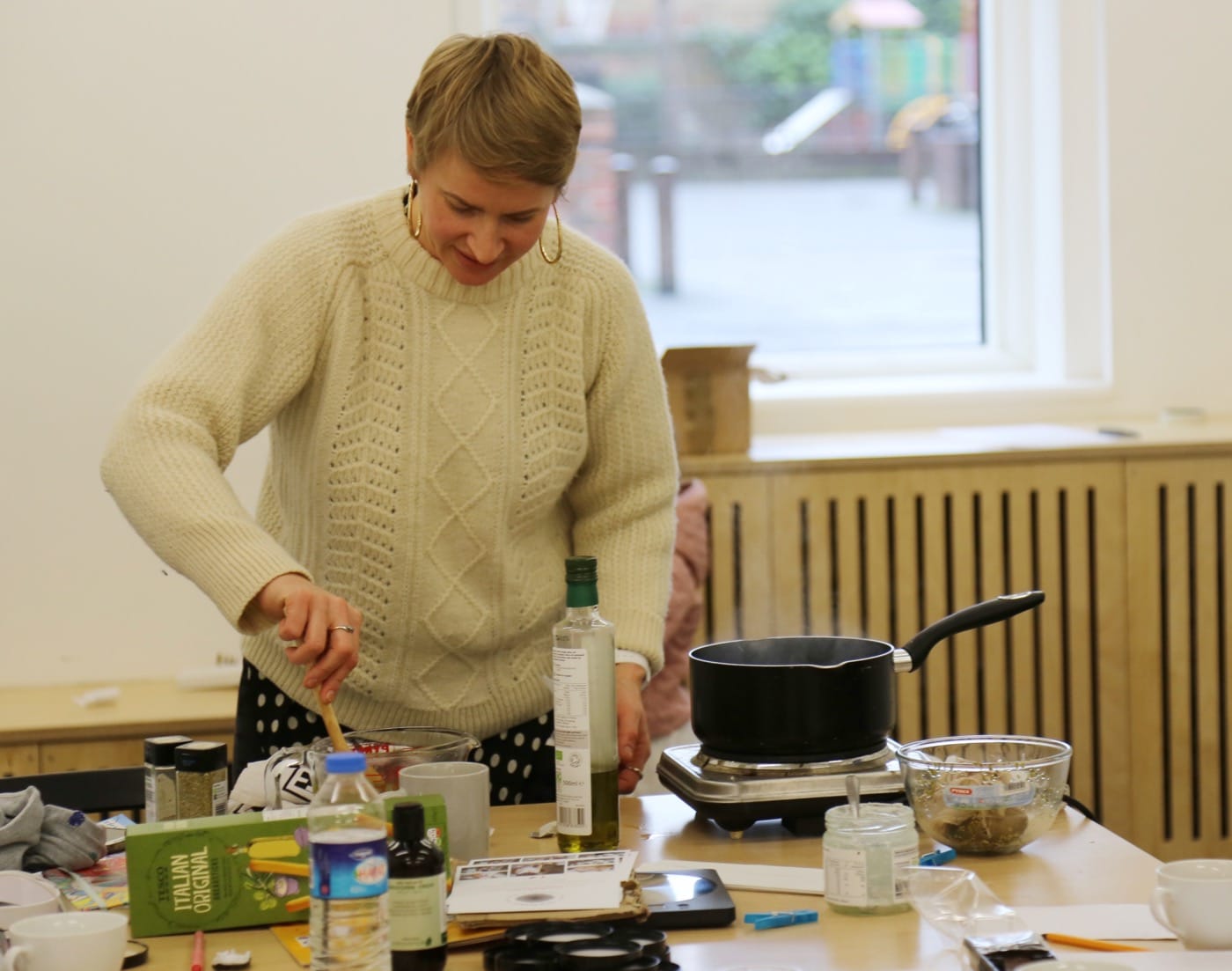 Back in the workshop, we drink marigold tea and watch rosemary-infused oils boil on a hot plate. This is a serious seminar about herbalism, an obvious fact that evaded me for the initial minutes of the session as we discussed the evils of modern medicine and (gulp) vaccinations. (The art world’s appetite for snark has clearly clouded my judgment. How could an Infinite Resistance™ ointment not be a joke?) Lucie Bradley leads us in an open discussion about the history, uses, and implications of herbal remedies. As a diehard urbanite, the idea that seasoning herbs from the kitchen can combat colds, coughs, and the flu sounds far-fetched. Nevertheless, Bradley explains that even dried herbs from Tesco can have some palliative effect on your health.