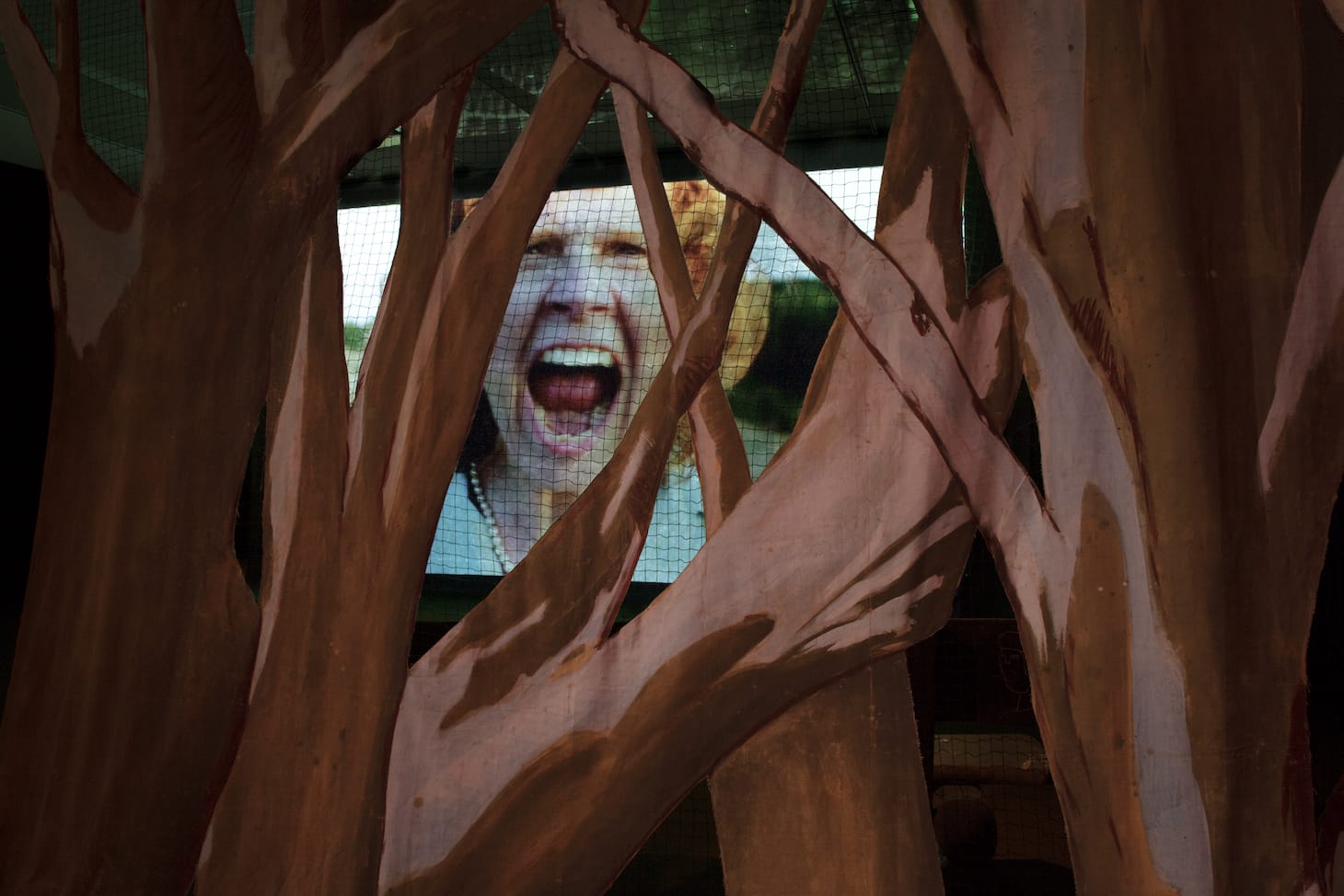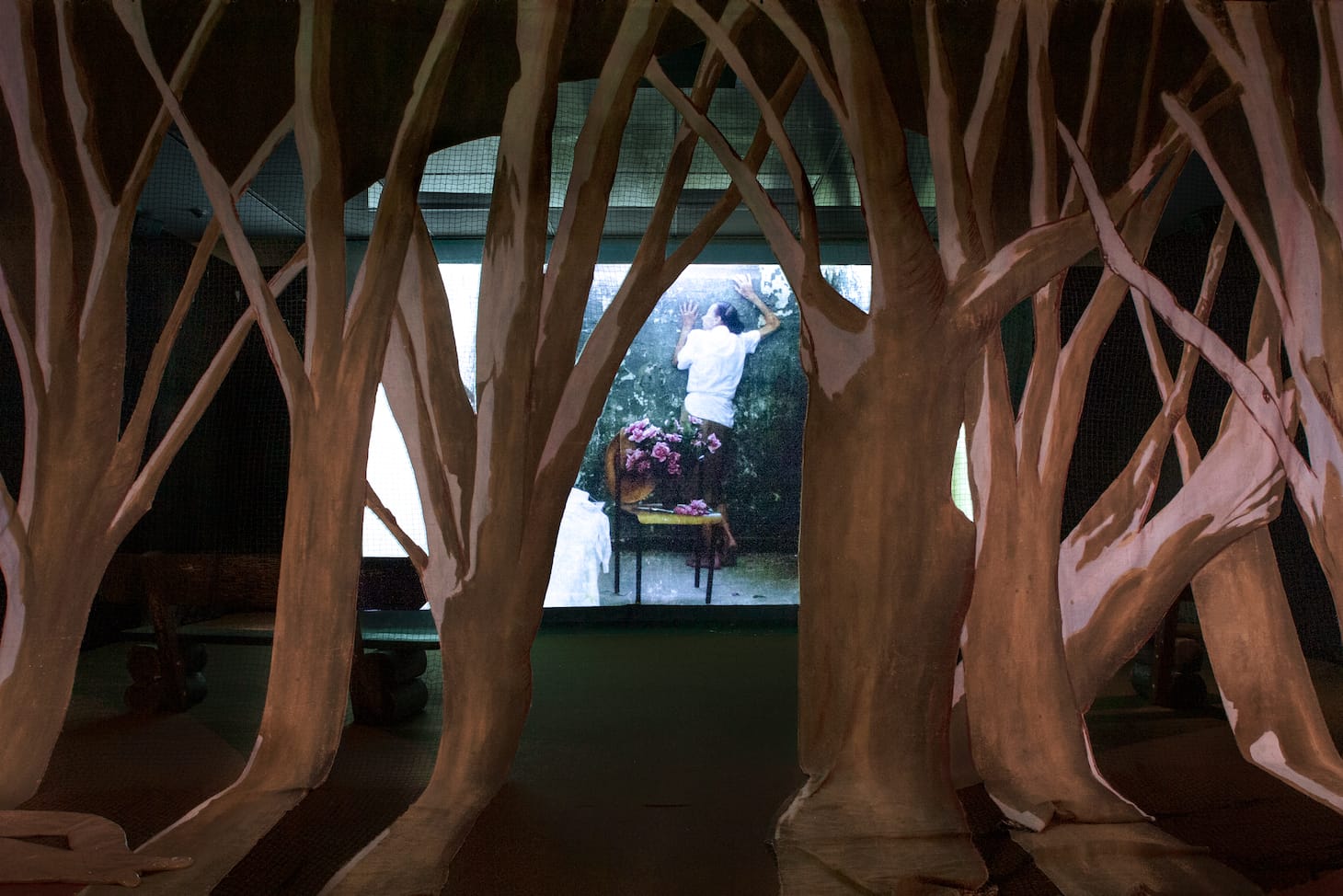 Through the two-dimensional forest, where cutouts of trees form perforated curtains that spill onto the floor, Curnier Jardin projects her recent film, Qu’un Sang Impur (2019), which posits the aging female body as a source of contraband sexuality. Inspired by Jean Genet’s 1950 homoerotic Un Chant D’Amour, Curnier Jardin’s adaptation replaces Genet’s young male inmates with post-menopausal women. They masturbate in front of a disciplinary yet curious male guard, blow smoke into each other’s mouths through a crack in the wall, and run through an excessive woodland — all notes from the original Genet. Curnier Jardin flashes from the quotidian German suburbs to mock prison cells, which, unlike Genet’s sterile black and white cells, are colored by green walls, inmates clad in pearls, and bouquets of wilted flowers that the women run across their breasts and swallow whole.
