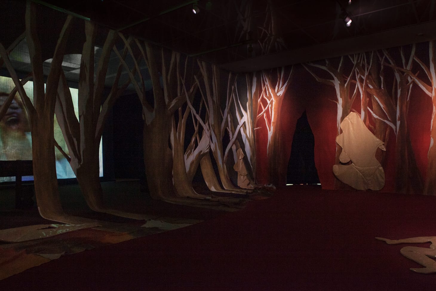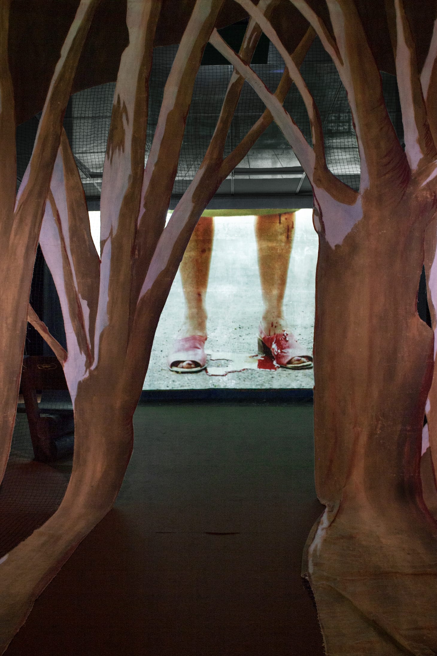 BERLIN — “Flat and soft women who could be rolled up and stored,” inhabit Pauline Curnier Jardin’s Hot Flashes Forest. “A life would have marked them, even gave them a look, big eyes, a gutted animal life,” she says of her Peaux de Dame (Lady Skins, 2019), in which the artist pins deflated vinyl fabric to the walls of her red forest. The figures suggest the anonymous female form, easily discarded, hanging around the dimly lit gallery like clothing, a plasticized relic that simulates dehydrating meat. In her latest installation at the Hamburger Bahnhof, the French artist, who won Germany’s esteemed Preis der Nationalgalerie last fall, interrogates patriarchal credo through the lens of its unseen bodies.