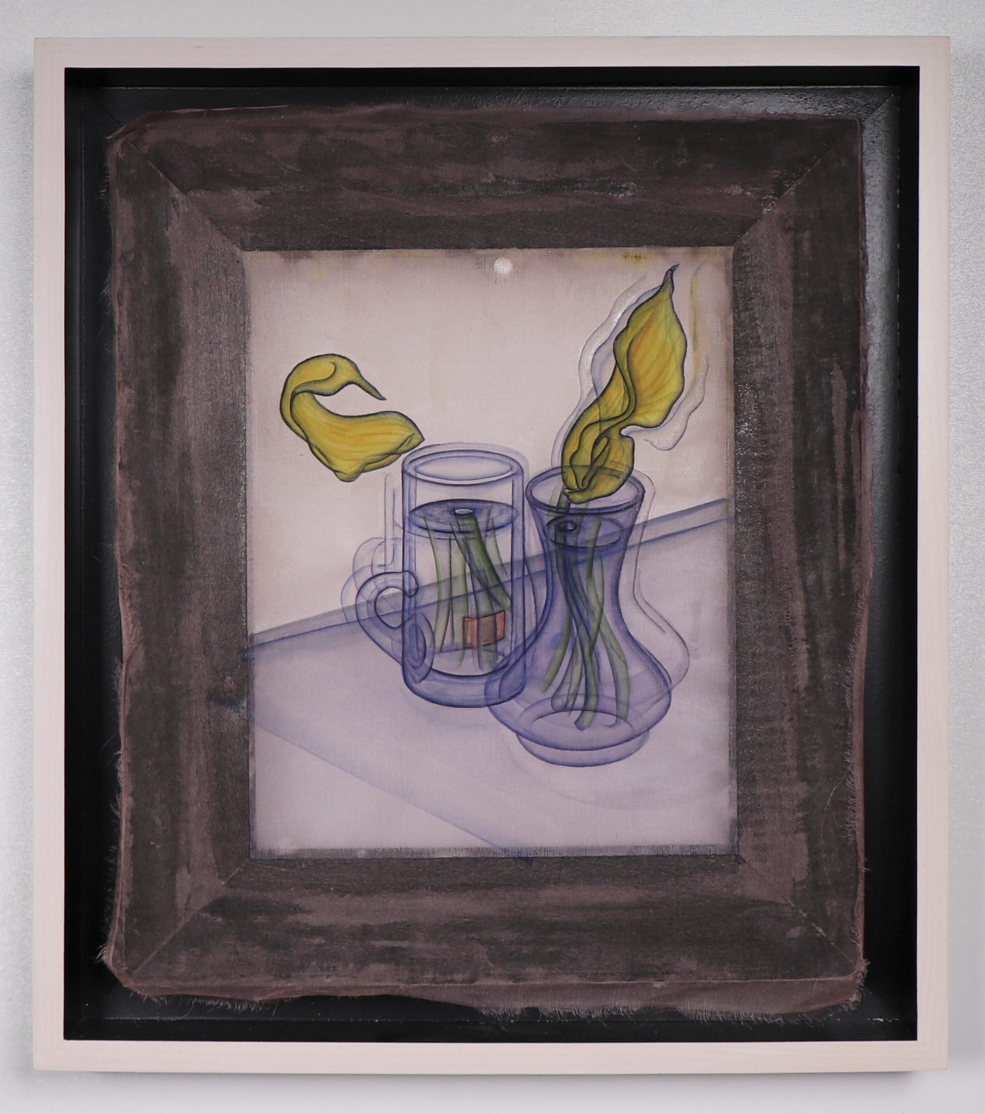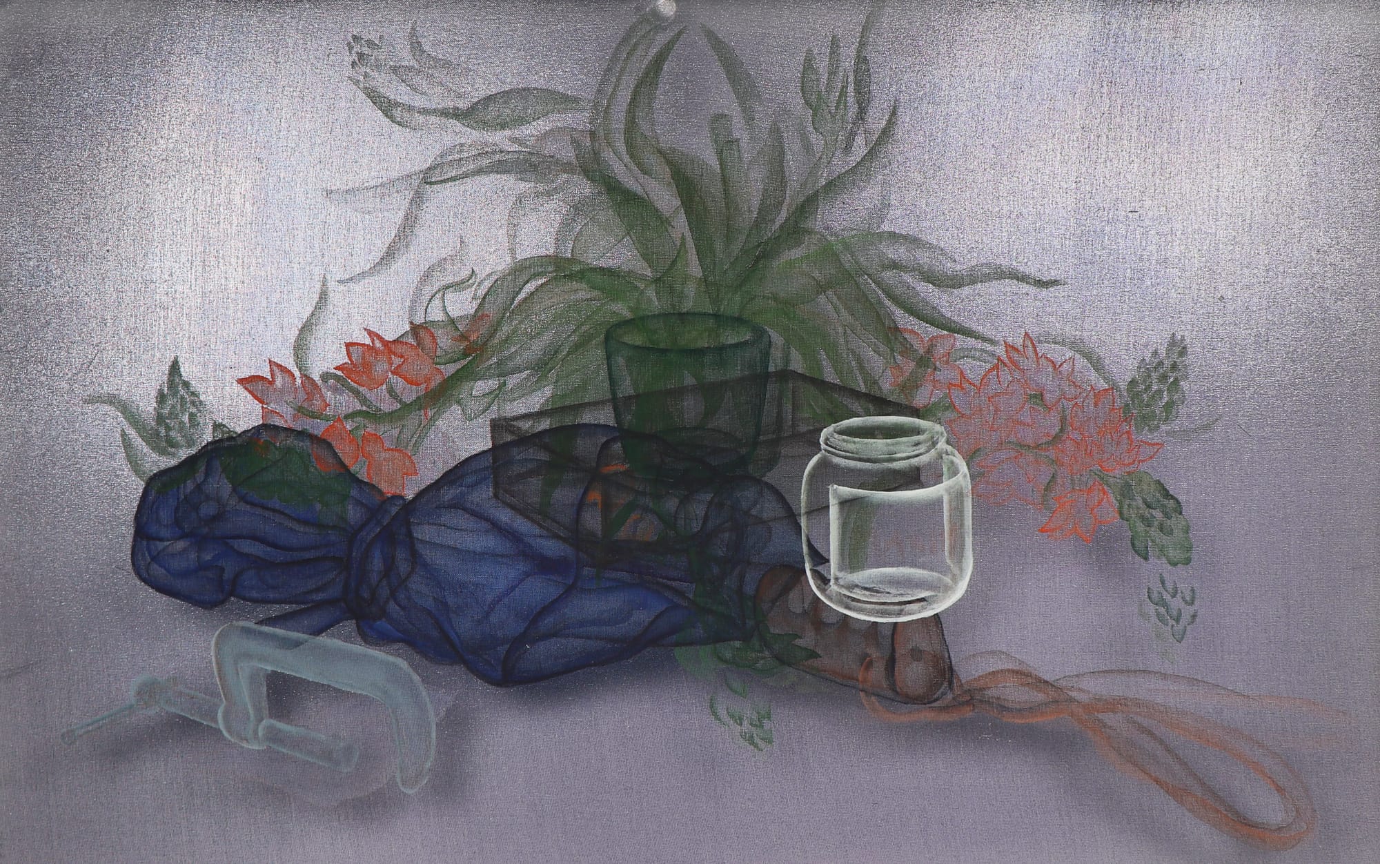 Transparency is the show’s central motif. For months, Aatchim experimented with ways to treat semitransparent Korean silk so that the fabric would absorb enough ink without producing a smudgy image. Finely detailed, the resulting images indulge the eye that takes pleasure in texture, color, and materiality. They have a luminous quality. This recent body of works on silk, all made in 2019, are delicate, poetic, and quietly poignant. In “New (York) Times, Umbrella from Jesse,” for example, white highlights cause a glass jar to stand out against a darkened silk background as if lit by moonlight. While the layered compositions show the objects from multiple perspectives, they retain the clarity of something that has crystallized in one’s memory.