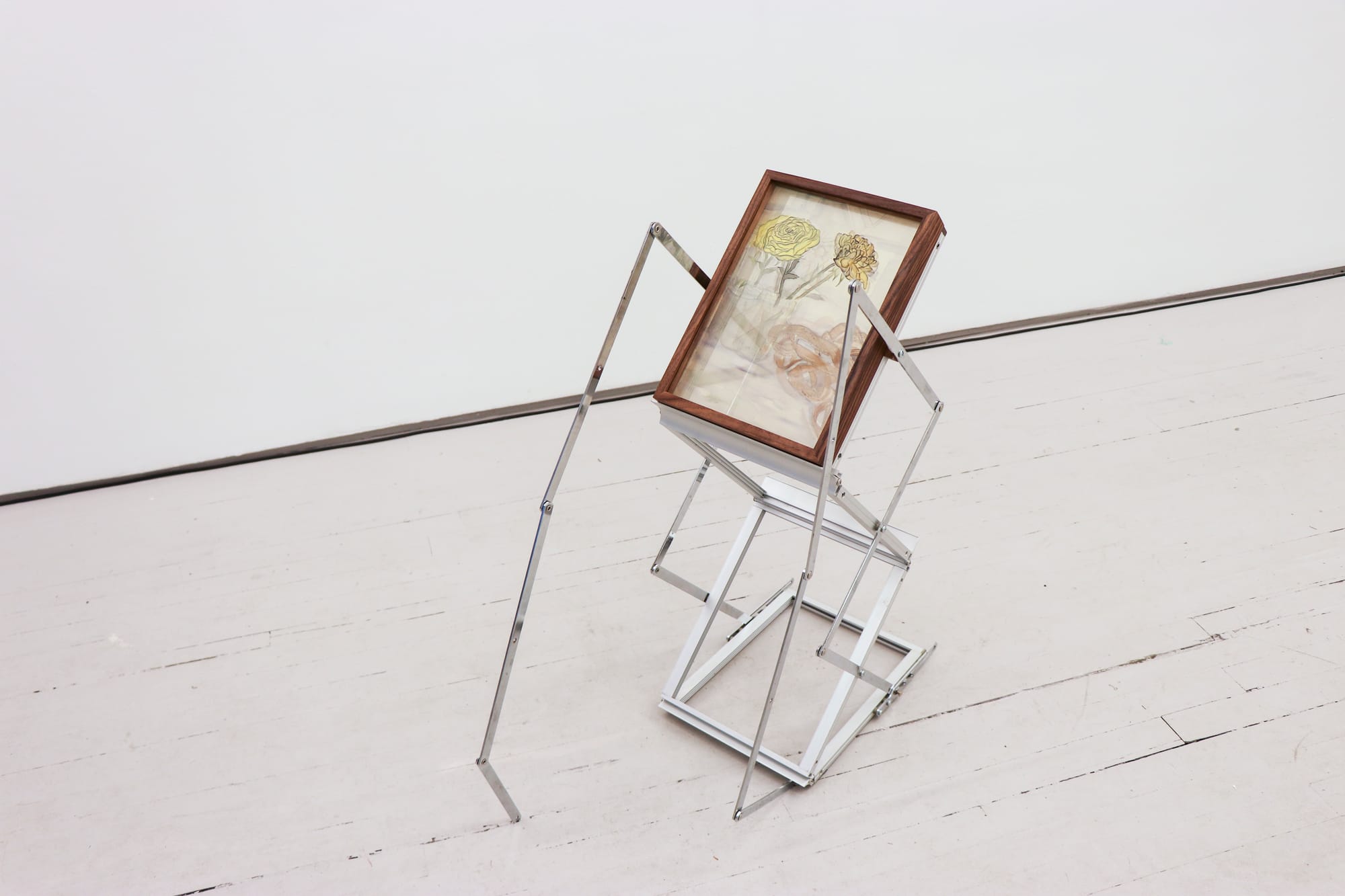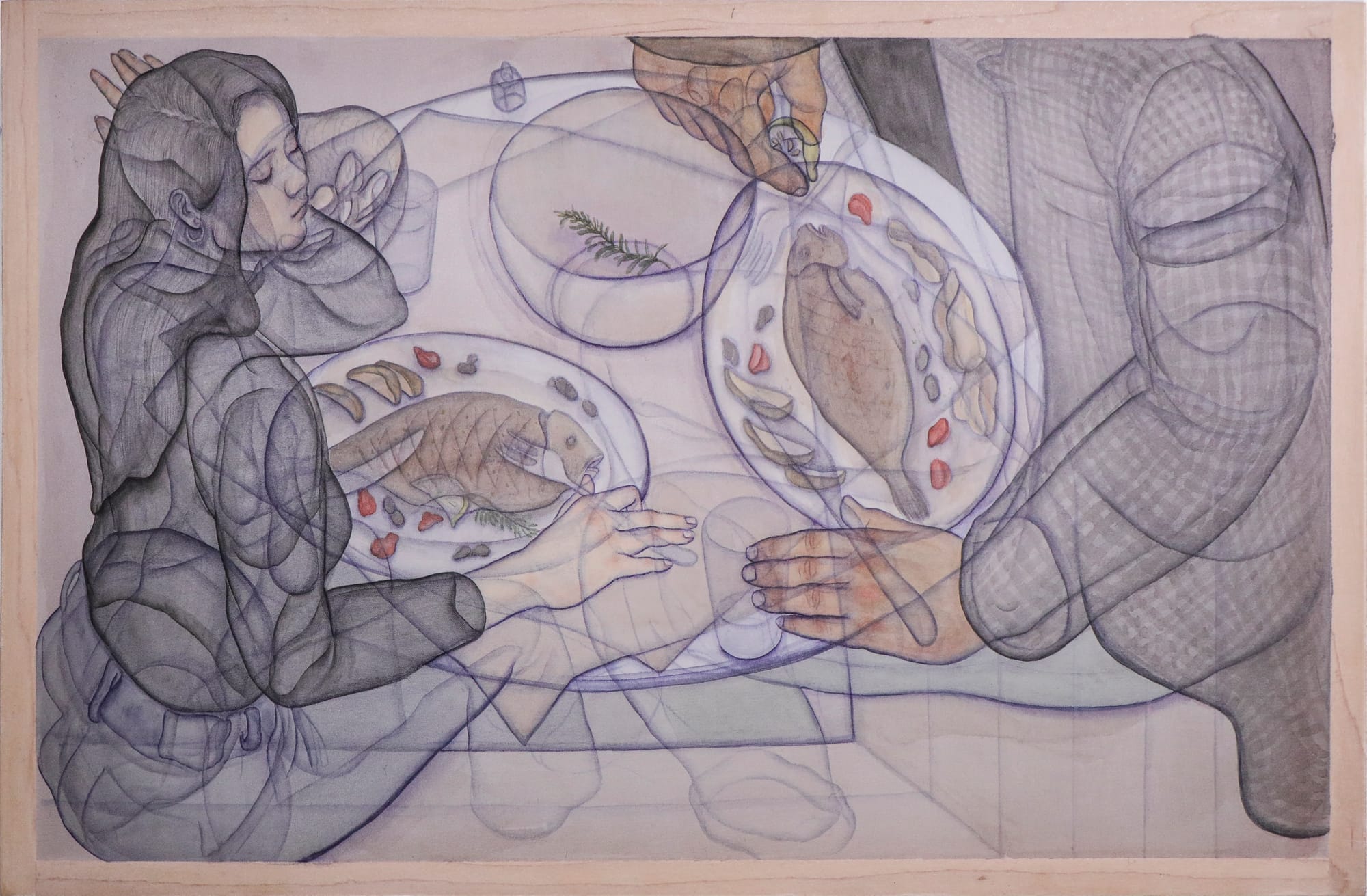 There is something touching about Joeun Kim Aatchim’s images, each portraying a mundane scene, such as a fish dinner for two or a pair of withering yellow roses. Time stills itself in these depictions of objects and bodies as they exist in the artist’s memory: rendered in translucent pigments, the shimmering, dreamlike objects are visible from various angles. Eye jailed eye, currently on view at Vacation Gallery, is born out of Aatchim’s struggle with strabismus, an eye condition that nearly ruined her life but gave her a unique perspective on her extraordinary drawing skills. The exhibition records the artist’s struggle with a talent that she considers both a gift and a curse, as Aatchim weaves an inviting conversation about artist’s practice, sincerely sharing the agonies and emotions that make creating artwork possible.