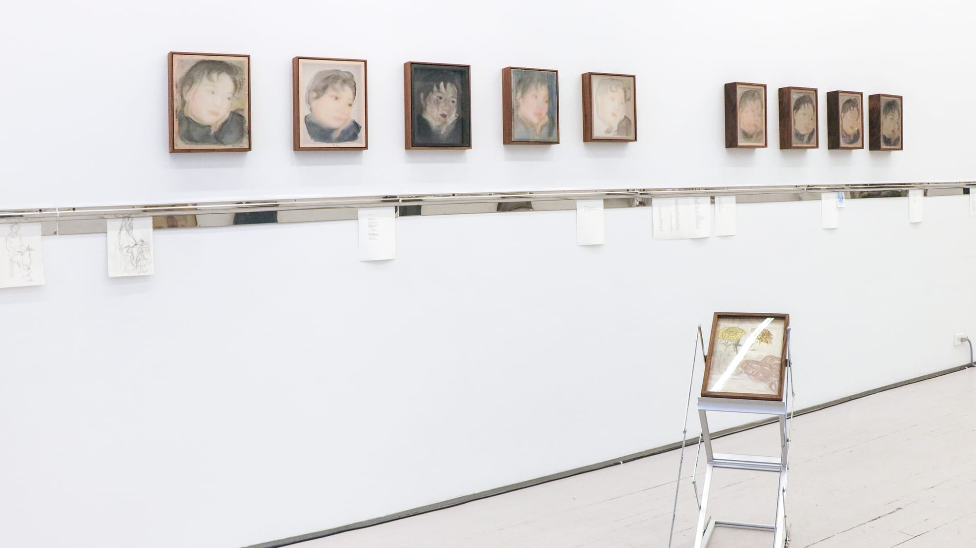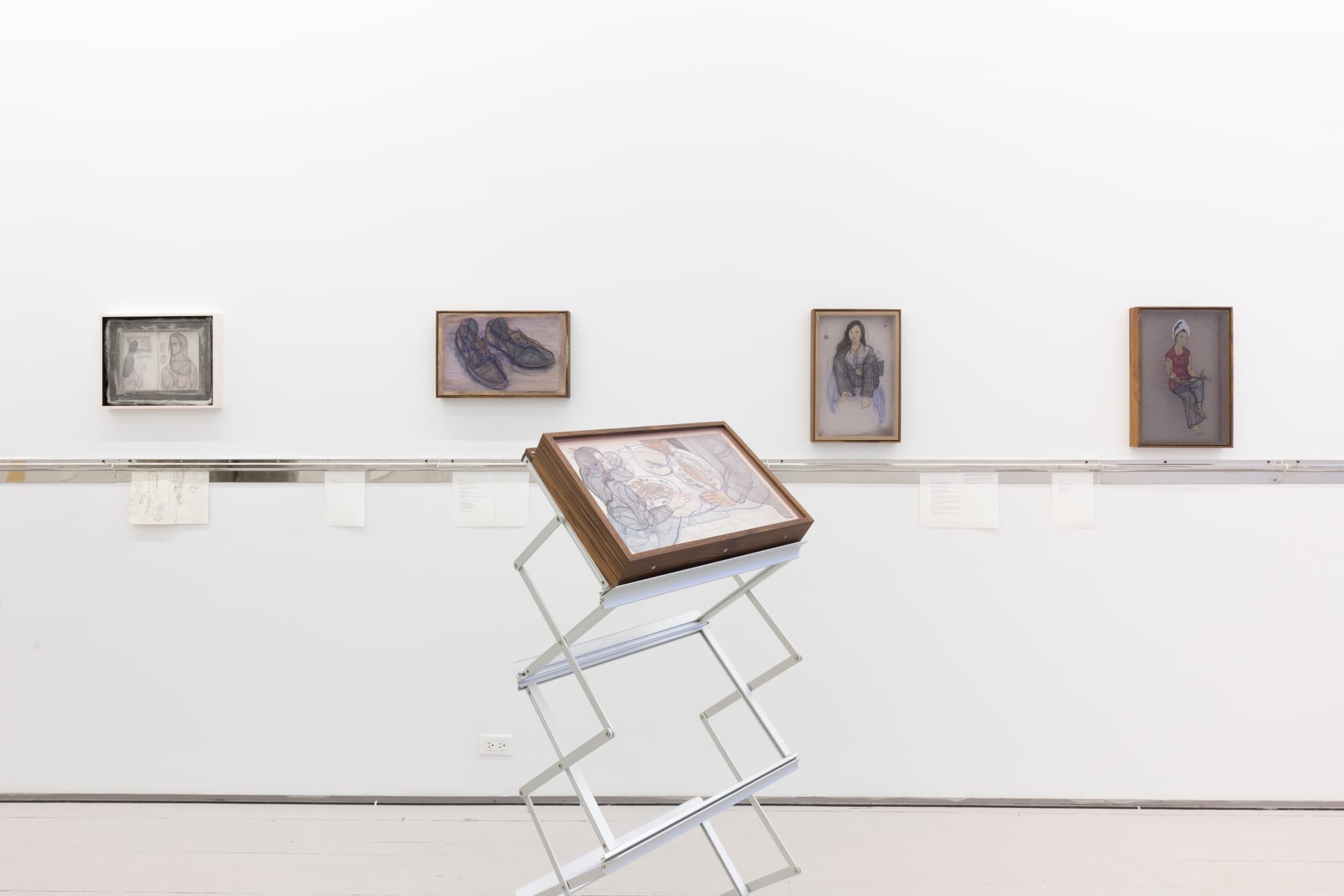 “I feel like drawing is my given husband, chosen by birth. I hated how it defined me,” Aatchim gestures to me with frustration, “So I cheated on it with other mediums.” The gallery is full of evidence of this: mosaic panels hang near the top of a wall or sit atop a heater; a concrete column stands in the center, housing a sound piece that fills the space with a low, scratching hum. Near the column, a spikey metal twig grows from a microphone stand. Beneath the images on three gallery walls, Aatchim’s writings are displayed in restaurant ticket holders. Explaining why she brings in works from other mediums when the show is to mark her return to drawing, she says, “At the same time that I’m reconciling with my eyes through drawing, I also want to forgive all the things I made in the past ten years. They are not fake attempts. I made them as best as I could, and they carry the emotions in lieu of the images I didn’t make.” Their presence shows that emotions have always been central to Aatchim’s work, something she has been hesitant to admit until now.
