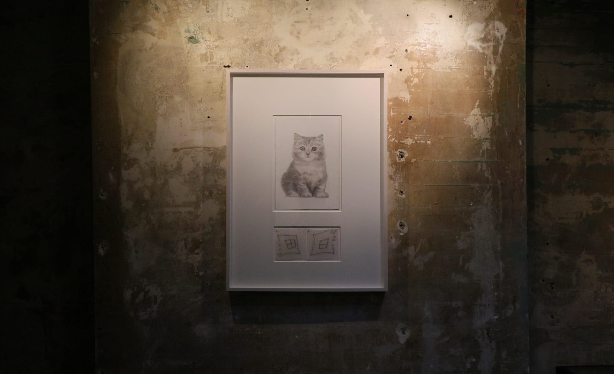 The second floor of the gallery is filled with silverpoint drawings that are meant for children with strabismus. These represent the artist’s genuine and frank reconciliation with the shadows that haunt her formative years. In one drawing, a kitten’s eyes point in slightly different directions; in another, the flames of two candles dance away from each other. These are drawings she made for children who, like her younger self, make regular visits to the eye doctor’s office. Under each meticulously rendered image are two Hess charts that track the alignment of focus in the image, mimicking an optician’s diagnosis.