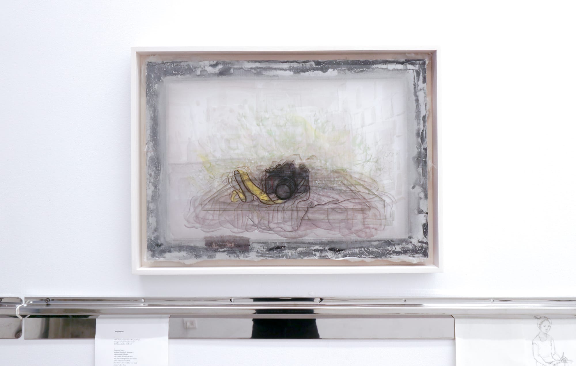 But the center of the space is drawing, that “given husband who is still waiting at home, still so good to me,” Aatchim laughs. “I think I even became better at drawing than ten years ago!” Itching to use her eyes to the fullest and understand how they work, she produced a series of still lifes drawn from observation in the past year. “When making these, I held back the desire to make a perfect image, and the shapes I see begin to shift. My brain must be switching back and forth between two eyes.” These drawings of objects with multiple tenuous outlines, creating a fuzzy image, such as one of her father’s camera, contrast with the crystal-clear objects drawn from memory.