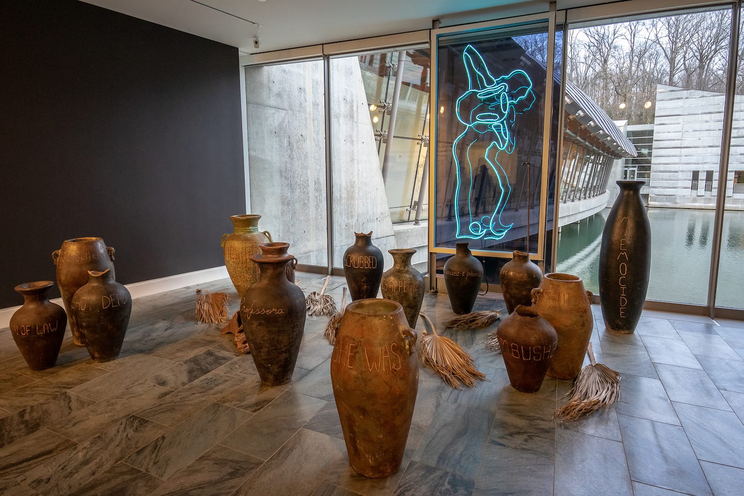 For the Crystal Bridges installation, the artist has installed “The Cessation” in front of a window that overlooks a pond and an adjacent building. The new location shifts the meaning of the work from considering women in public space to considering the representation of women in art institutions, another manifestation of gender inequality. The blackened vessels are chipped and appear burnt, bringing to mind the aftermath of war. Palm fronds that were once green and full of life lie still and dry on the ground. The neon silhouette shines on, signifying a woman who is no longer present in flesh, existing only as a vacant sign. The sounds of water and urban traffic add liveliness to the piece, which feels important in a quiet museum setting.