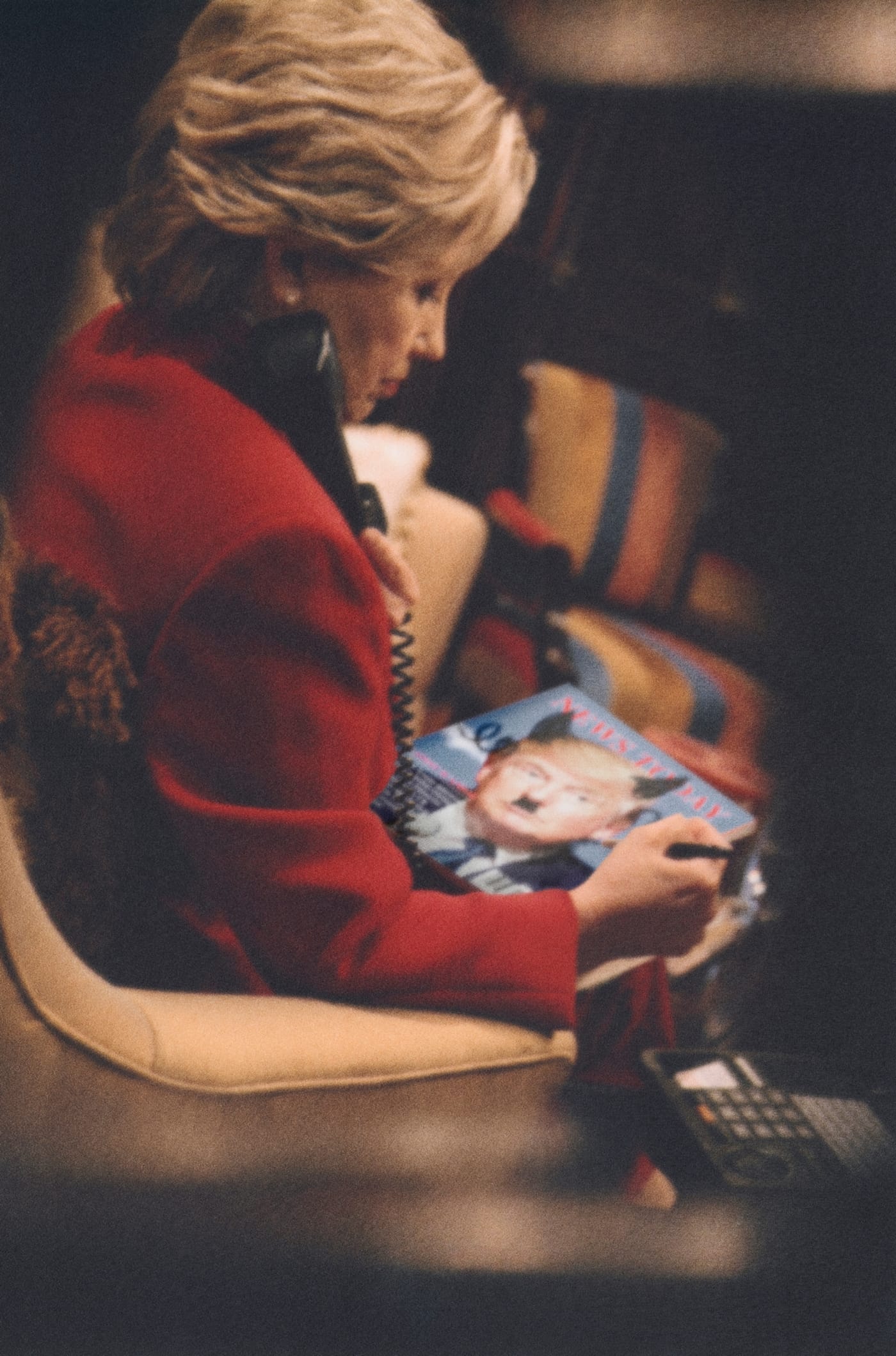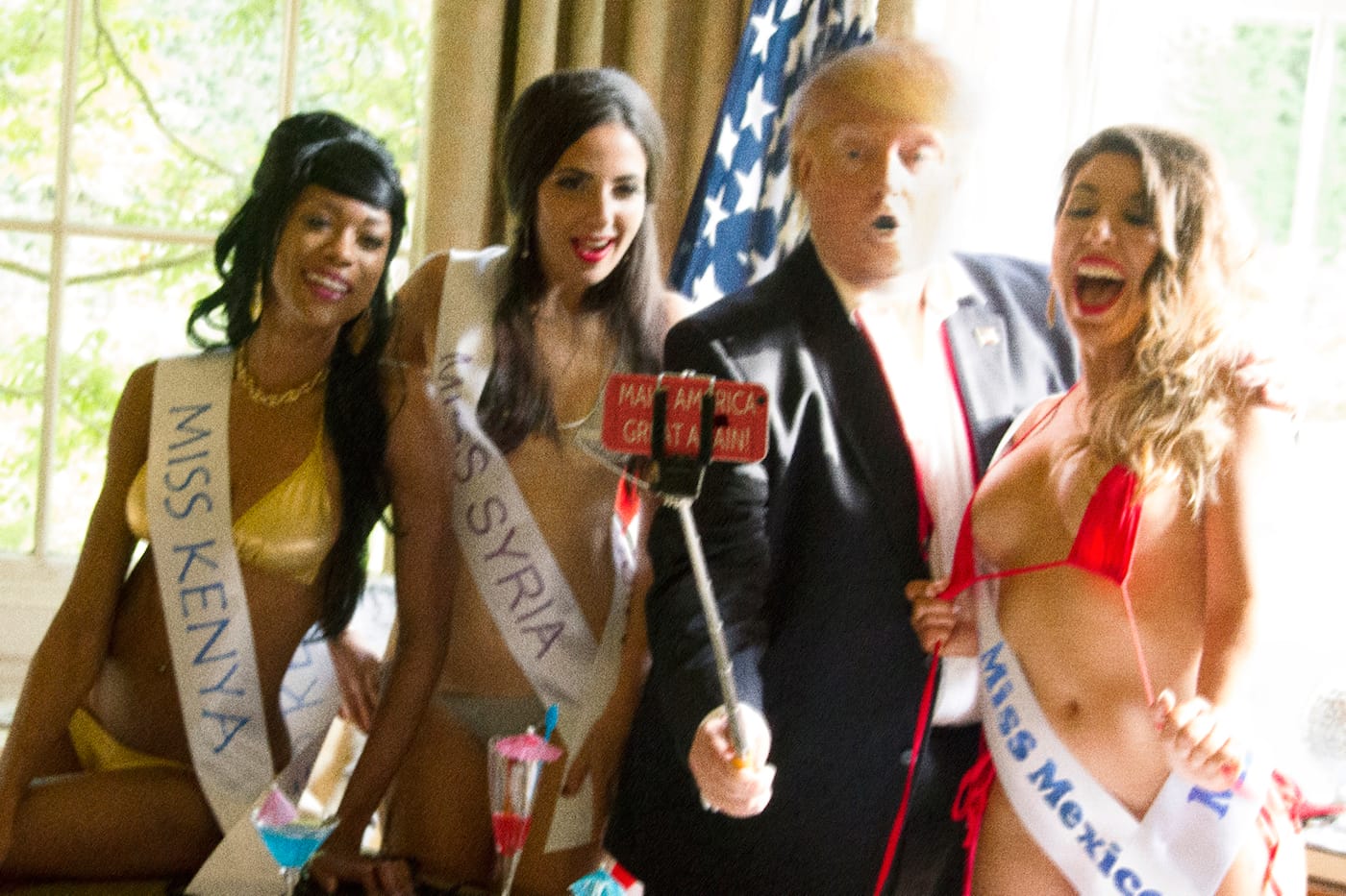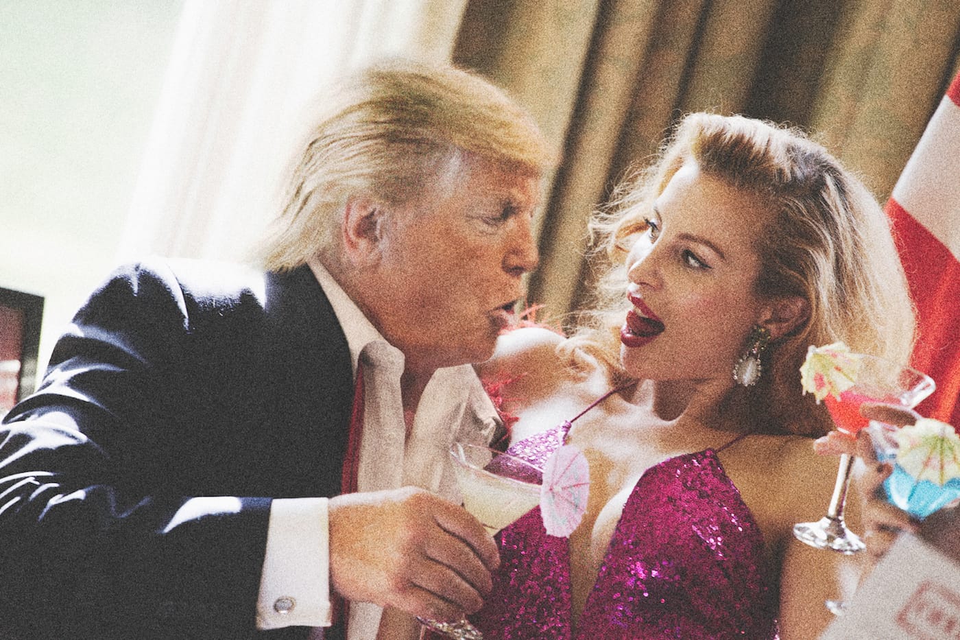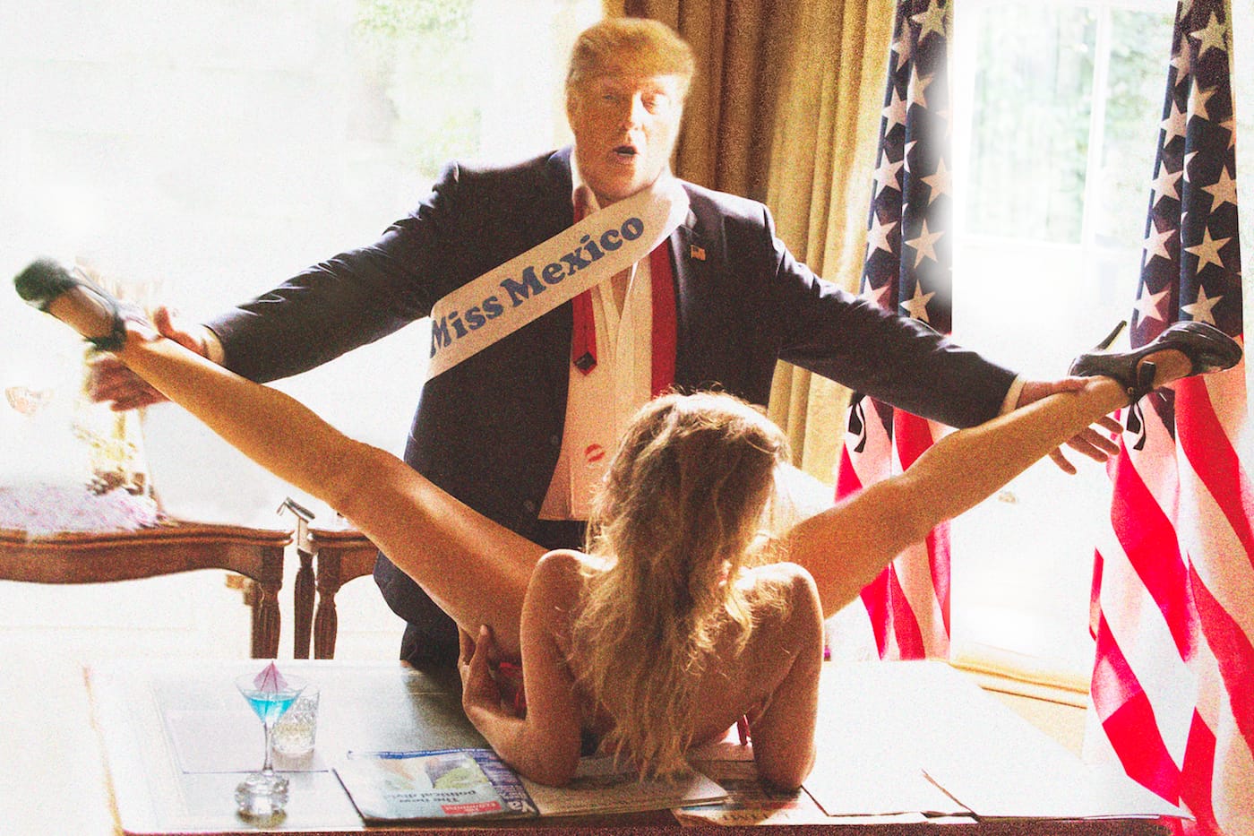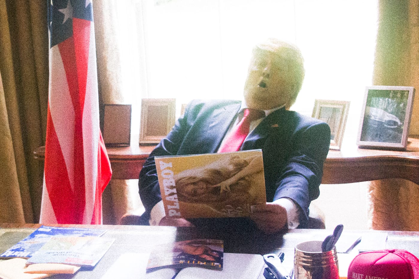 Jackson did not share the names of the publishers that were unwilling to print her photographs, but said the mock pictures of Trump were specifically why “they did not want to take that risk.” Her lawyers, too, warned her against publishing the series, which she says is meant to raise questions about how media imagery shapes our understanding of public figures. The paparazzi-style pictures include scenes of a Trump figure posing chummily with members of the Ku Klux Klan and having sex with Miss Universe contestants (although satire, the latter brings to mind the wild scenes described in the unverified report of Trump’s overseas escapades that was leaked by BuzzFeed). Jackson also roasts the Clintons and Obama, although these are much tamer: in one, Hillary doodles a Hitler mustache on a magazine cover of Trump, while in another, Barack sneaks a satisfying drag of a cigarette (for shame!).