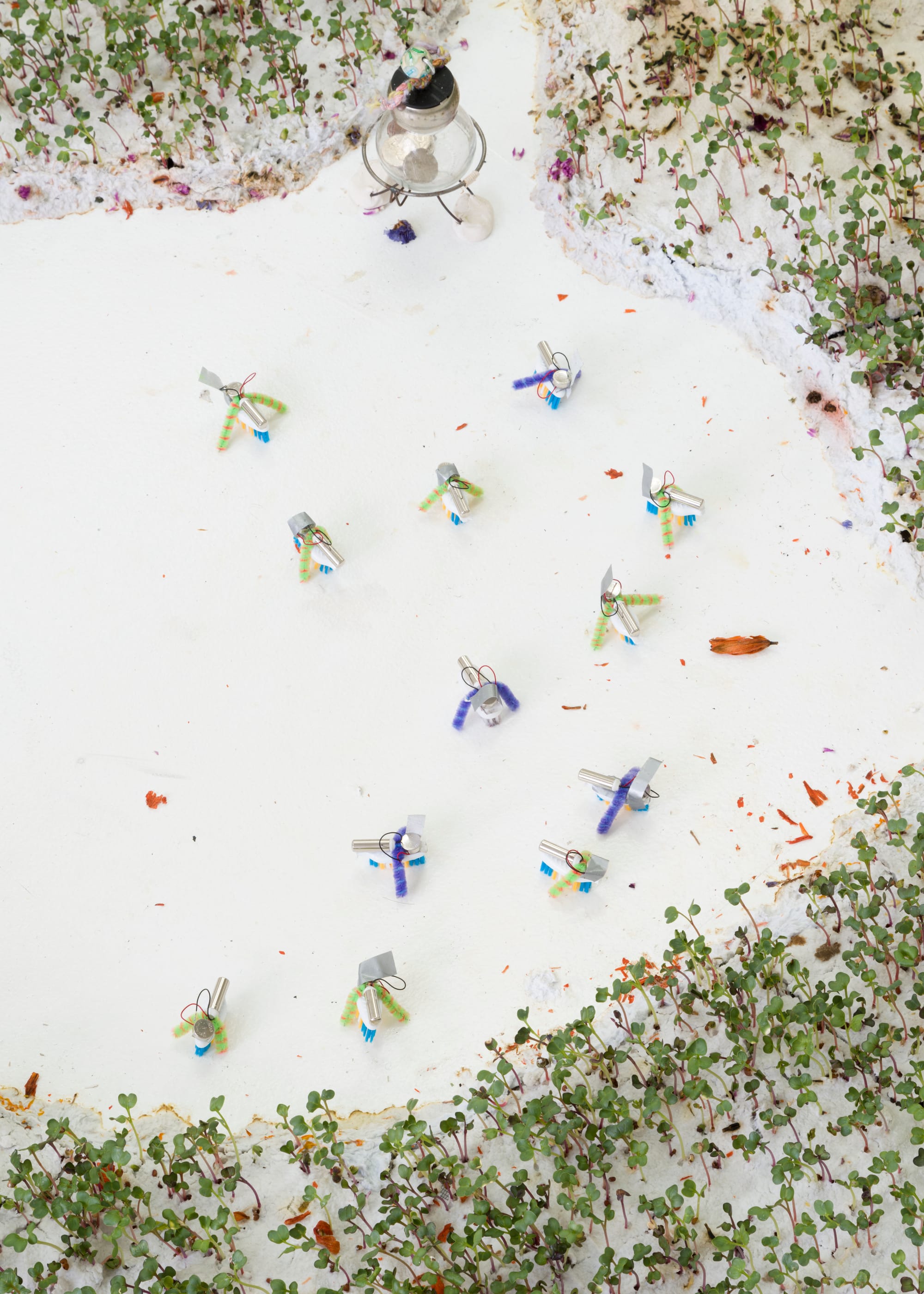 As I traversed Dawning: dust, seeds, Coplees, Seoul-born, New York-based artist Mimi Park’s environmental installation at Lubov, I noticed the gallerist duct taping a fresh battery to one of the two vibrating toothbrush heads — with pipe cleaner accents, they resembled fishing flies — that roamed a small clearing. “Coplee Swarm” (2022) is normally more populous but today battery death had thinned the herd, the gallerist explained as the creatures executed a haphazard pas de deux. While he brandished a pressurized mister at the rainbow radish sprouts that, over the course of the exhibition, had grown to carpet the paper pulp snaking along the floor, I asked him whether a spherical terrarium atop a plaster pedestal, “Coplee Signal Transmitter Tower” (2022), was intended to be kinetic, noting the battery pack dangling from its side. “Motor's broken,” he confirmed.