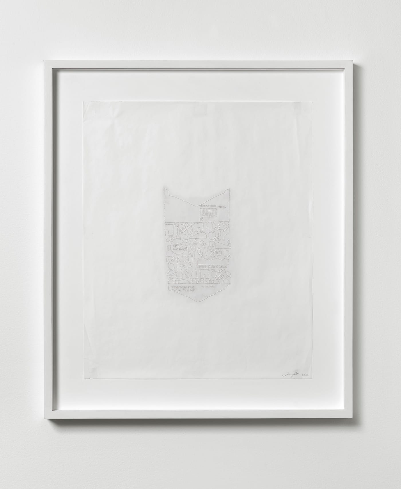 In the case of her objects — which will be the subject of a future essay — Ginzel does a variety of things. What the two bodies of work have in common is scale and means: these are easily portable works made with non-artistic means. Their identity as disposable, ephemeral things is obliquely mirrored by the use of stitching, which is to say a non-studio activity that can be done anywhere. The stitches become raised lines consisting of innumerable small sections (or points): it is a way of drawing on a found surface, as well as a palpable record of time melded to a short-lived, non-reusable item. She has made frottages from the raised line by placing a sheet of paper over an embroidered work and going over it with pencil.