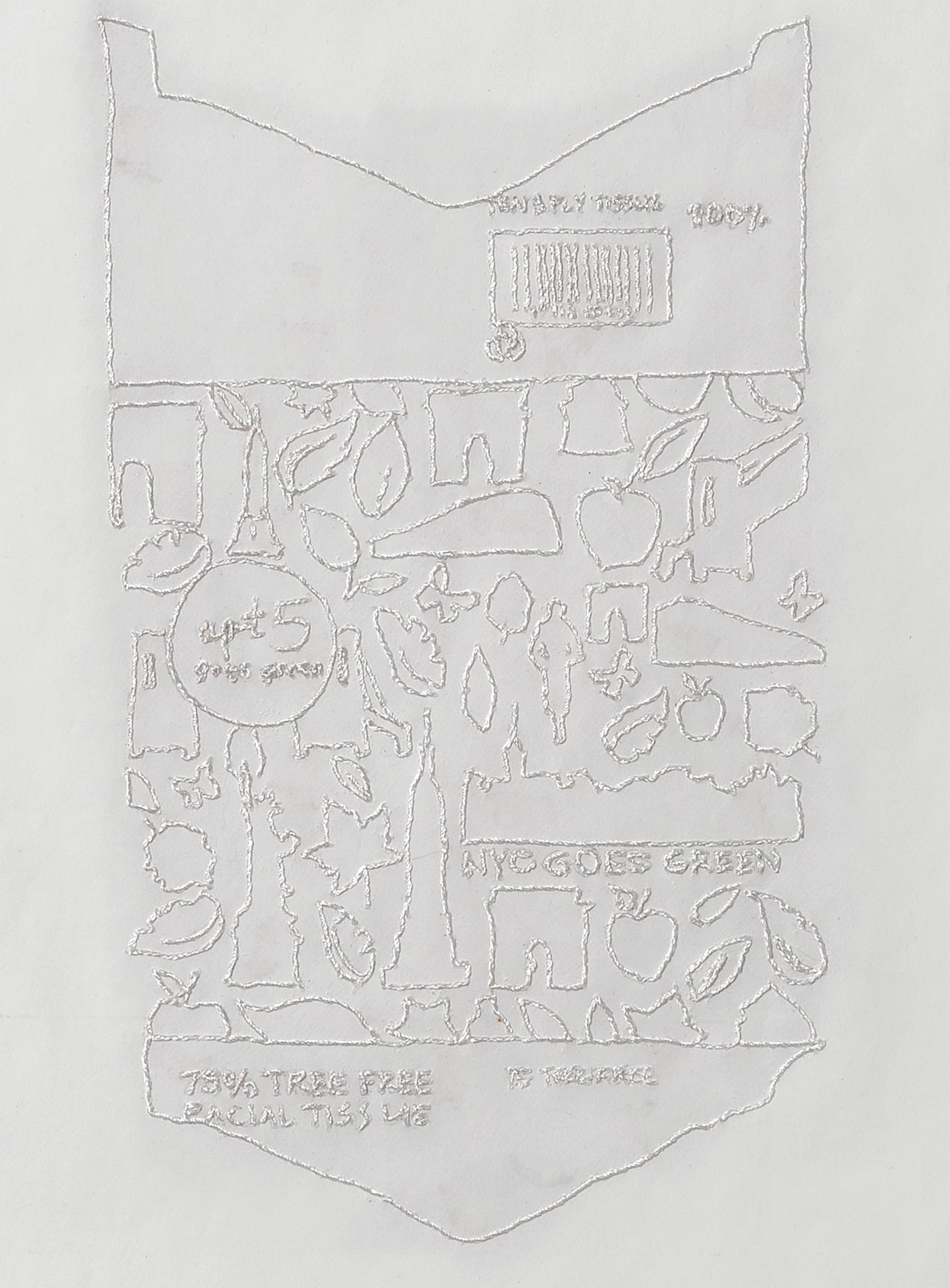 Embroidery is central to “Ephemeral Fragment: NYC Goes Green” (2012). In this work, she traces the shape of a tissue wrapper, plus the words and images printed on its surface, onto a sheet of translucent paper, which she subsequently backed with fabric. The lines become a template for guiding the stitches. “Ephemeral Fragment: NYC Goes Green” transforms the shape and lettering of a tissue package into a hieroglyphic relief, a threaded drawing, and a sculptural object. The disposable container of flimsy, throwaway objects (tissues) has been transformed into something that is durable, delicate, and non-disposable, destined to be used and thrown away. While the stitching would seem to situate Ginzel’s the art within woman’s work and domesticity, I cannot help but think that the choice of a tissue package comments on the way society frames women and the idea of beauty in terms of usefulness and disposability: They too are both to be used and tossed aside.