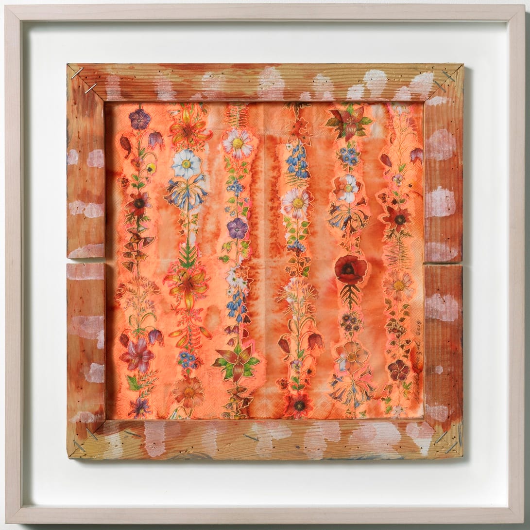 About his choice of flags and targets as subjects, Jasper Johns famously said: “[they] were both things — which are seen and not looked at — examined.” Nicola Ginzel – who has used a flimsy, two-ply paper napkin printed with flowers as the substrate for one of her pieces – would likely concur with Johns on this point: she too uses things most of us have not stopped and examined. The difference is that many of the found objects she incorporates into her work possess a short shelf life. Their sole purpose is to be expendable.