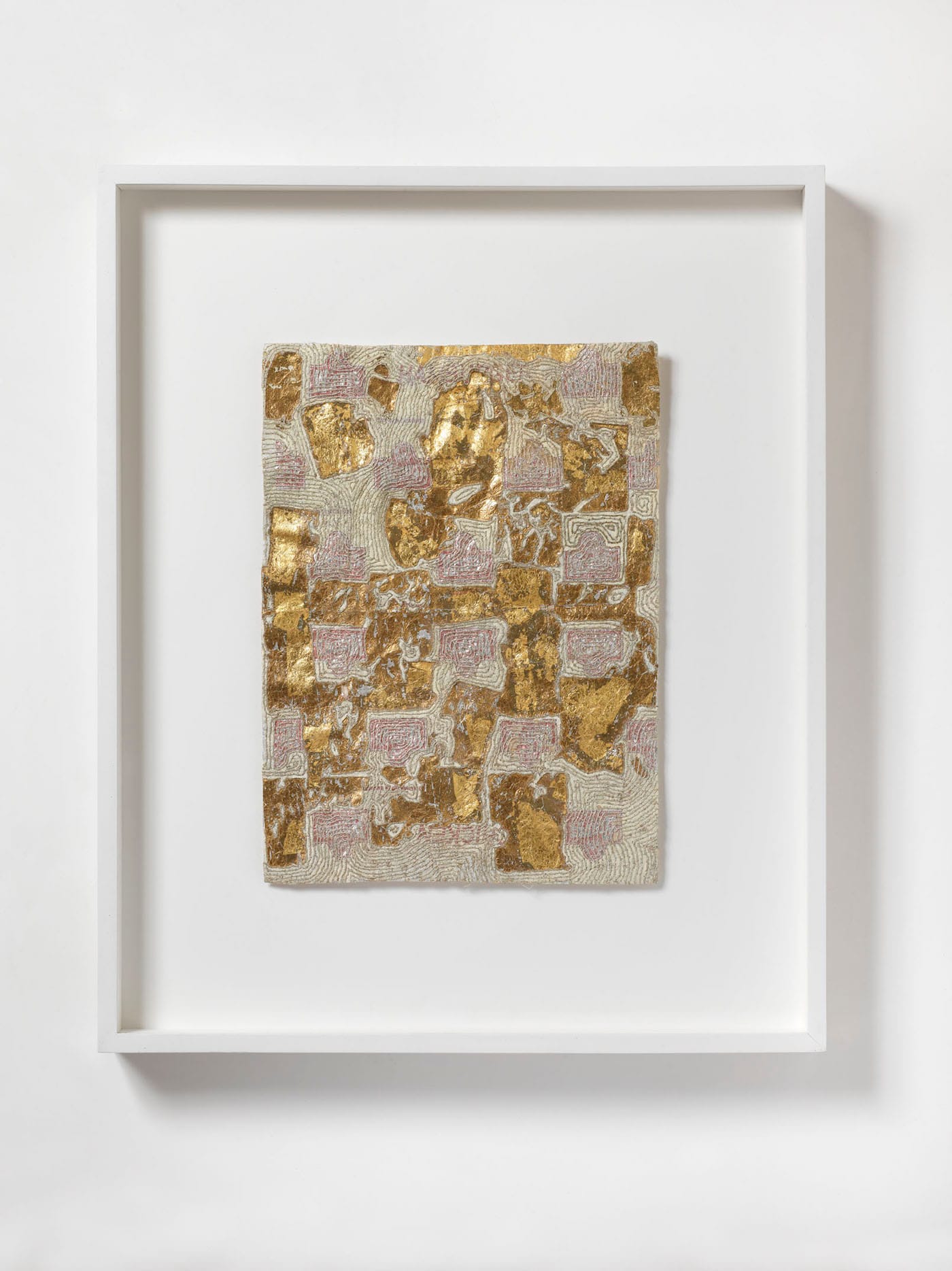While Ginzel’s choice of found materials speaks to a society in which disposability at every level is a commonplace, deeply ingrained mechanism, I do not think needless waste is the sole subject of this work, but one of its many concerns. This is because there is an autobiographical current dissolved throughout the work: she chooses her substrates –such as a wrapper from a meal shared with someone — based on the particular meaning they have for her, but then turns that initial set of associations into something devoid of the anecdotal. Using materials such as thread, ink, oil paint, graphite, and gold leaf, Ginzel transforms her superfluous things into talismans.