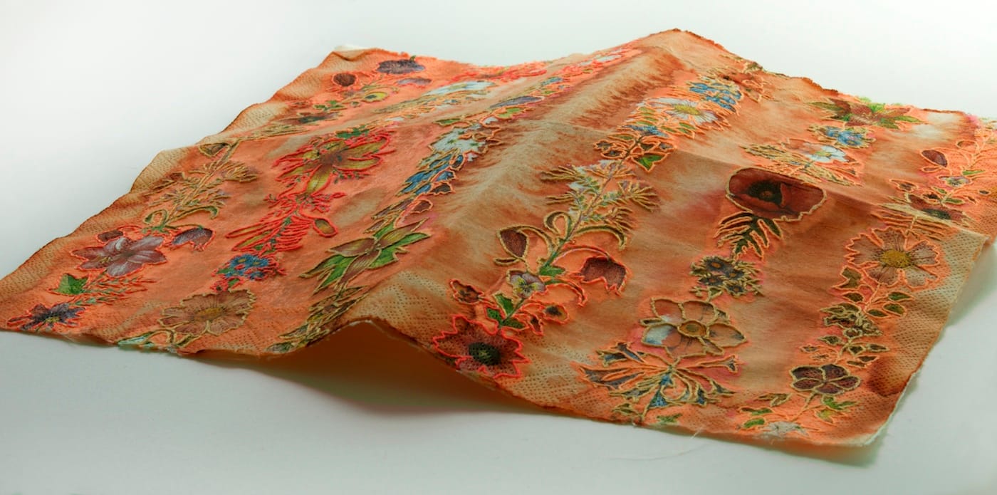 In “Fluorescent Fragment,” Ginzel has unfolded the two-ply napkin into a square. After separating its two layers into separate sheets, she spread BEVA archival backing on one and rejoined them. This made the napkin stiff and more durable. She used two kinds of ink to stain and draw on the napkin, turning its white surface into different hues of salmon pink and shifting the graphic contrast between the floral print and its surrounding field into a relationship of color and tone. Fluorescent orange thread demarcates some but not all of the flowers. The fluorescent color and staining technique seem to suggest industrial poisoning or a heightened state of consciousness without announcing it.