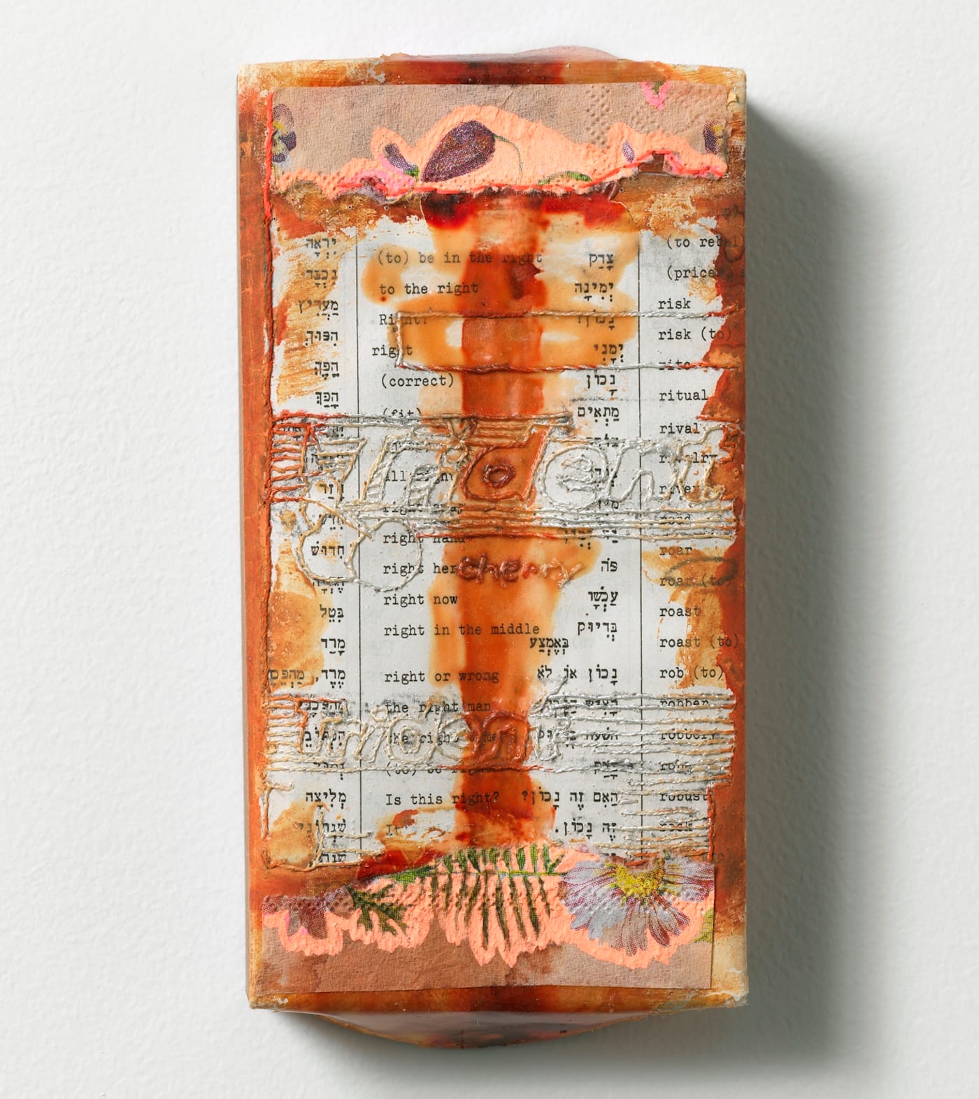The word “Trident,” derived from a gum wrapper, has been stitched across the surface twice, evoking the weapon wielded by the gods Poseidon (Greek) and Neptune (Roman). The Greeks believed Poseidon was the god of the sea, while the Romans believed Neptune was the god of lakes as well. Below the top iteration of the word “Trident,” we notice another stitched word, “cherry,” set into the middle of the page. Torn and frayed pieces of a floral-print napkin are pasted to the top and bottom of the tablet, with a vertical spill of wood glue connecting them. From the bottom of the amber-colored, trunk-like column of glue, thin green leaves shooting down into the soil can be read as roots. Has the trident been turned into a tree?