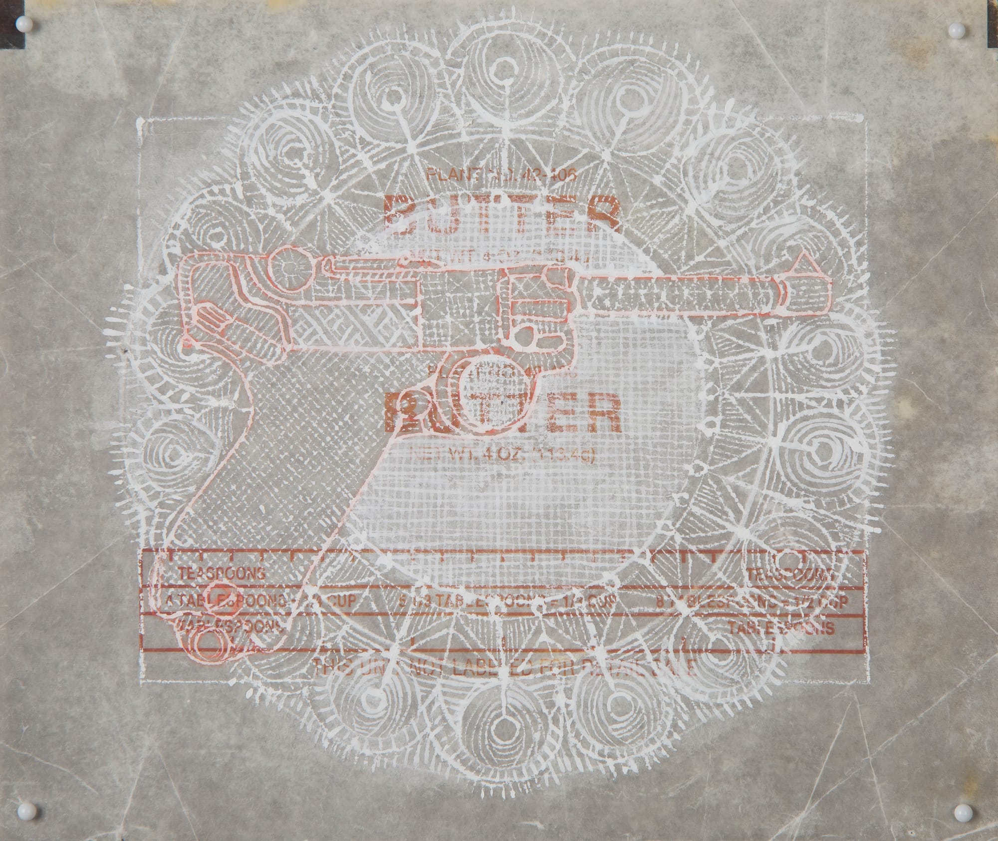With the butter wrappers, the lace is again on the warpath. The origin of the conceit lies in the budgetary opposition between guns and butter in classic economics — the tension between spending on domestic programs or spending on war. The lace no longer frames, but embeds images within its patterns. In one of the most overt examples, “Untitled from Guns and Butter #5” (2015), a gun lurks among the threads, its lines nearly Hiberno-Saxon in their abstraction.