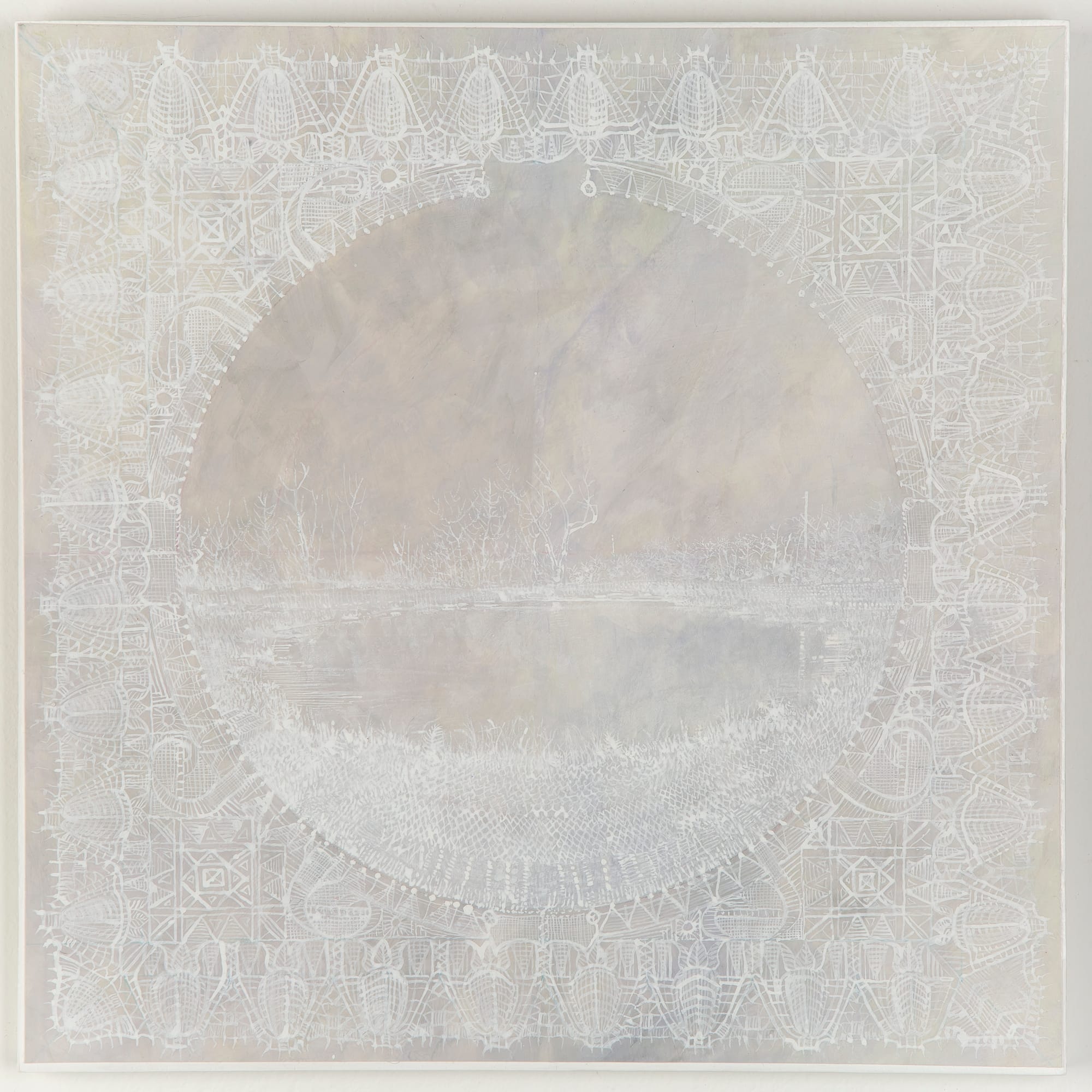 For instance, a group of works painted with white on tones of subtly mottled gray portray what appear to be small ponds, lined with grasses and trees, set into lace frames. The ponds turn out to be craters caused by the detonation of massive mines during the first World War. These have since filled with water and been reclaimed by nature — rewoven, if you will, into the landscape. In “Kruisstraat Crater” (2015), the frame creates a circular portal onto the ragged ellipse of the pond, rimmed with trees on the far side and grass on the near. The lace borders the scene, but refuses to obey its bounds, creeping into the image, turning the grass around the pond into knots and fine mesh. The leafless branches of trees, innately inescapably lacy, push into the sky. The transformation feels not necessarily like healing, but — especially given the visual affinity between frost and lace — an icing over of the painful past.