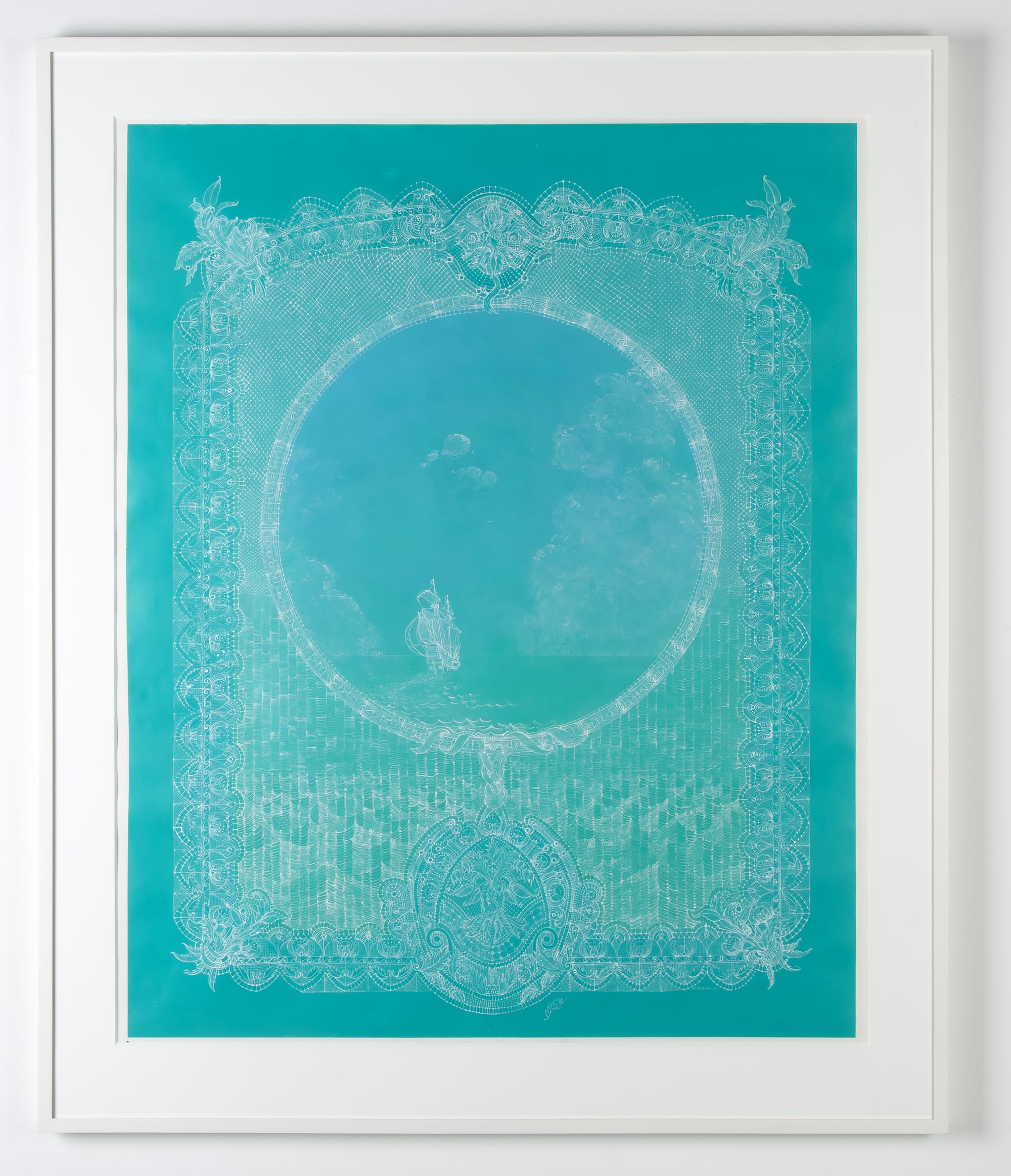Another series reprises the lace frame around the ponds, but the interior image is now a three-masted Dutch ship at sea. The gray backgrounds of the crater series are replaced by an assortment of well-calculated colors that give their names to the paintings. For instance, “Turquoise Maritime” (2018) is painted a mottled green and blue, the hues organized beneath the image, with the bluer parts in the sky, the greener in the sea. The lace frame is primarily floral, but the middle register is deftly constructed to look like peaking waves, the reflection of light on the water suggested by tiny grids of paint strung between the threads making up the waves — a pattern within a pattern.