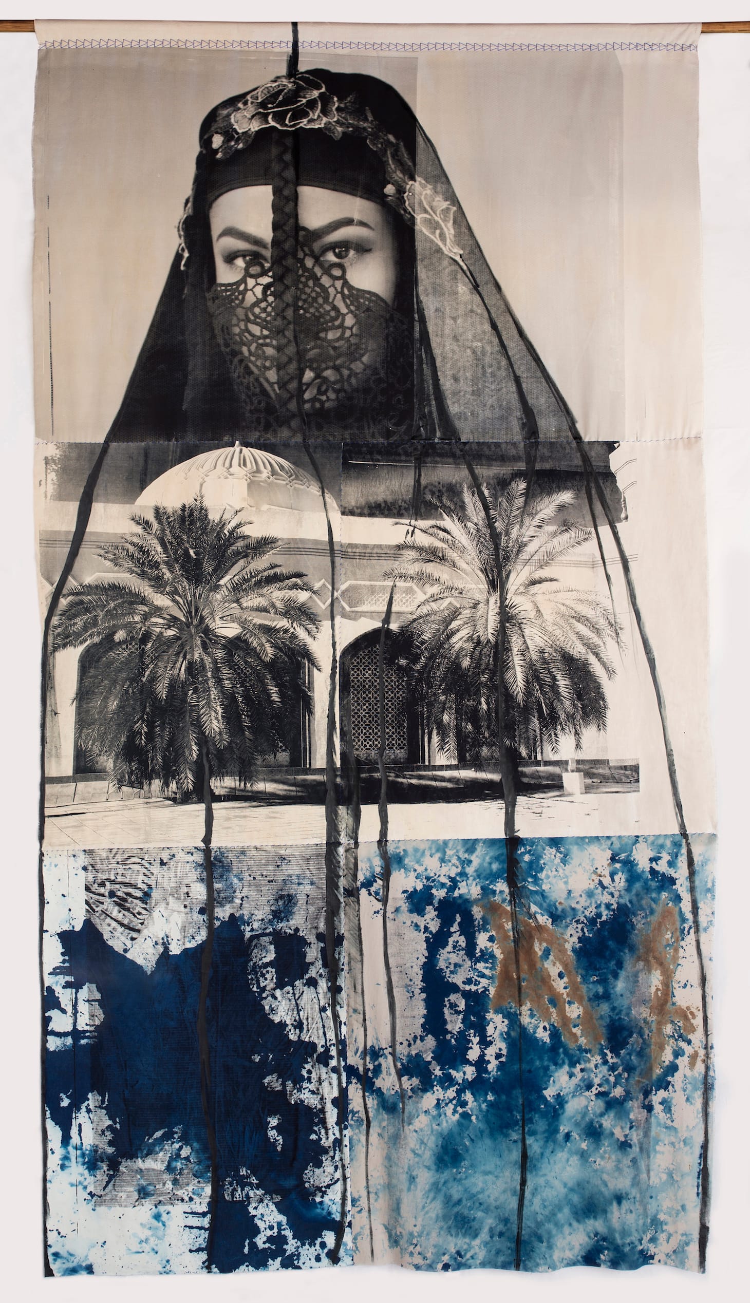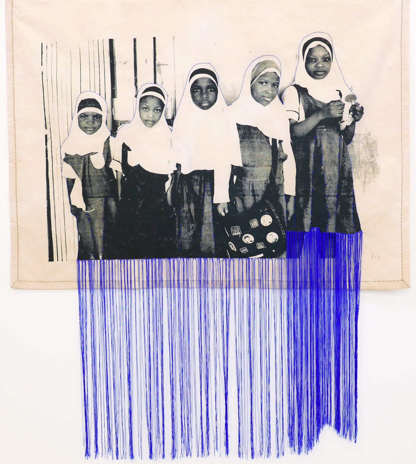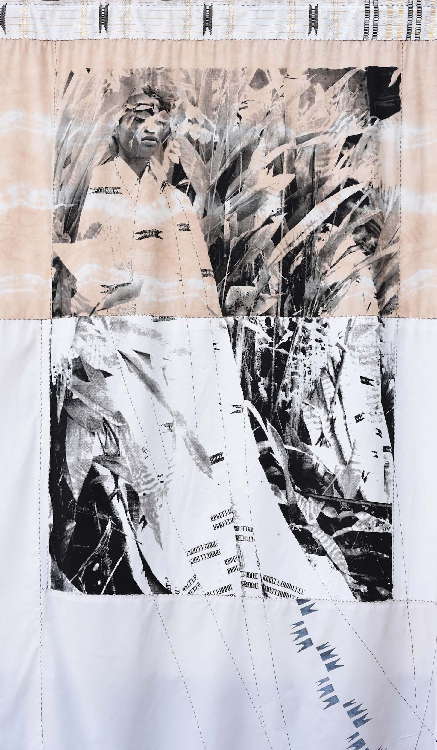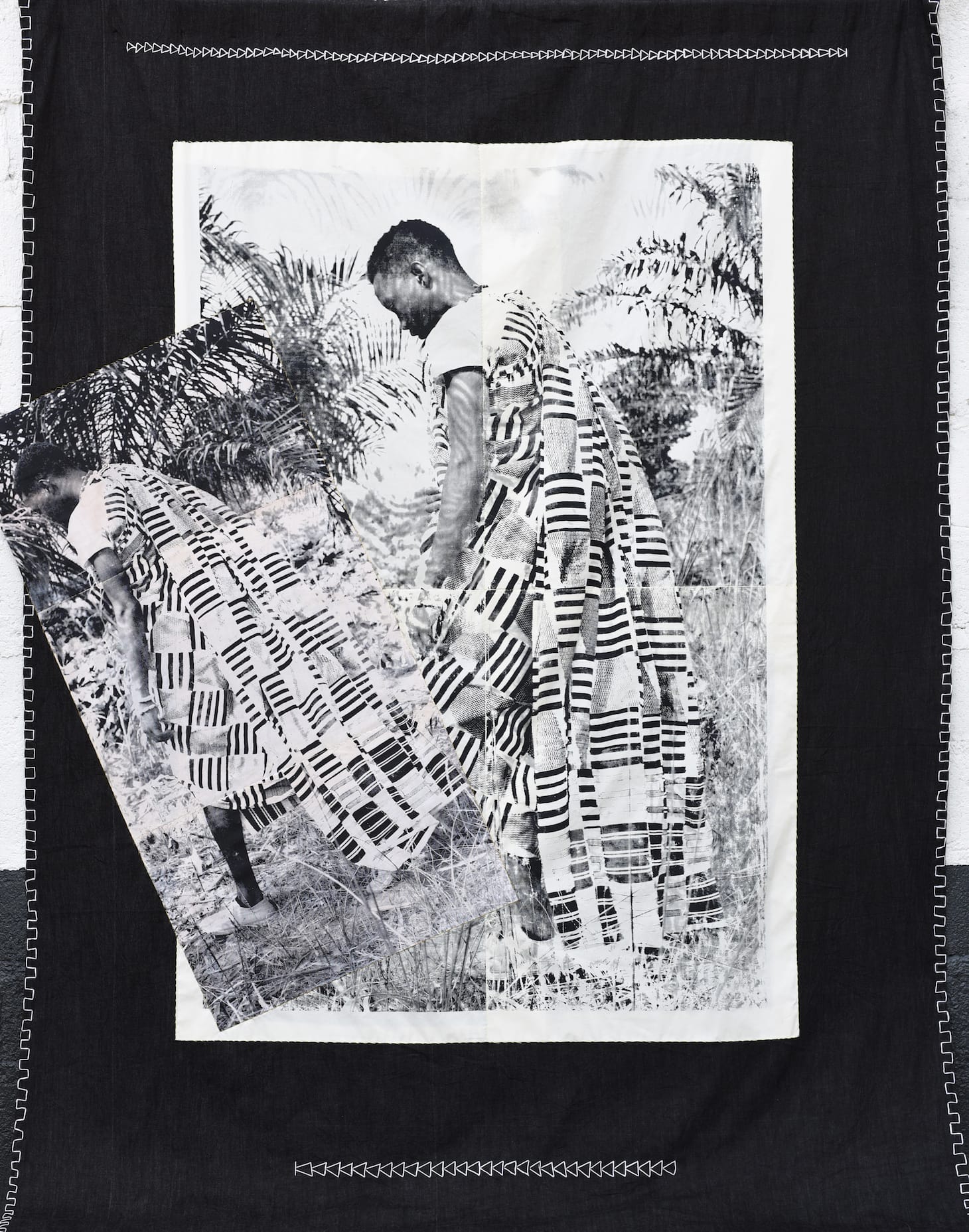 In much of her practice, Opoku prints images directly onto textiles using screenprinting and other print techniques. In an interview with Hyperallergic, she described how her process reflects her works’ symbolism: “The material literally absorbs the photographic image, demonstrating how in society material can become imbued with meaning, memories, and histories over time.”
