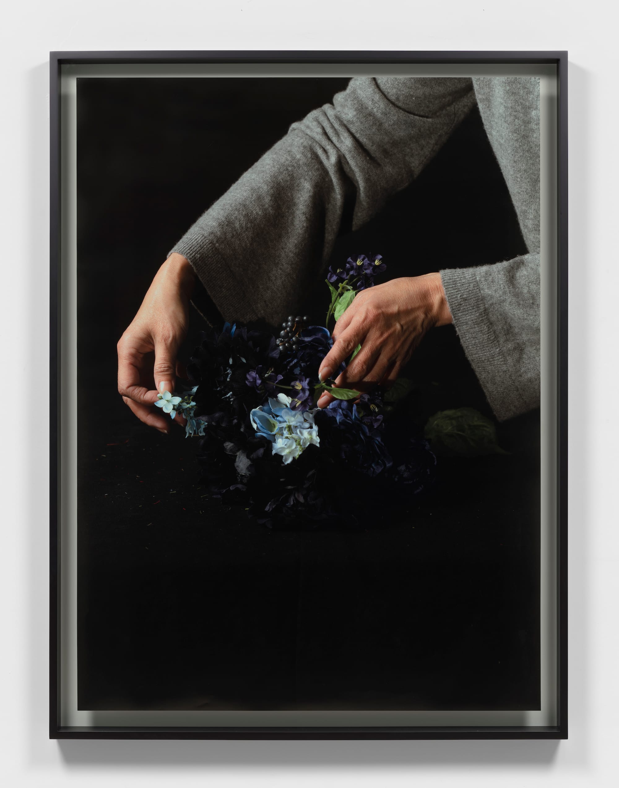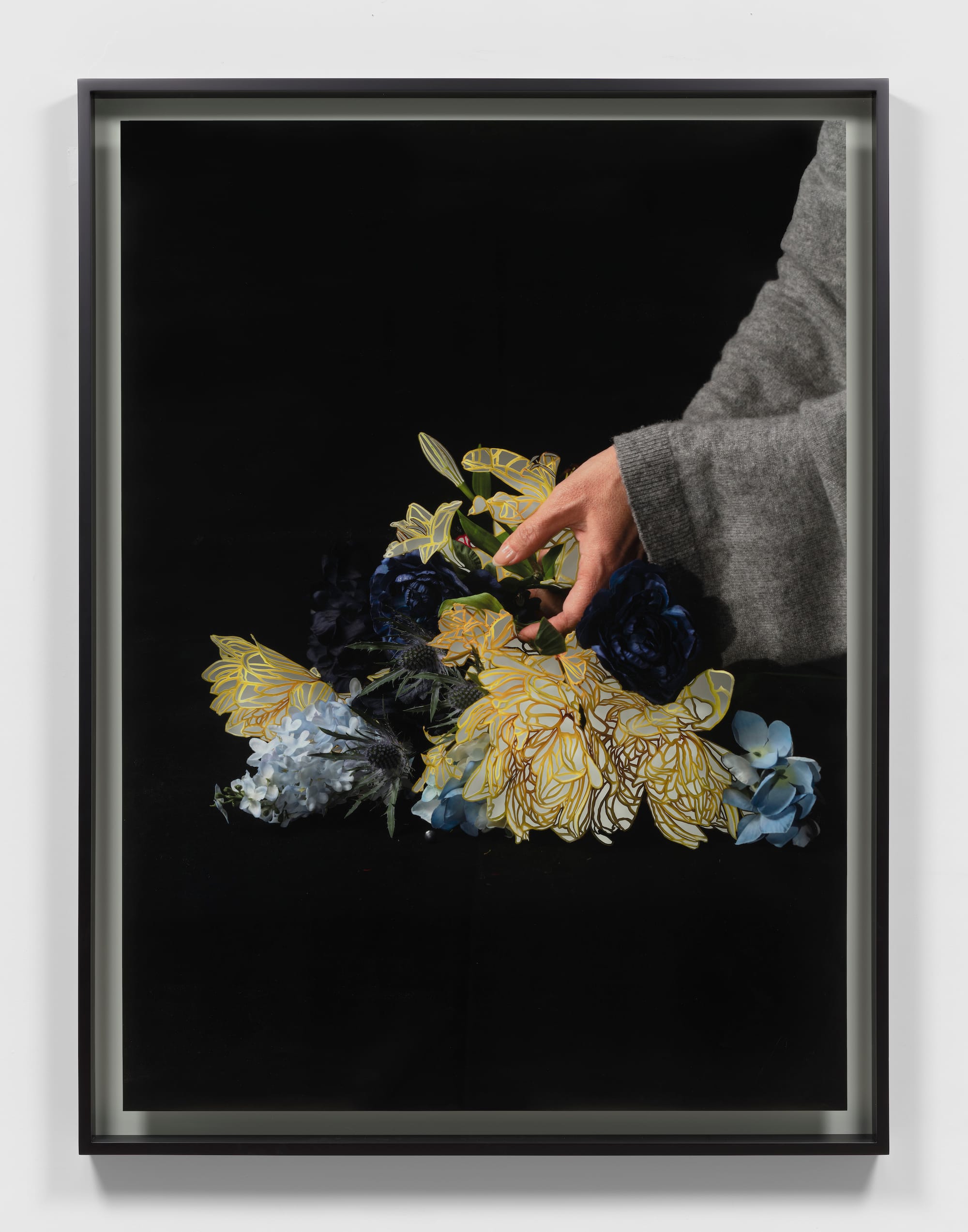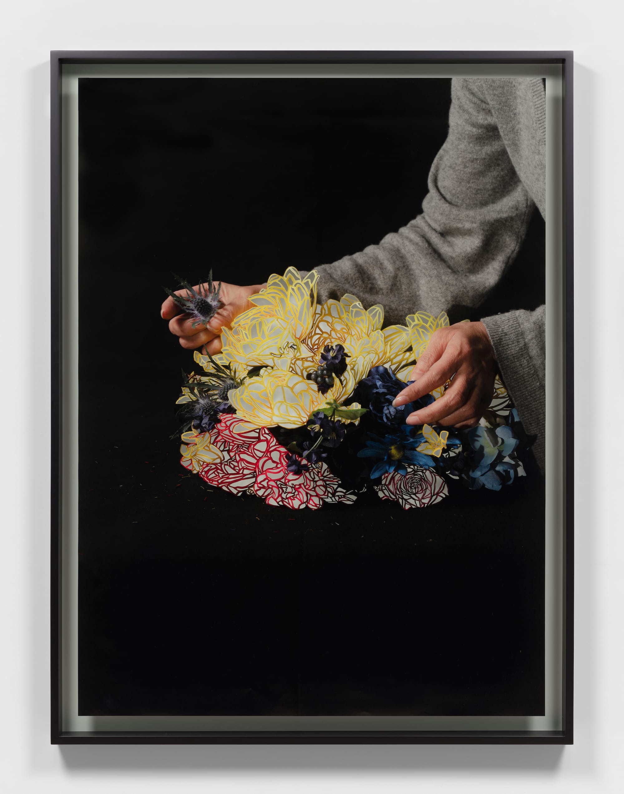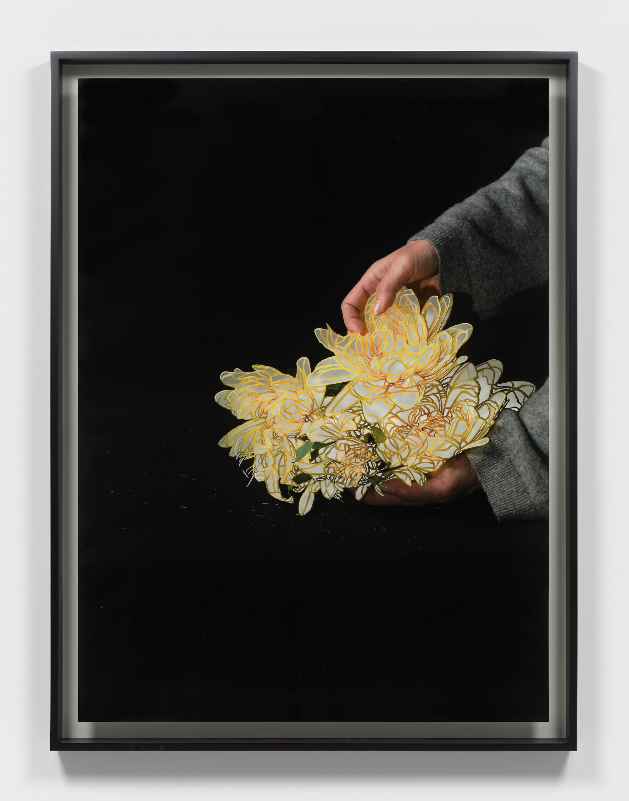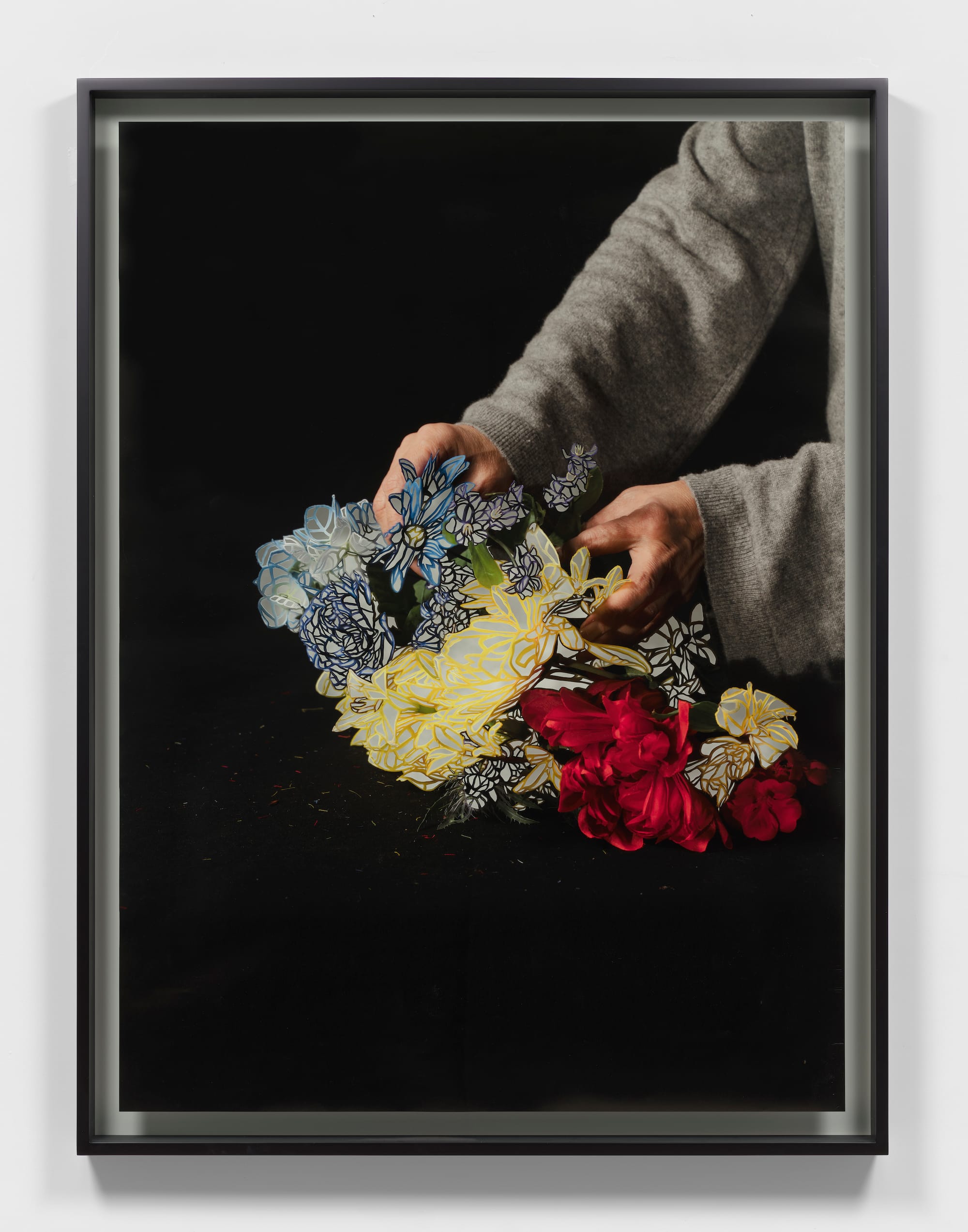 The stark black backgrounds, dramatic lighting, and larger-than-life scale of the photographs enhance the work’s sense of intimacy and isolation. Kim uses both real and artificial flowers in these photographs, drawing attention to the fact that the real flowers will wilt, while the artificial ones will remain in their static state. Tiny fragments of the artificial flowers can be seen in the photos, a record of the process of arranging and rearranging them. These photographs cannot be reprinted — they are one of a kind and bear slight scars from where their surfaces were pressed upon or turned as Kim cut into the image. The artist’s hands are literally present in each photograph and figuratively present through the arabesque-like cut elements that accentuate the images.