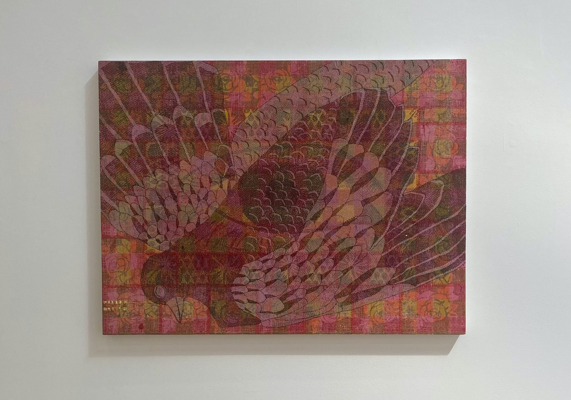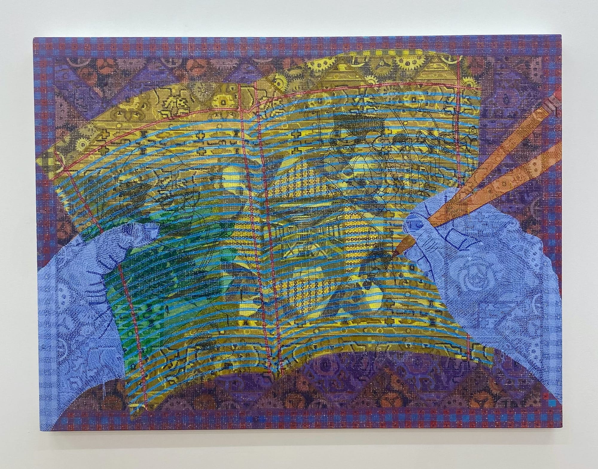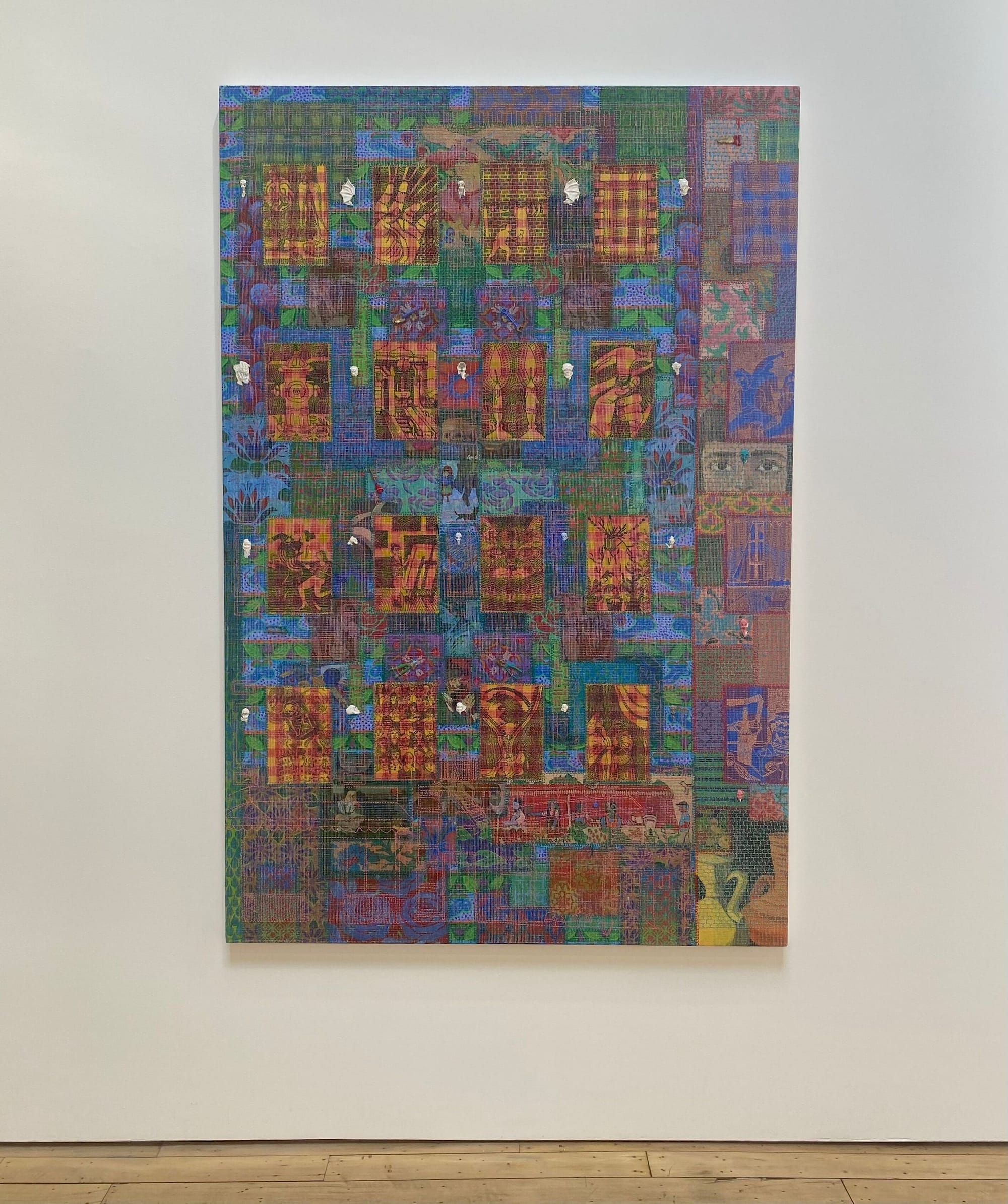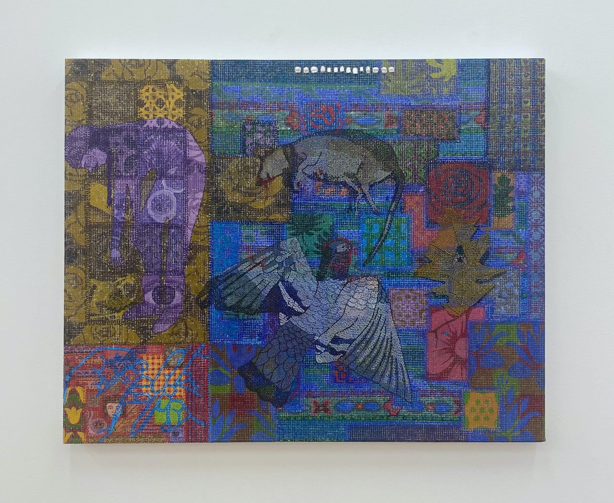 In Schmatta at Rachel Uffner Gallery, Talia Levitt puts a magnifying glass to both the grit and the shared experiences that define New York City. Through layered, sometimes kaleidoscopic paintings, the artist homes in on the everyday people, animals, material culture, and urban infrastructure that are emblematic of the city, but not often celebrated. Her painting method entails applying acrylic with piping bags, stencils, and freehand to create a trompe l’oeil effect and the impression of faux embroidery. Minuscule individual stitches of paint emphasize the works’ patchwork appearance.