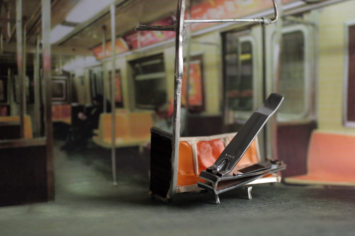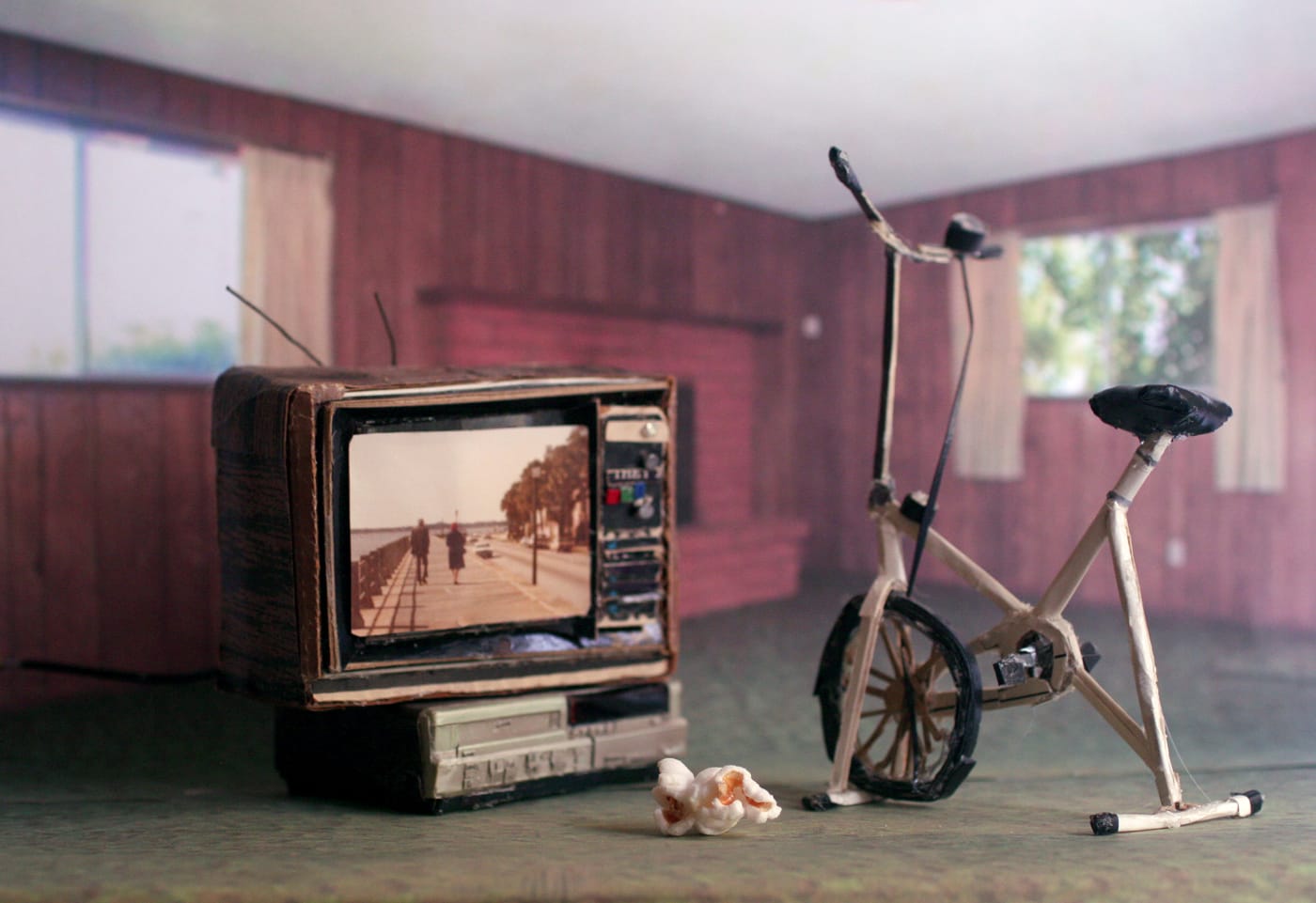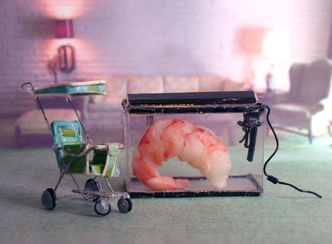 The results are mementos that do not so much mirror their real-world counterparts as deeply evoke a sense of life as it is remembered — a little wonky, a little irregular, very detailed in places but highly abstract in others. Ricci poses and photographs her tiny sculptures in tableaux in which the objects are often out of proportion, giving them the surreal quality of dreams and memory. A tiny aquarium makes tight quarters for a peeled cocktail shrimp. A ramshackle miniature couch struggles to conceal life-sized keys and Cheerios and hairballs. A teensy dishwasher is slowly buried in a drift of life-sized detergent flakes.